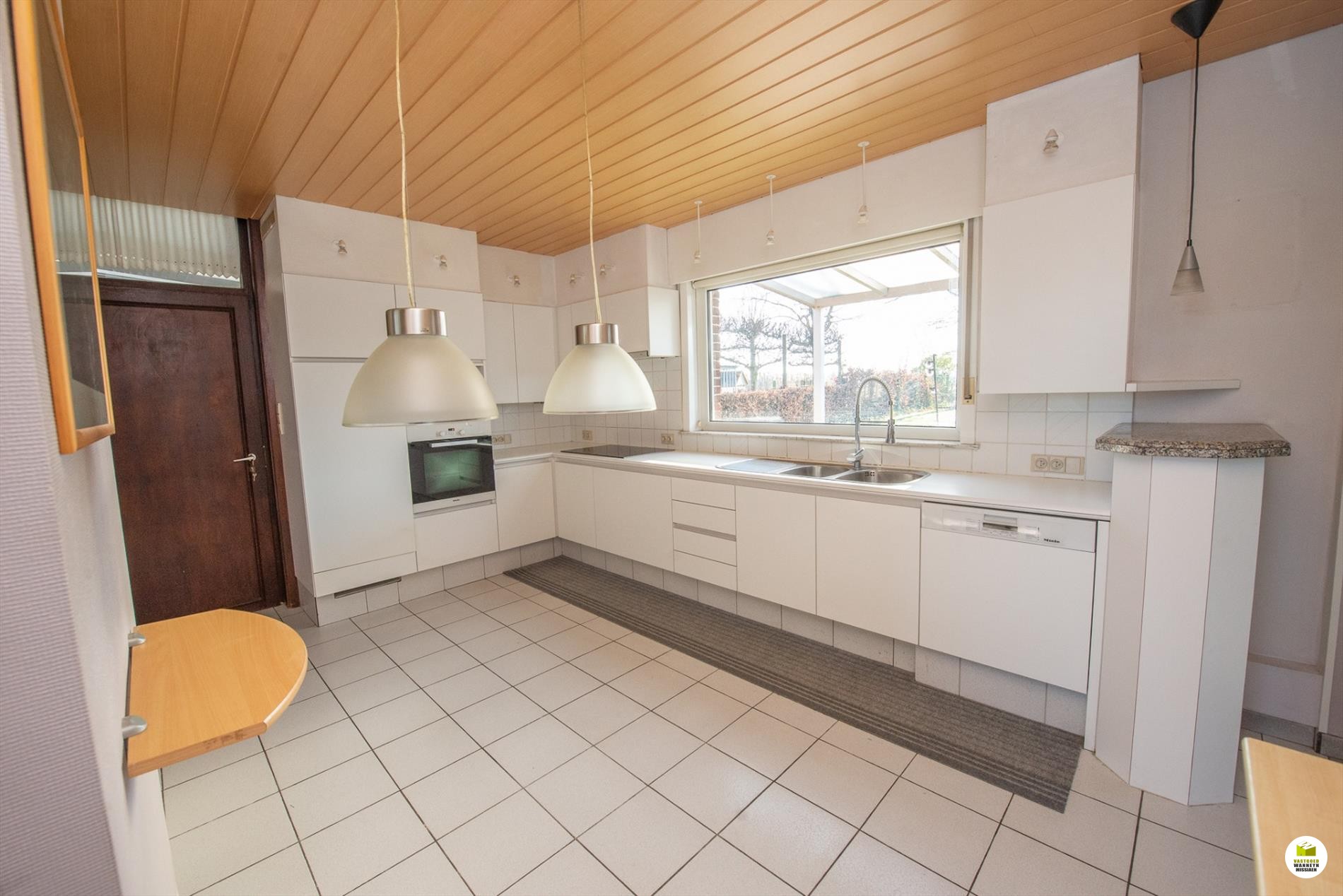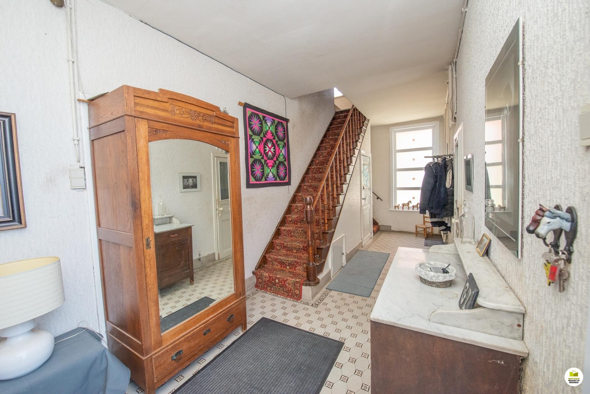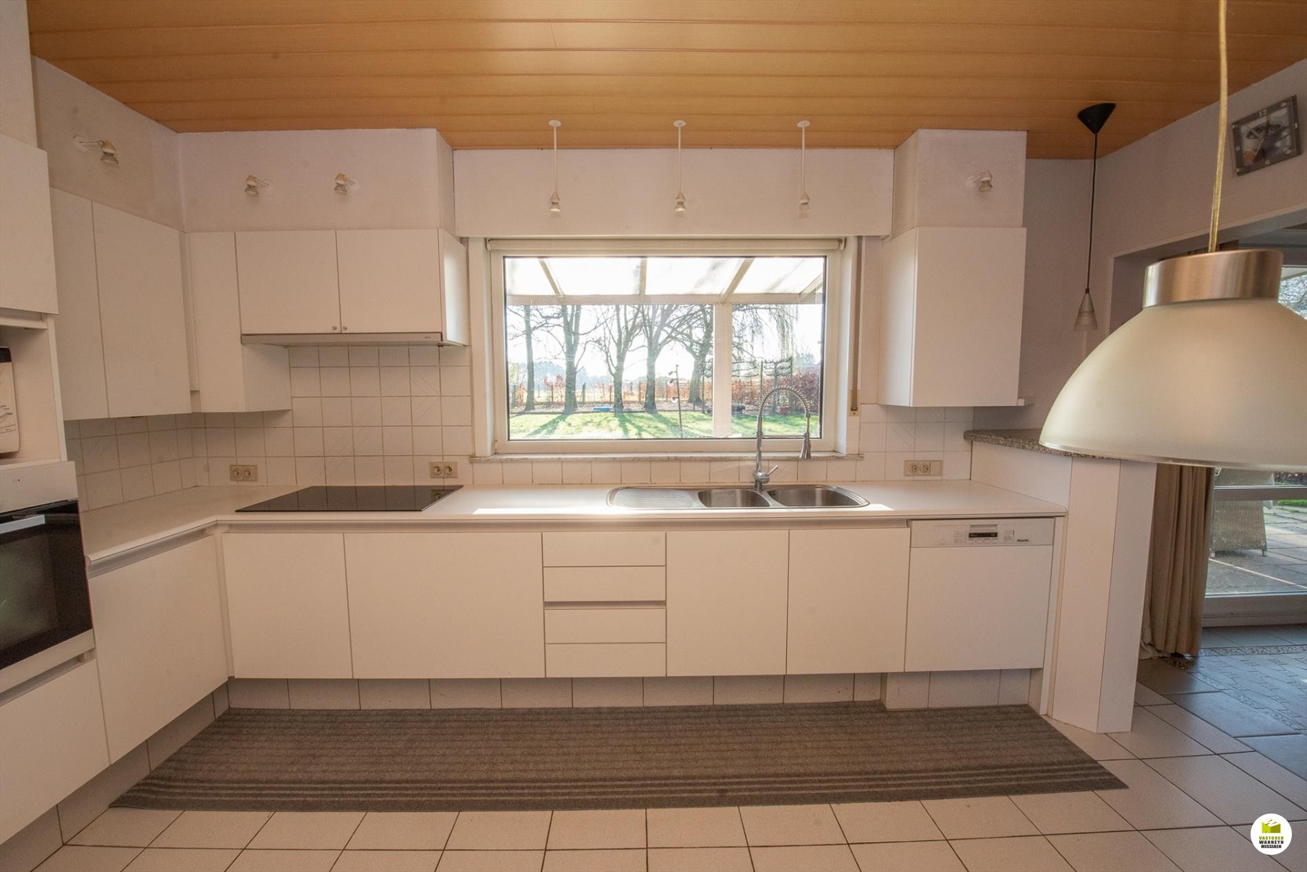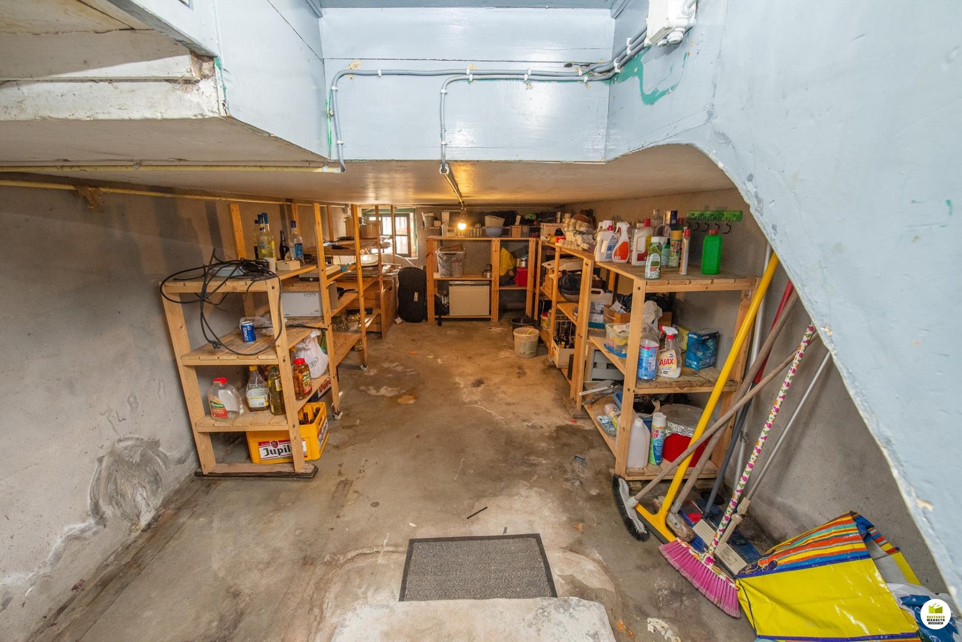 Inkomhal met toilet, meteen rechts de wasplaats en de ... kelder. Links is er een voorplaats, ideaal voor iemand die een praktijkruimte zoekt, de hal is ruim genoeg om een wachtplaats te maken. De voorplaats wordt nu gebruikt als eethoek. De woonkamer is gericht naar de tuin en voorzien van een schouwkanaal. (open haard mogelijk). Met een schuifraam bereiken we de tuin en het overdekt terras. Optimaal lichtinval door goede oriëntatie van het huis/tuin (zuid). De keuken (voorzien van Miele toestellen en inductiekookplaat, nieuwe frigo) kijkt ook uit op de tuin.