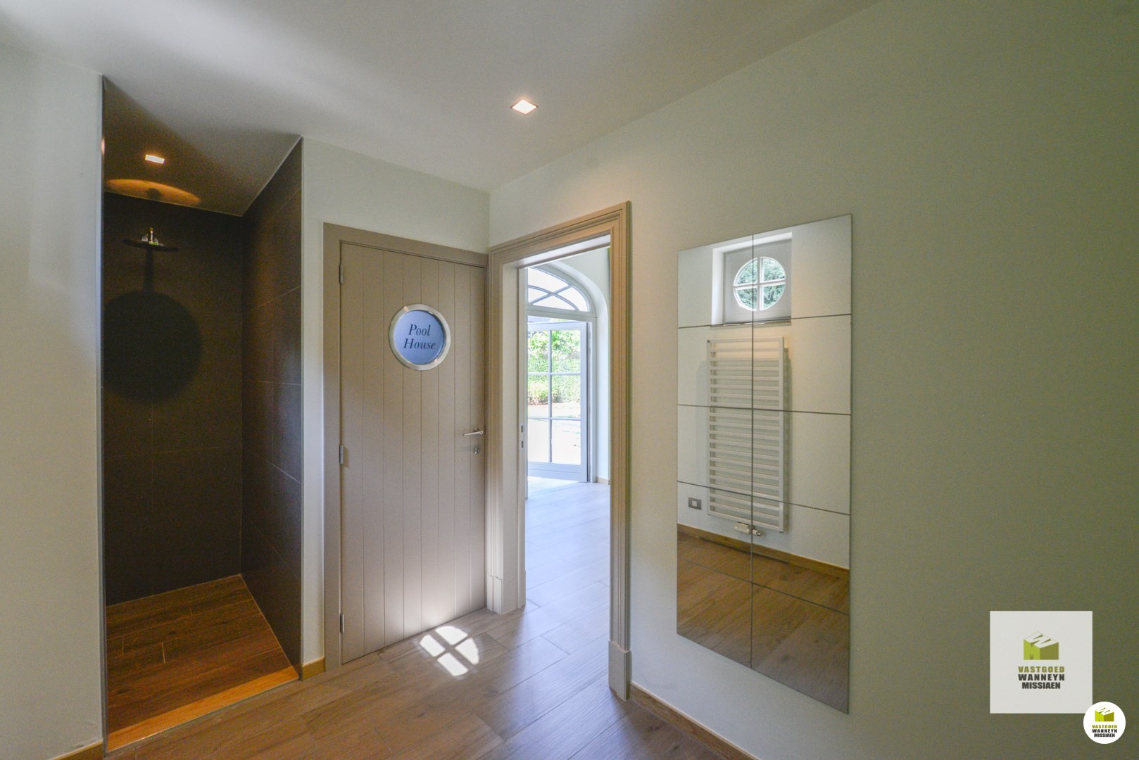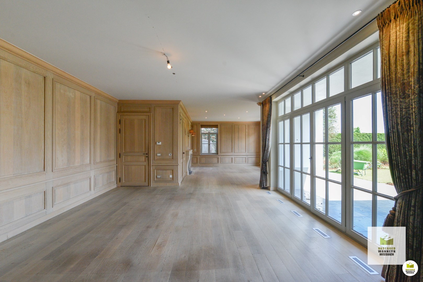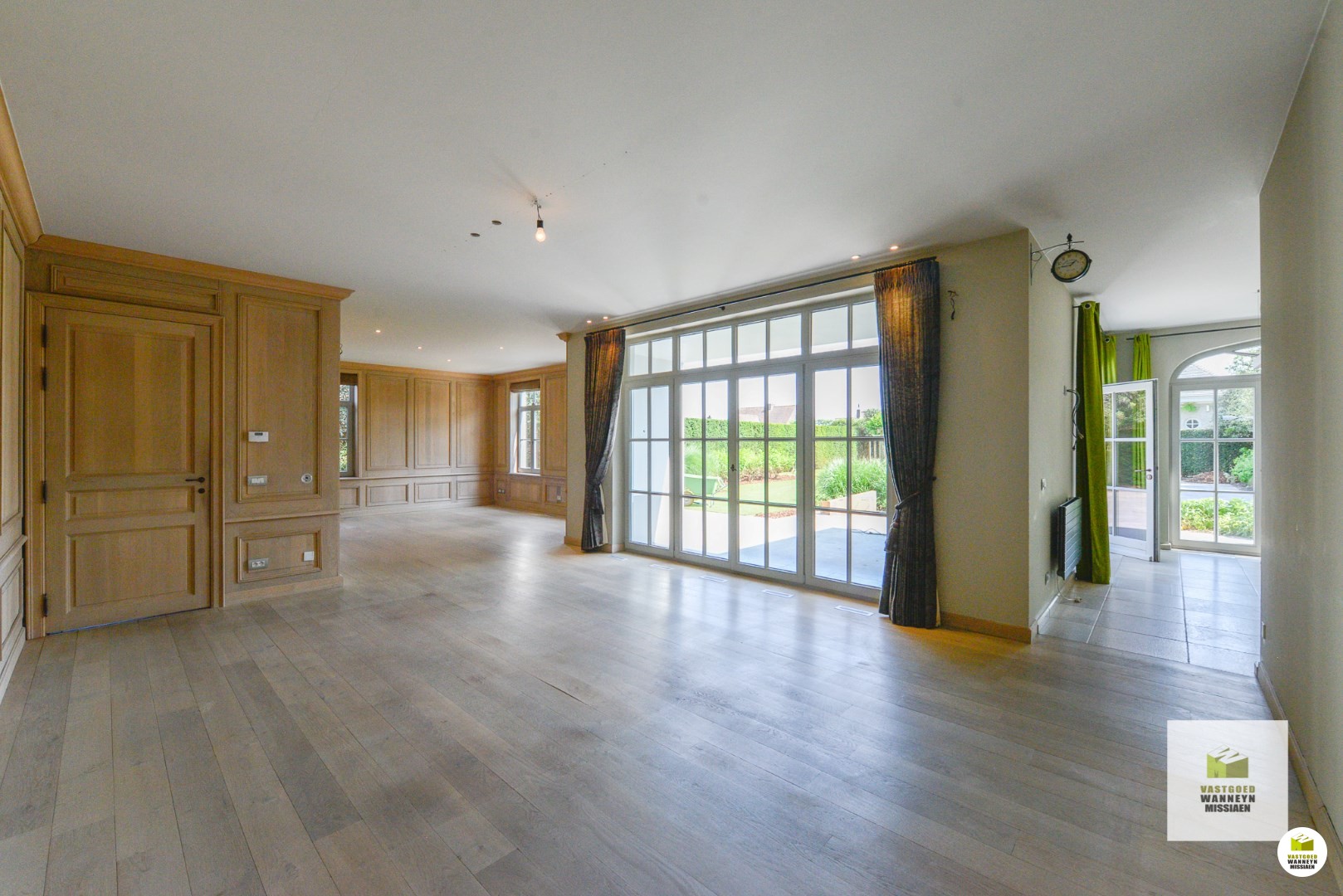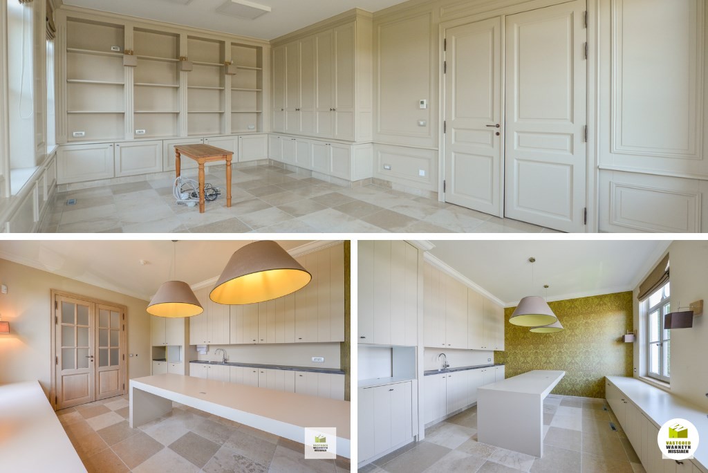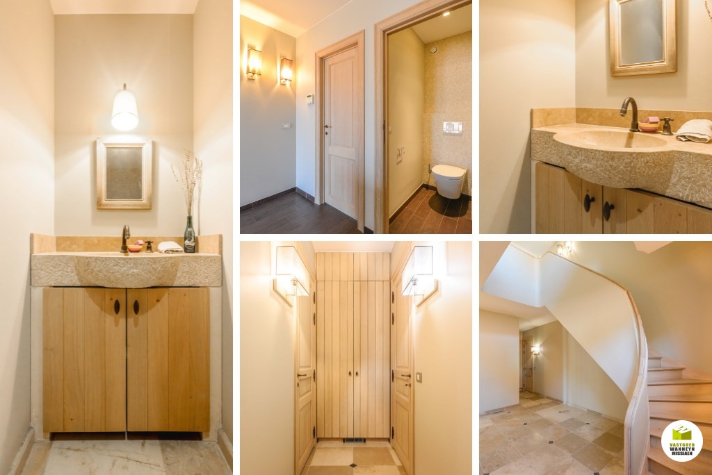 De woonst is bereikbaar aan de zijkant van het huis. Achtereenvolgende indrukwekkende ruimtes, hoge plafonds, grote ramen en veel contact met de tuin en het verwarmd zwembad. Knusse woonkamer met ingebouwd aardgasvuur. De eetplaats heeft toegang naar het deels overdekt terras. De woonkamer meet in totaal 54m2. De keuken is impressionant met de beste toestellen (koken met 7 gasbekkens en meerdere ovens,..) de ruimte meet 25m2. Aansluitend vinden we de wasplaats (11m2) en de garage (42m2) beiden ingericht met veel inbouwkasten en een koelcel. Vanuit de keuken kan je naar de prachtige tuin met verwarmd zwembad en poolhouse, ingericht met kitchenette en toilet.