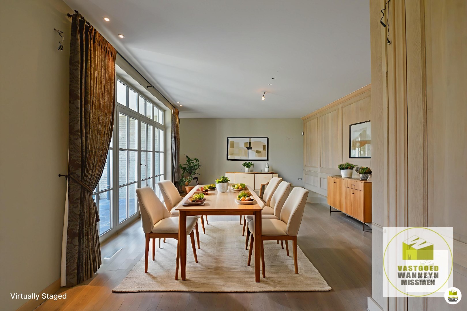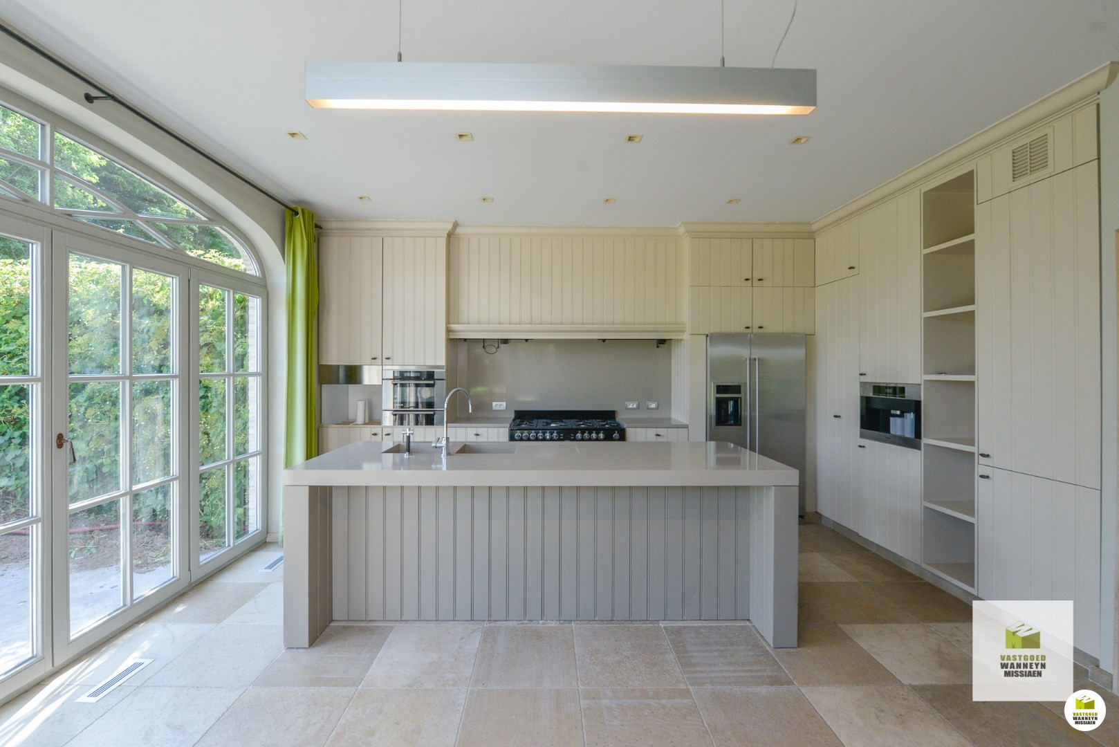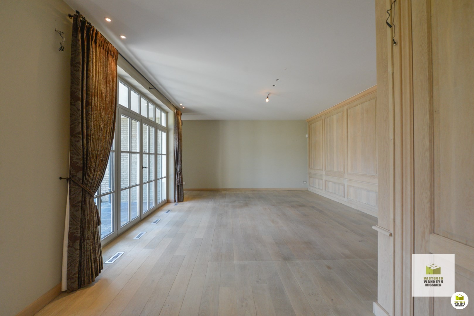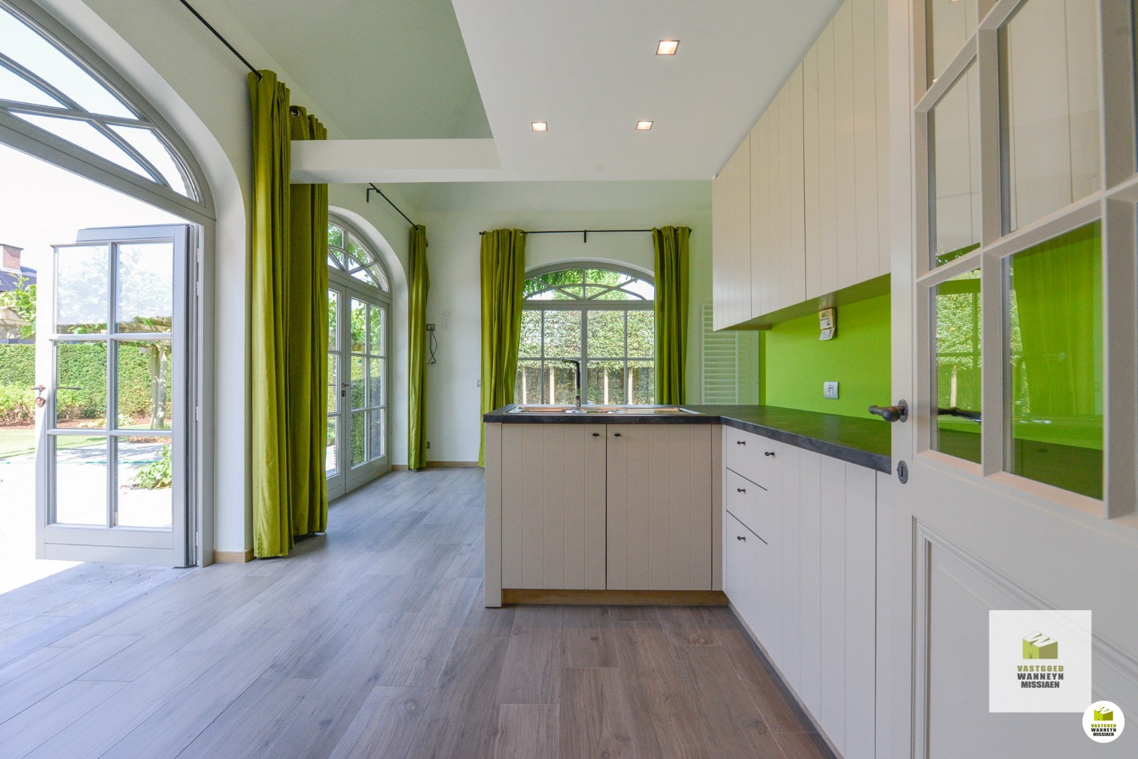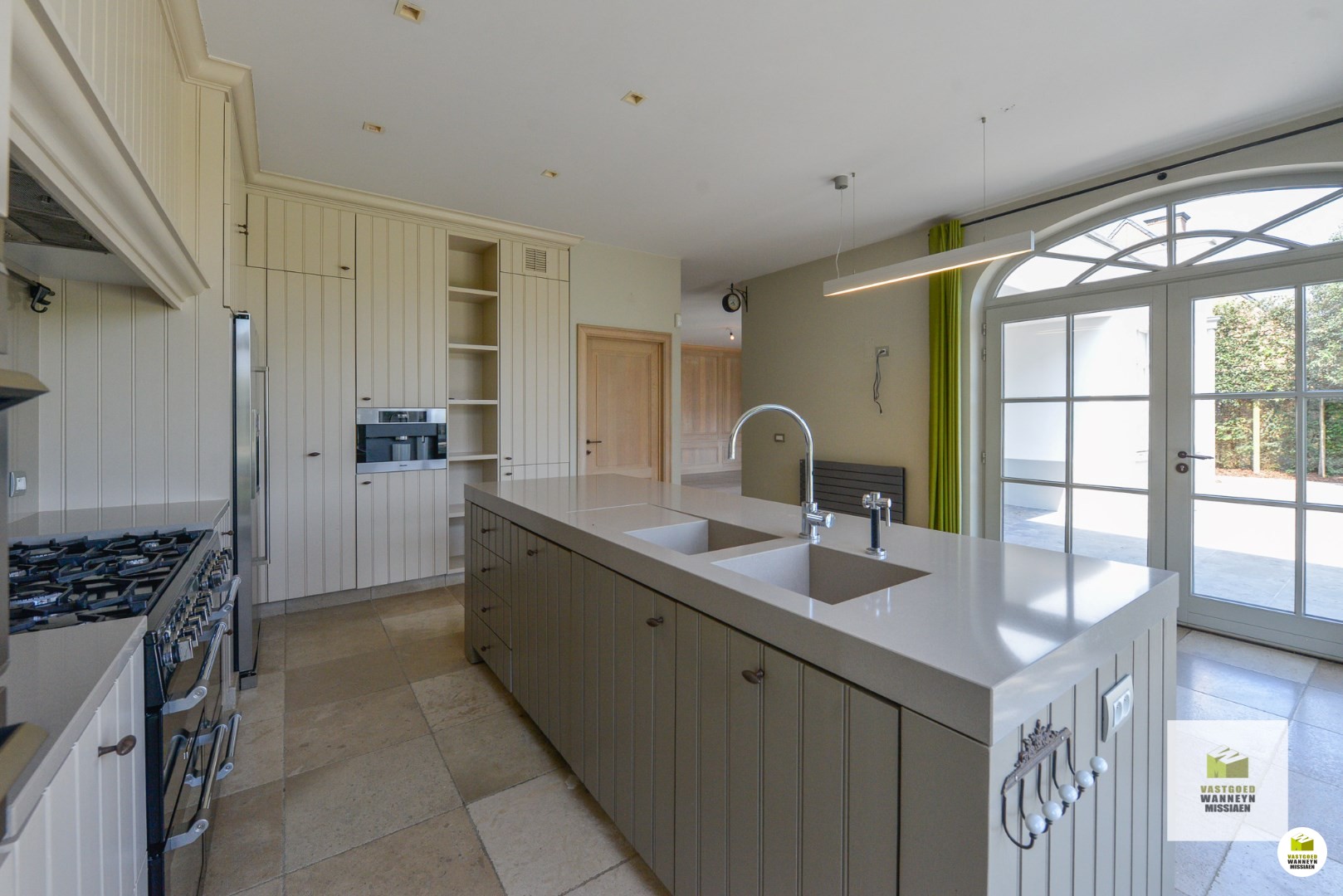 De woonst is bereikbaar aan de zijkant van het huis. Achtereenvolgende indrukwekkende ruimtes, hoge plafonds, grote ramen en veel contact met de tuin en het verwarmd zwembad. Knusse woonkamer met ingebouwd aardgasvuur. De eetplaats heeft toegang naar het deels overdekt terras. De woonkamer meet in totaal 54m2. De keuken is impressionant met de beste toestellen (koken met 7 gasbekkens en meerdere ovens,..) de ruimte meet 25m2. Aansluitend vinden we de wasplaats (11m2) en de garage (42m2) beiden ingericht met veel inbouwkasten en een koelcel. Vanuit de keuken kan je naar de prachtige tuin met verwarmd zwembad en poolhouse, ingericht met kitchenette en toilet.