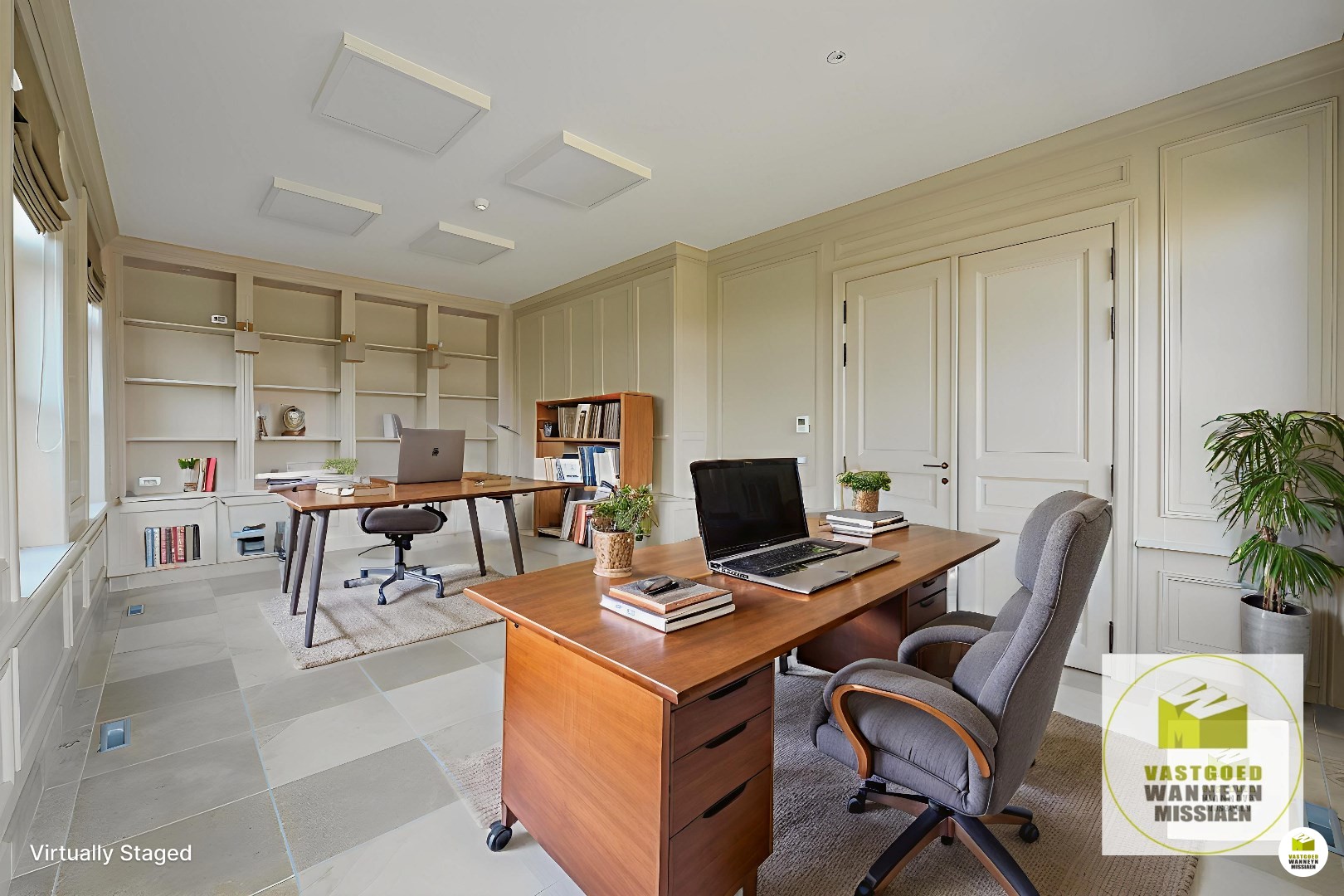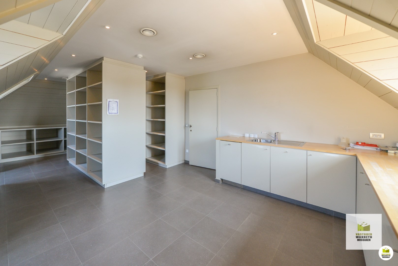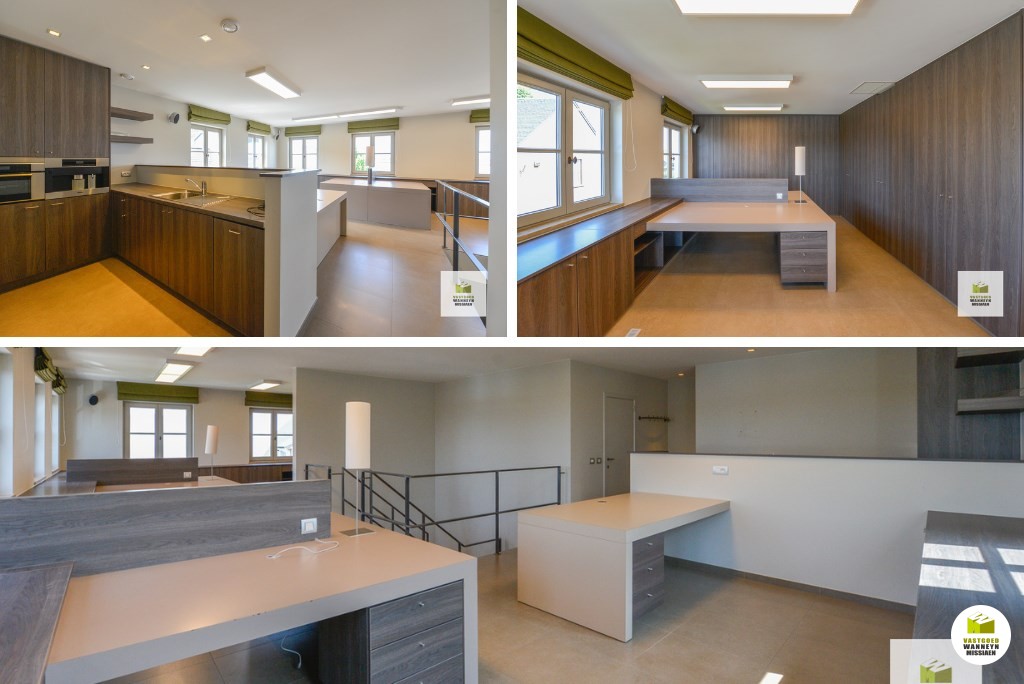 Bureau 1 meet 28m2 en is ingericht met massieve inbouwkasten. Bureau 2 meet 16m2 met ingebouwd bureel, kasten en kitchenette. Aparte archiefruimte van 12m2. Je kan met de trap of met de lift naar bureau 3, deze is open en ingedeeld in 3 eilanden met een totale oppervlakte van 59m2. Deze ruimte is ingericht met kitchenette en een toilet. Alle bureau's zijn ingebouwd, er is veel opbergruimte in de inbouwkasten. Er is airco op het gelijkvloers en de eerste verdieping.
