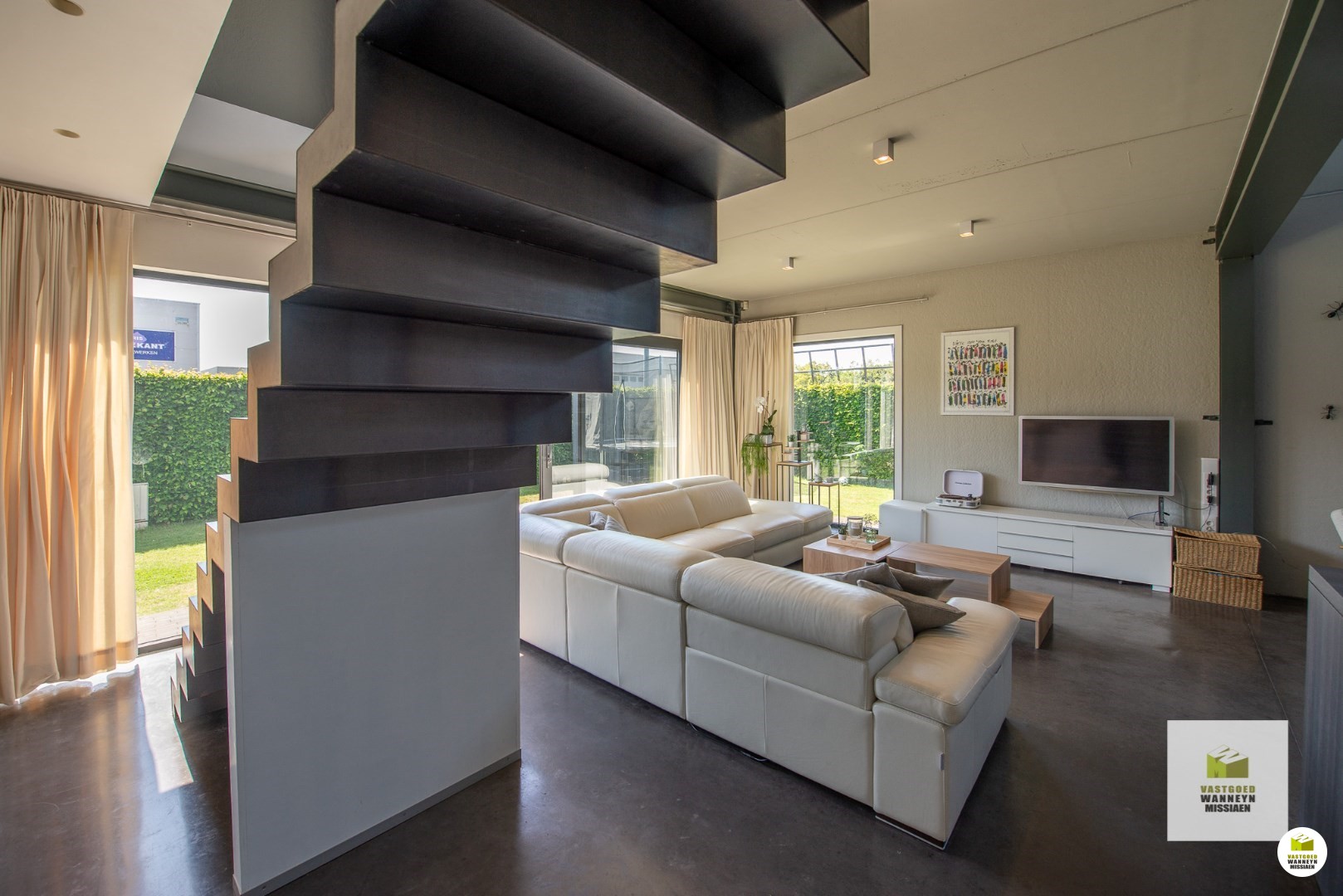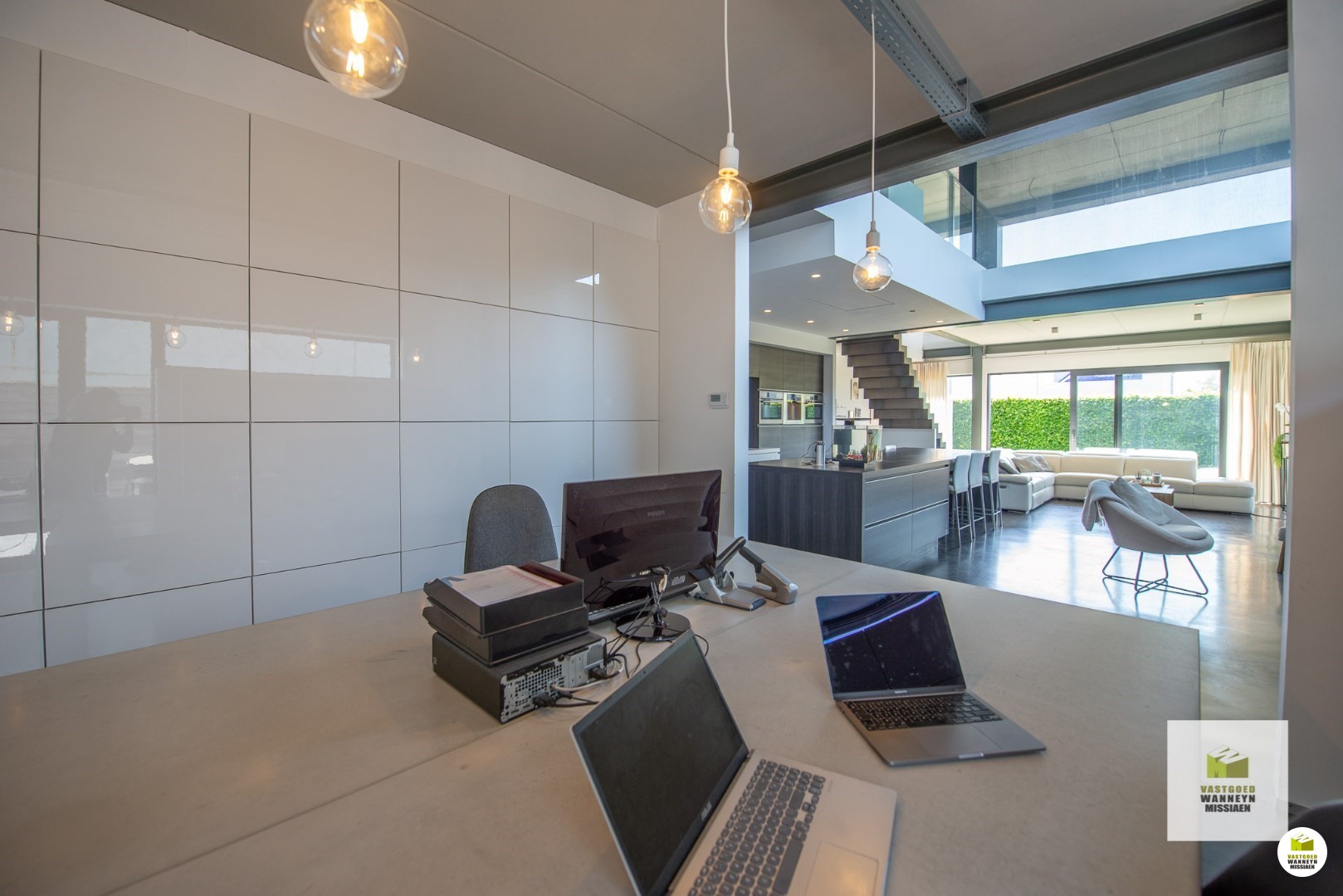 Binnenkomen in een aparte inkomhal, die u meteen langs verschillende deuren naar de open leefruimte loodst. In de inkomhal is toegang tot een apart gastentoilet, het werkatelier met daaraan de winkelruimte, de wasplaats met daaraan de loods en de badkamer die voorzien werd van een dubbele lavabo, extra toilet, inloopdouche, ligbad en dressing. Tot slot komen we binnen in de leefruimte, gekenmerkt door de moderne stijl en die alle ruimtes zowel boven als beneden met elkaar verbindt. Dankzij de vele ramen komt ... overal voldoende lichtinval binnen. Palend aan de leefruimte met open keuken is een bureauruimte gelegen, die plaats biedt voor 4 bureaus. Vanuit hier is toegang tot de loods, alsook het terras aan de zijkant van de woning en tevens georiënteerd op het westen. De leefruimte is onderverdeeld in een gezellige ruimte waar het vertoeven is in de winter rond de houthaard, een aparte zithoek en de open keuken. De keuken met kookeiland en voorziening van elektriciteit in het eiland werd volledig voorzien van ingebouwde toestellen: ingebouwde vaatwasmachine op hoogte, Aqualex-kraan, ingebouw koffietoestel, microgolfoven, warmeluchtoven, frigo ect.