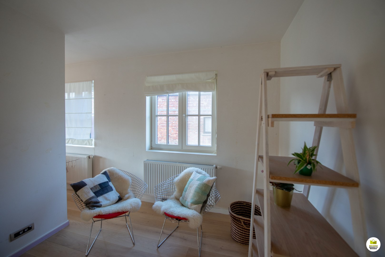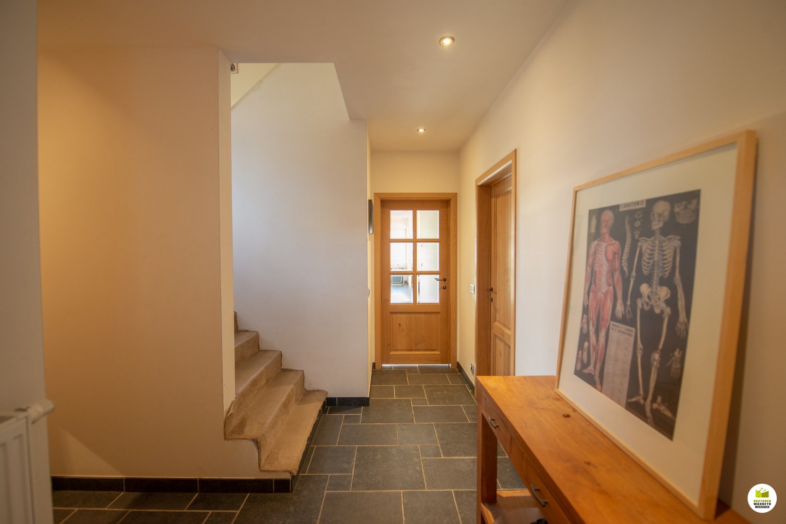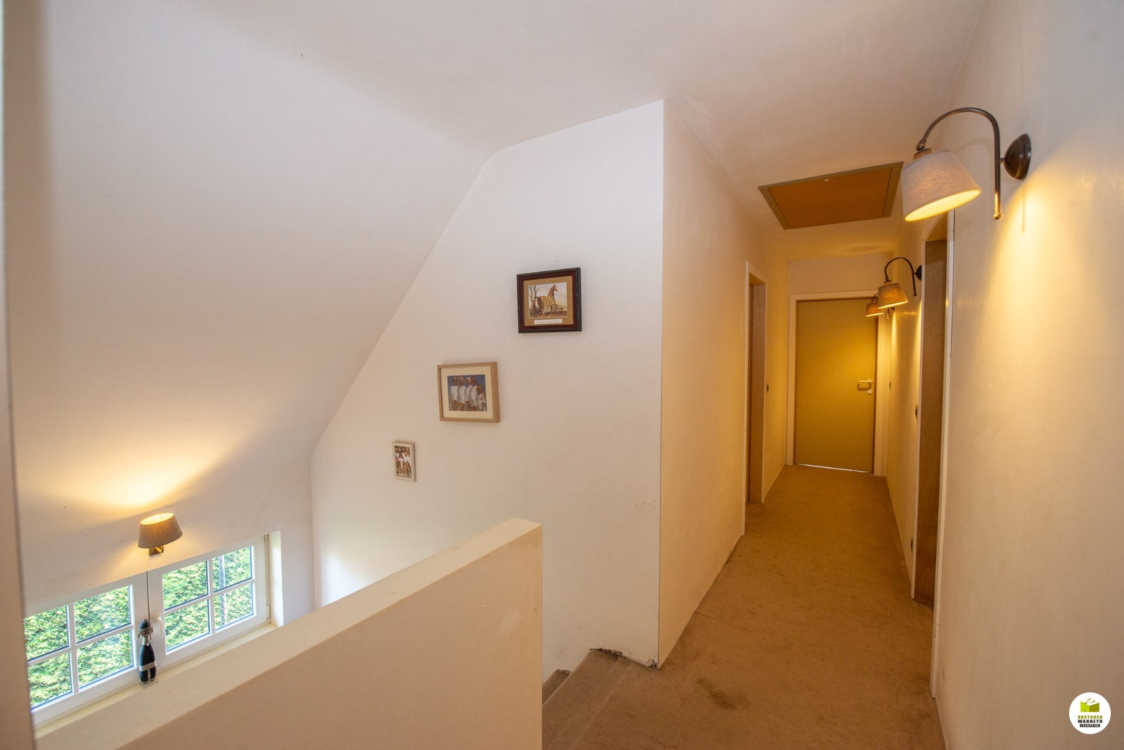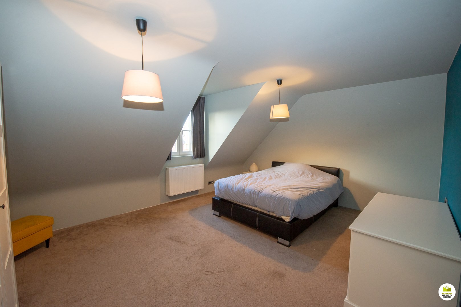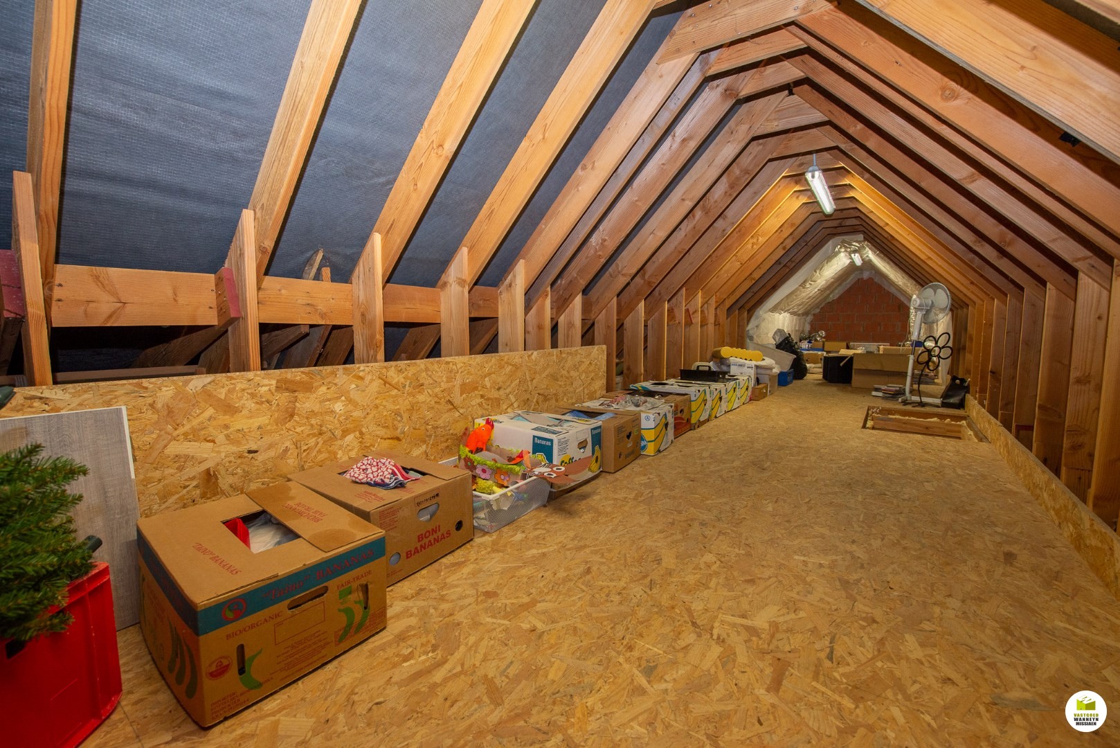 Ruime inkomhal met gastentoilet, aparte wasplaats bereikbaar via de achterdeur en de inpandige garage, aparte douchekamer. Lichtrijke volledig uitgeruste keuken met bijkeuken. De woonkamer is ingedeeld in een eetplaats, zithoek en aanpalend het bureau of speelkamer,.. ter hoogte van de zithoek is het voorzien om een open haard te plaatsen. Op de eerste verdieping zijn er 3 slaapkamers, en een badkamer. De slaapkamers meten 21 m2, 16 m2, 20 m2 met ingebouwde dressing van 11 m2. De badkamer is ingericht met een ligbad, dubbele lavabo, en een tweede toilet. De grote bergzolder is bereikbaar met een schuiftrap.