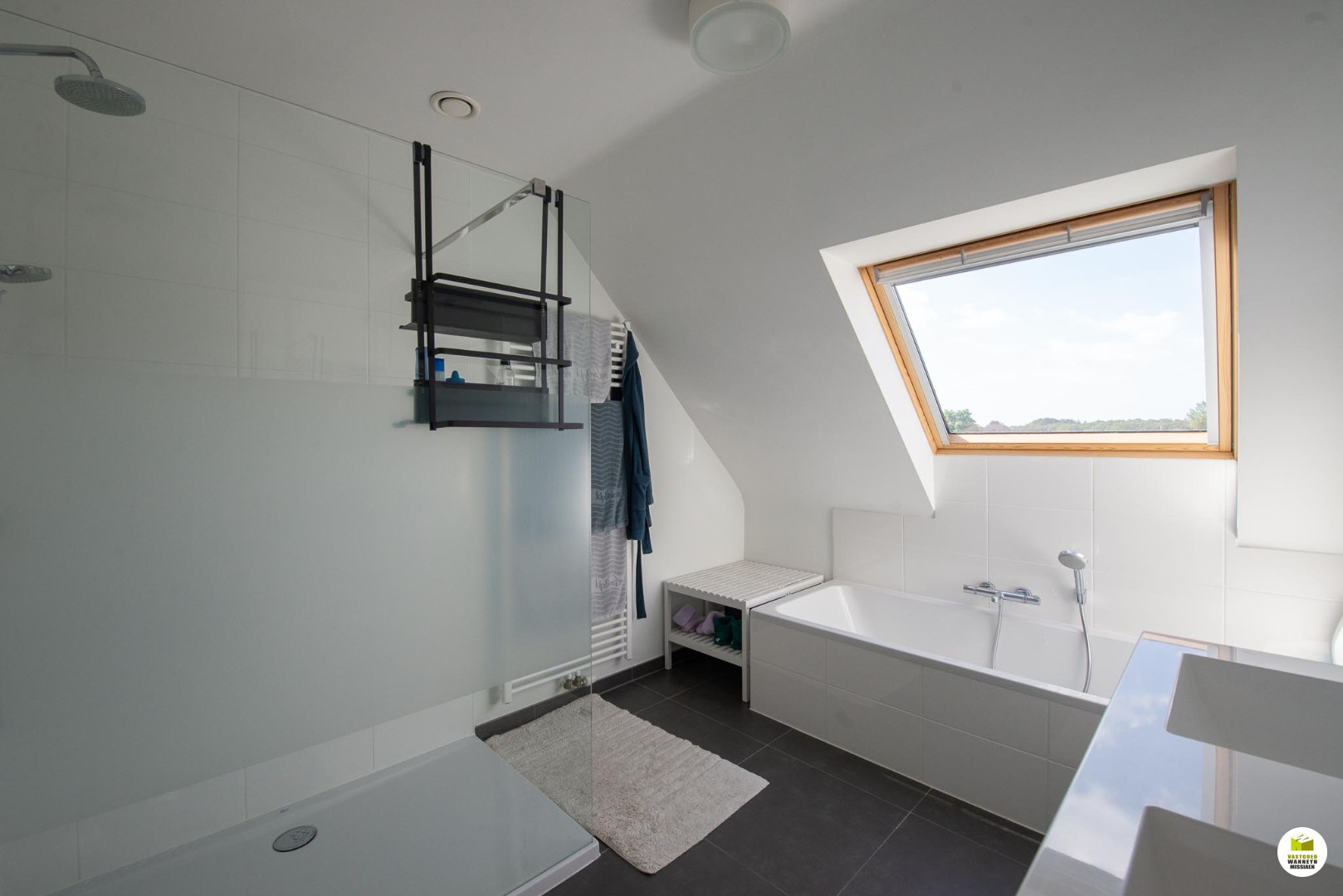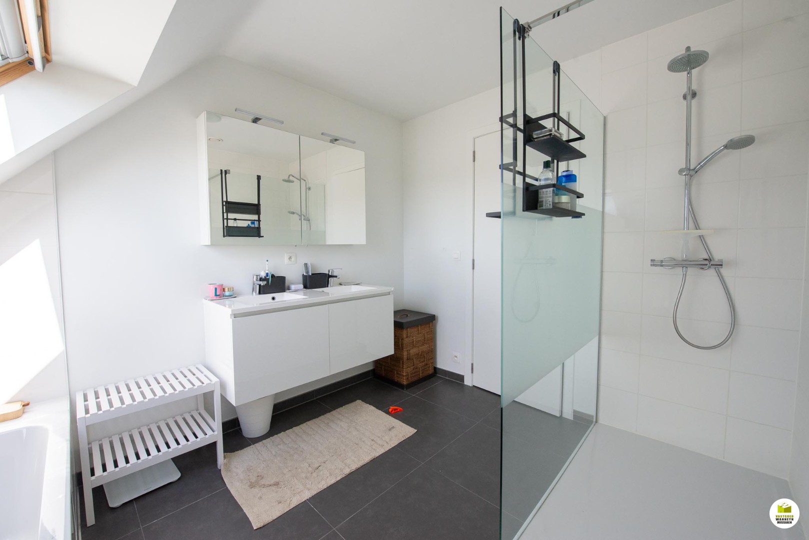 Binnenkomen doen we in een inkomhal met vestiaire waar zich ook een gastentoilet bevindt. Via een glazen deur komen we in de lichtrijke leefruimte, deze is afgewerkt met kwalitatieve parket. Aansluitend aan de leefruimte zijn er 2 ruime terrassen waar het dus altijd zalig vertoeven is in of uit de zon. Mooie strakke keuken die is uitgerust met vaatwas, combi oven/microgolf, kookplaat en frigo, aansluitend voorraadberging én ruime wasplaats/berging. Via de open trap komt u op het verdiep waar zich 2 ruime slaapkamers bevinden, 1 slaapkamer (16m2) beschikt over ingebouwde kasten. De tweede kamer (24m2) is ideaal als slaapkamer met bureel, achter deze kamer bevindt zich nog een afgesloten berging. Zeer mooie, ruime en lichtrijke badkamer met ... inloopdouche, ligbad, dubbele lavabo en toilet. Tot slot is er nog een grote bergzolder die toegankelijk is via een uitschuiftrap.