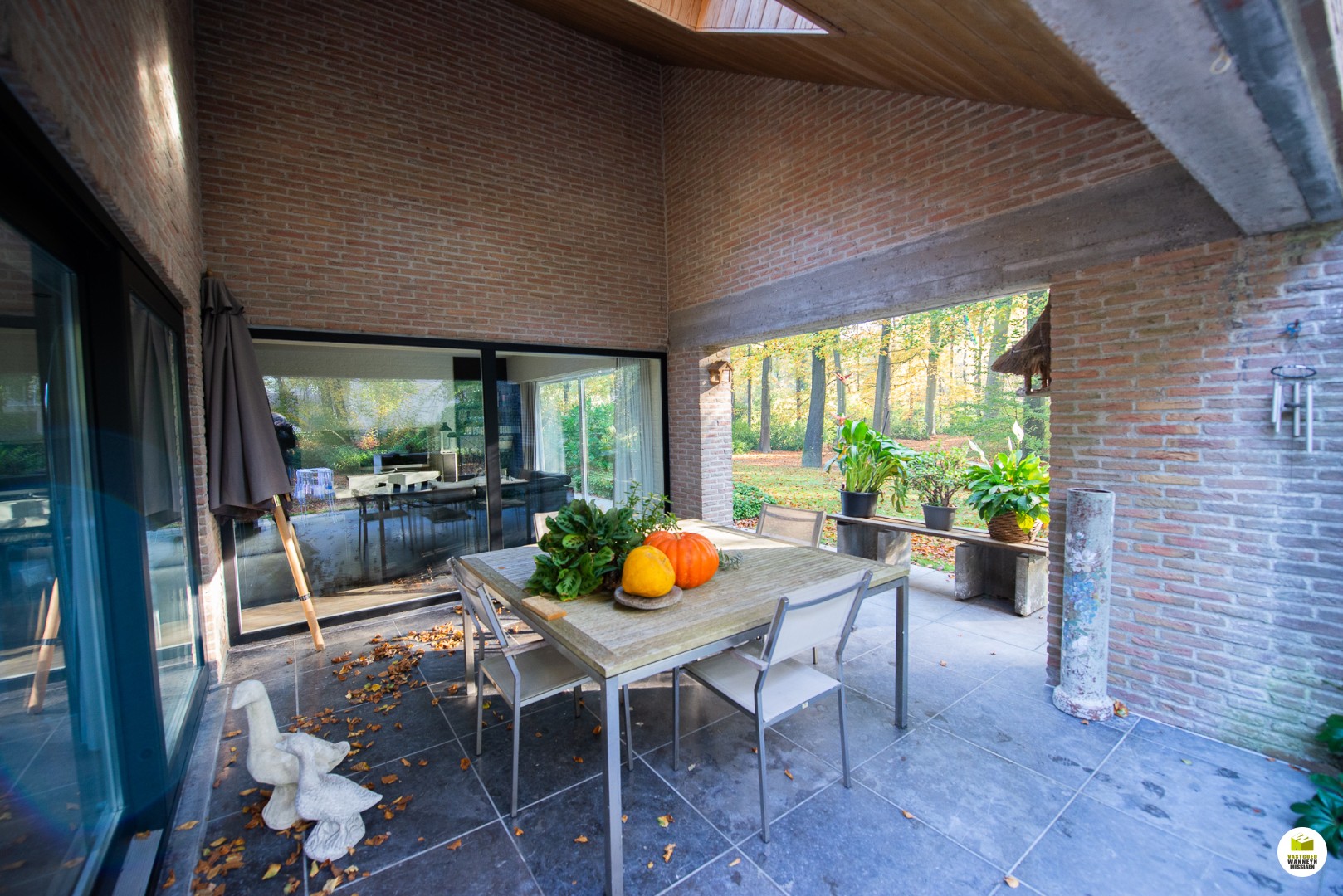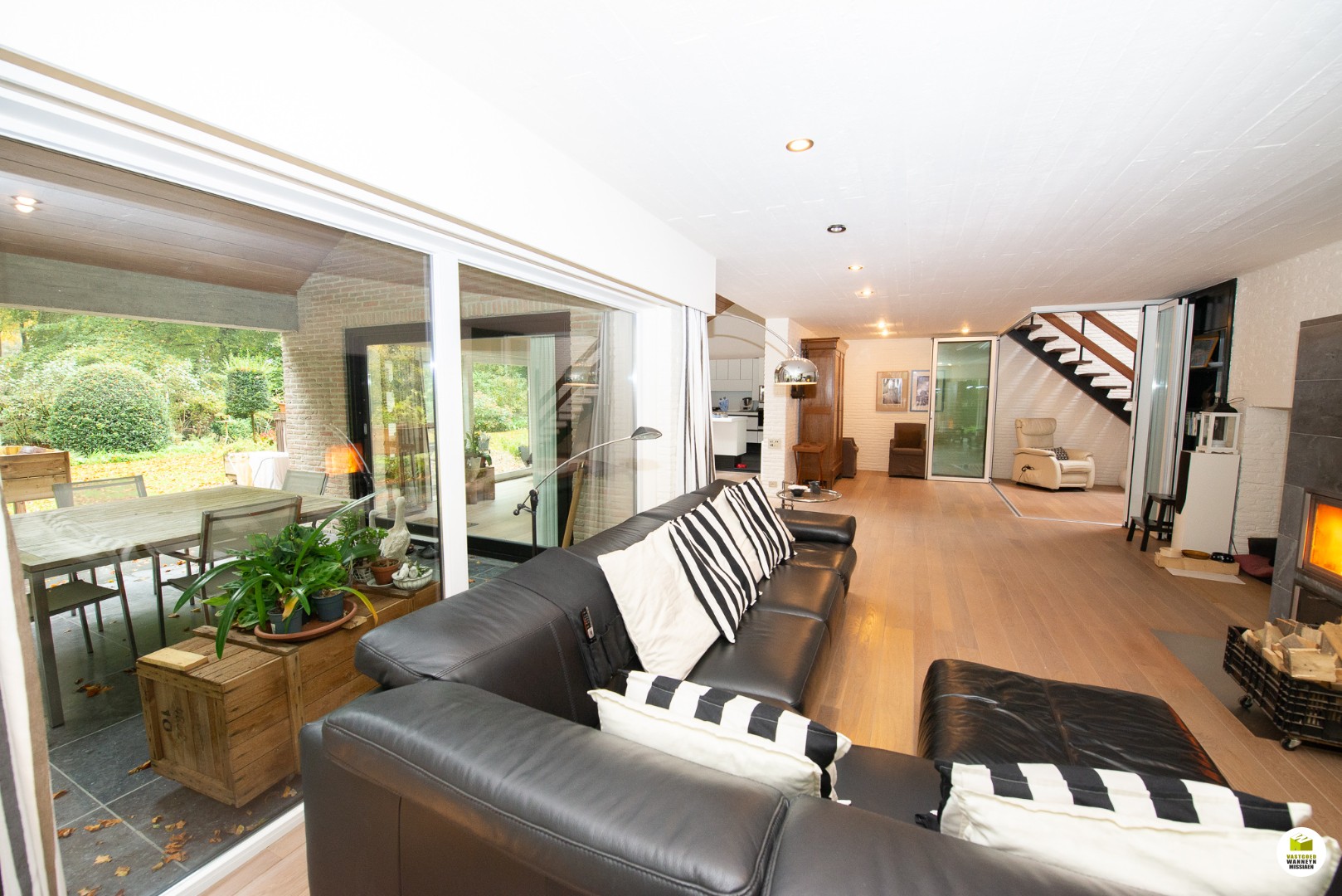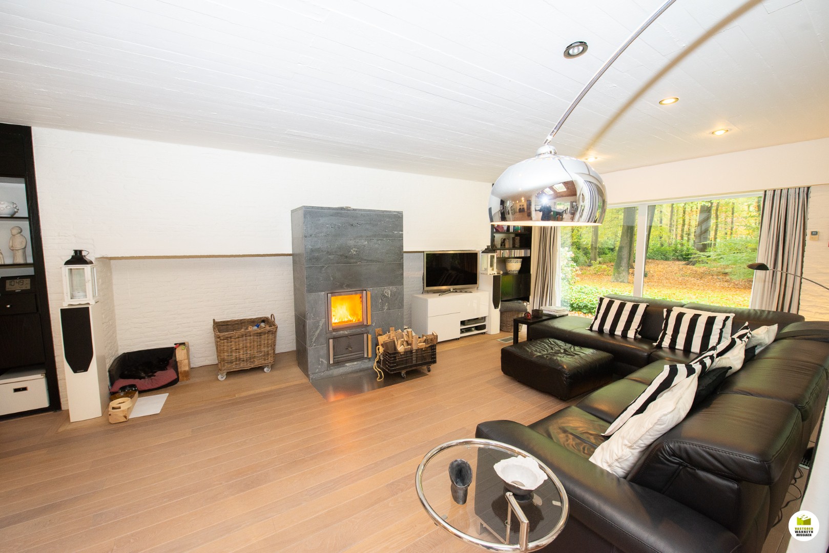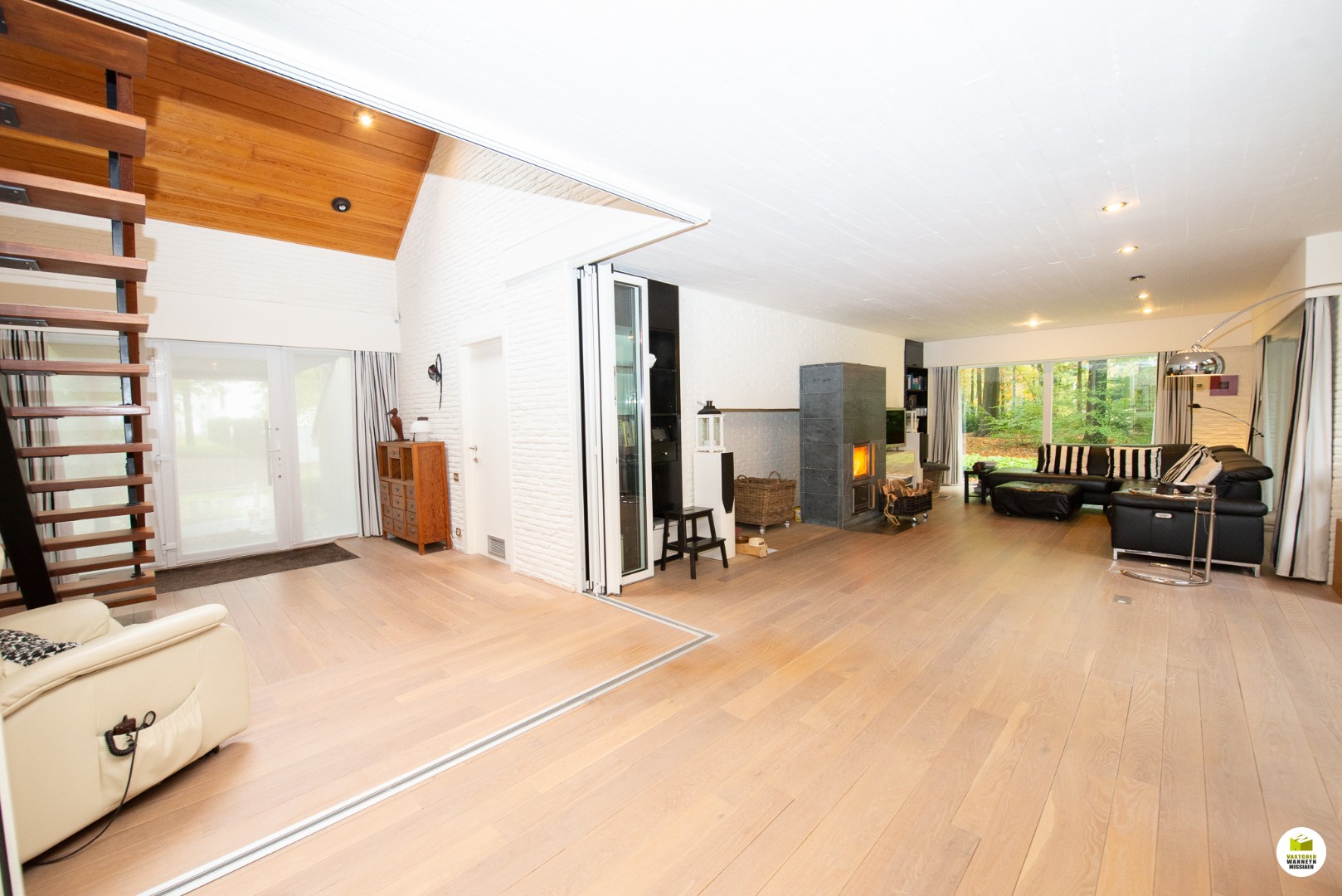 Indeling: Ruime licht overgoten inkomhal met een gastentoilet en een vestiaire met aansluitend de toegang naar de dubbele garage en de technische ruimte. De moderne badkamer met aansluitend slaapkamer bevinden zich gelijkvloers. In de slaapkamer heb je zicht op het bos en het terras, de ochtendzon piept hier binnen, en als je geluk ... hebt krijg je de kans om af en toe een eekhoorn met een volle pluimstaart te zien ;-). De inkomhal en de woonkamer zijn van elkaar af te scheiden door een glazen plooi-deurvenster. De speksteenkachel staat centraal en verwarmt daardoor de gehele gelijkvloerse verdieping, de tv hoek grenst aan het overdekt terras en de eetplaats grenst aan de grote ingerichte keuken (o.a. stoomoven, vaatwas..) aansluitend is er een wasplaats en een ruimte waar er een grote sauna staat met douche, vanhier uit kan je meteen naar buiten. Op de eerste verdieping is er een grote overloop, deze kan dienen voor een bureau, je geniet zicht op het bos vanuit alle hoeken en je behoudt het contact met je gezin. Verder zijn er 2 ruime slaapkamers en een ruimte waar er nog een tweede badkamer kan komen en desgewenst 2 verschillende dressingruimtes. Er is ook een apart toilet en een bergzolder.