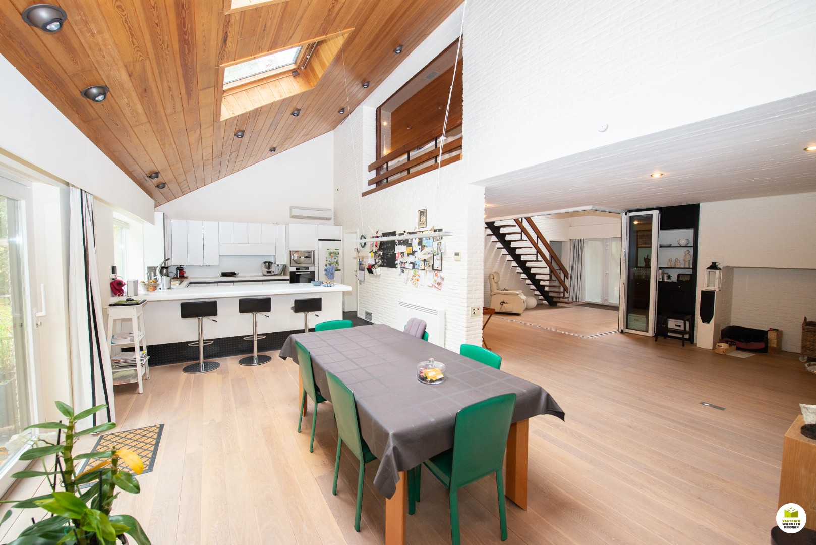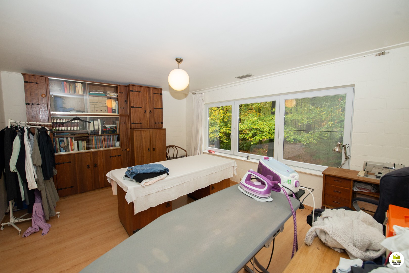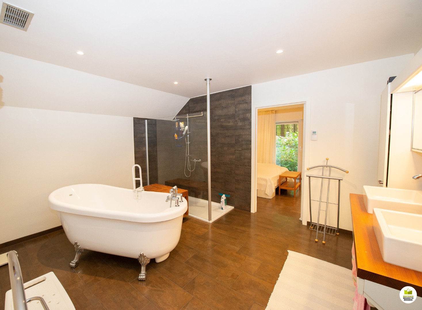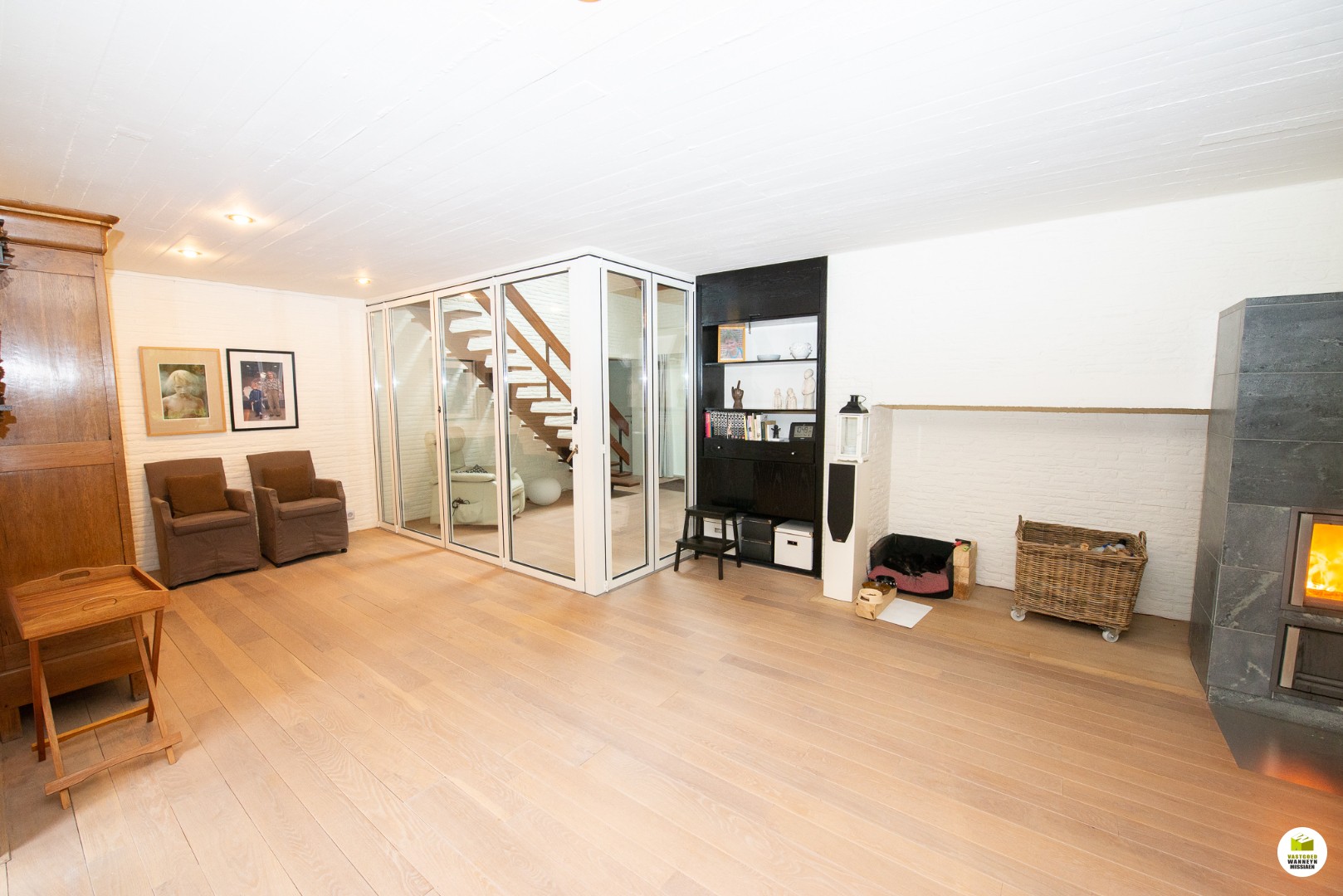 Indeling: Ruime licht overgoten inkomhal met een gastentoilet en een vestiaire met aansluitend de toegang naar de dubbele garage en de technische ruimte. De moderne badkamer met aansluitend slaapkamer bevinden zich gelijkvloers. In de slaapkamer heb je zicht op het bos en het terras, de ochtendzon piept hier binnen, en als je geluk ... hebt krijg je de kans om af en toe een eekhoorn met een volle pluimstaart te zien ;-). De inkomhal en de woonkamer zijn van elkaar af te scheiden door een glazen plooi-deurvenster. De speksteenkachel staat centraal en verwarmt daardoor de gehele gelijkvloerse verdieping, de tv hoek grenst aan het overdekt terras en de eetplaats grenst aan de grote ingerichte keuken (o.a. stoomoven, vaatwas..) aansluitend is er een wasplaats en een ruimte waar er een grote sauna staat met douche, vanhier uit kan je meteen naar buiten. Op de eerste verdieping is er een grote overloop, deze kan dienen voor een bureau, je geniet zicht op het bos vanuit alle hoeken en je behoudt het contact met je gezin. Verder zijn er 2 ruime slaapkamers en een ruimte waar er nog een tweede badkamer kan komen en desgewenst 2 verschillende dressingruimtes. Er is ook een apart toilet en een bergzolder.