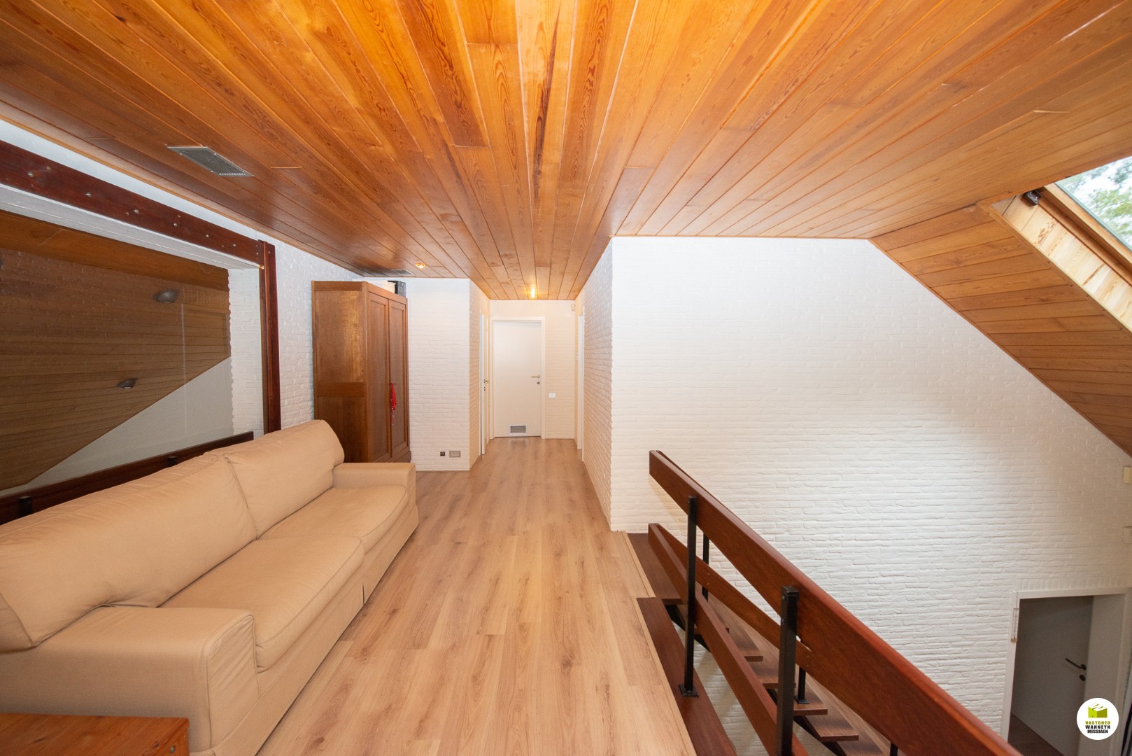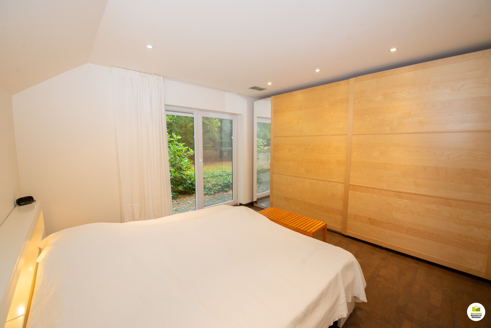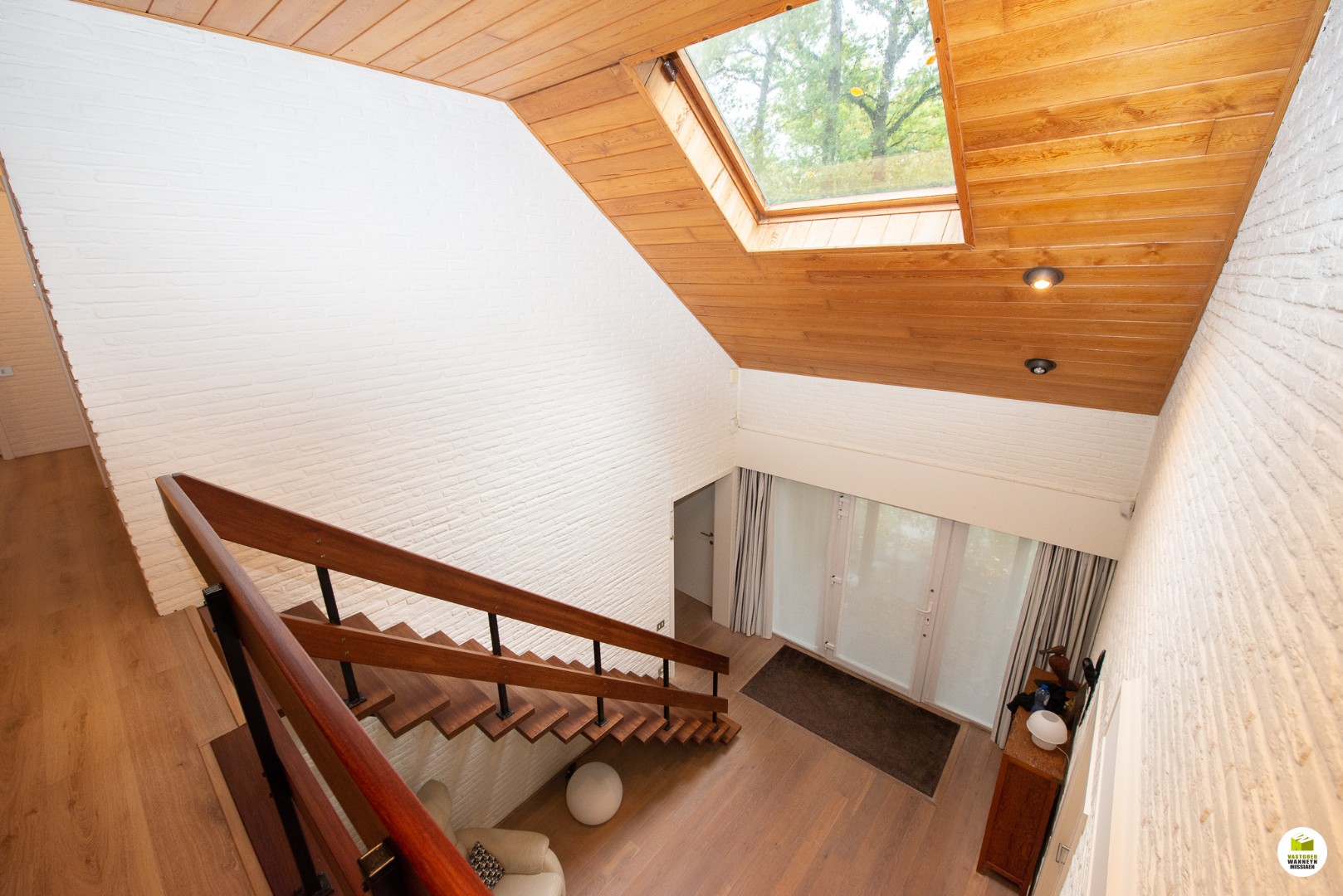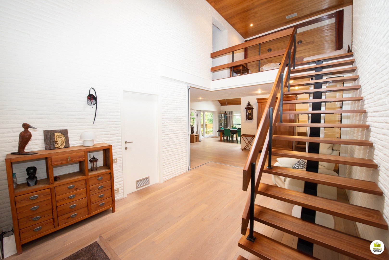 Indeling: Ruime licht overgoten inkomhal met een gastentoilet en een vestiaire met aansluitend de toegang naar de dubbele garage en de technische ruimte. De moderne badkamer met aansluitend slaapkamer bevinden zich gelijkvloers. In de slaapkamer heb je zicht op het bos en het terras, de ochtendzon piept hier binnen, en als je geluk ... hebt krijg je de kans om af en toe een eekhoorn met een volle pluimstaart te zien ;-). De inkomhal en de woonkamer zijn van elkaar af te scheiden door een glazen plooi-deurvenster. De speksteenkachel staat centraal en verwarmt daardoor de gehele gelijkvloerse verdieping, de tv hoek grenst aan het overdekt terras en de eetplaats grenst aan de grote ingerichte keuken (o.a. stoomoven, vaatwas..) aansluitend is er een wasplaats en een ruimte waar er een grote sauna staat met douche, vanhier uit kan je meteen naar buiten. Op de eerste verdieping is er een grote overloop, deze kan dienen voor een bureau, je geniet zicht op het bos vanuit alle hoeken en je behoudt het contact met je gezin. Verder zijn er 2 ruime slaapkamers en een ruimte waar er nog een tweede badkamer kan komen en desgewenst 2 verschillende dressingruimtes. Er is ook een apart toilet en een bergzolder.