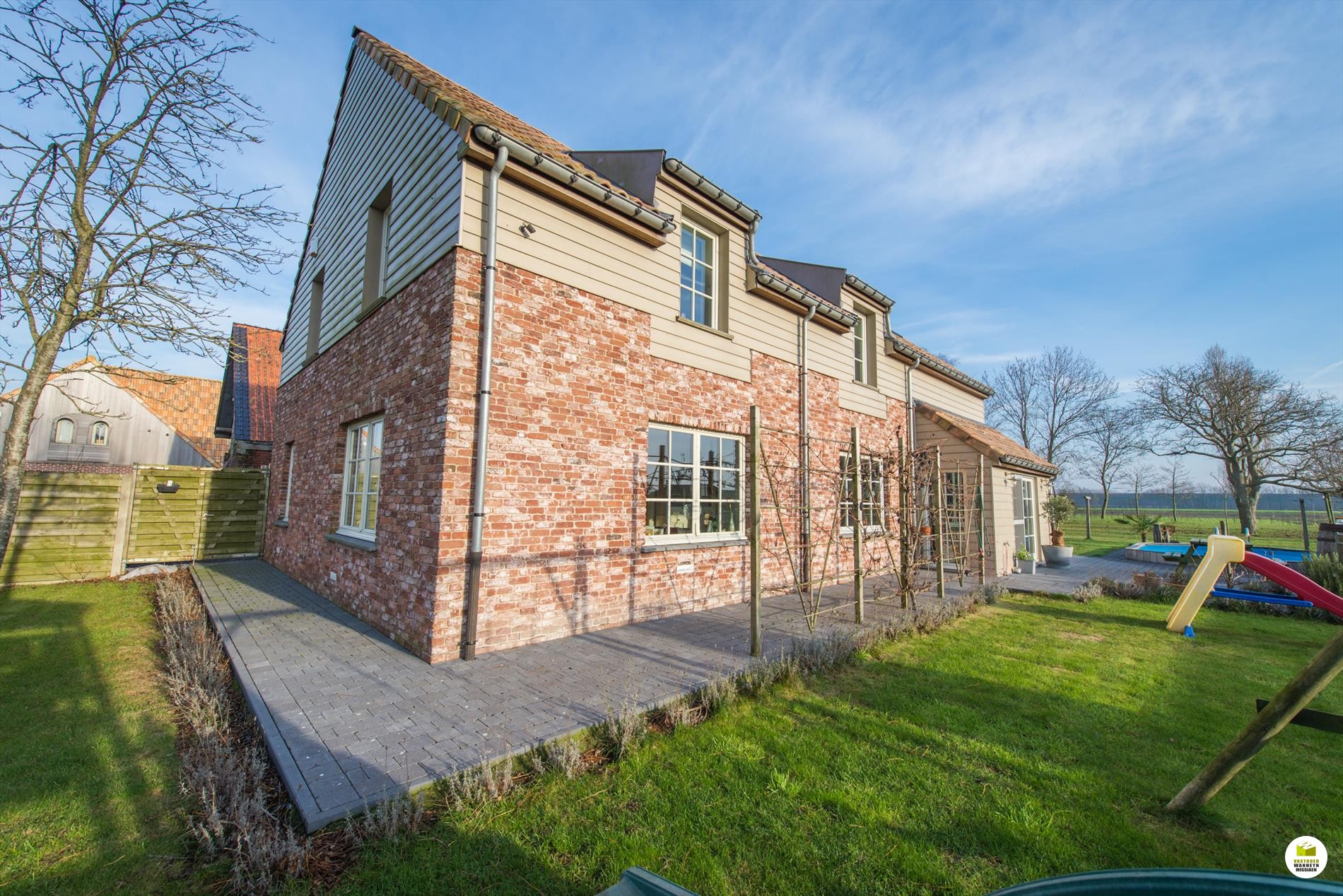 In optie! Prachtige landelijke villa op 2.225m2 met zicht over de velden nabij centrum Wingene. Recent gebouwd (2011) met hoge afwerkingsgraad: massief eiken deuren, natuursteen vloeren, lage-energie woning, zonneboiler, alarm, zwembad. Op het gelijkvloers bevindt zich de inkomhal met gastentoilet, bureel van 10m2, lichtrijke living met inbouwhaard, landelijke leefkeuken, kelder, wasplaats met douche en berging. Op de verdieping bevinden zich 4 grote slaapkamers waarvan één masterbedroom met dressing, ruime badkamer met massagebad en dubbele inloopdouche. De eigendom is volledig afgesloten met automatische poort en beschikt over een grote oprit, veel parkeerruimte, zonnige tuin en terras met verwarmd zwembad. Prachtig zicht over de omliggende weilanden. Mogelijkheid tot bouwen bijgebouw van 40m2. Goede bereikbaarheid op 5 minuten van de E40. Voor meer info of bezoek: 050/70 34 35