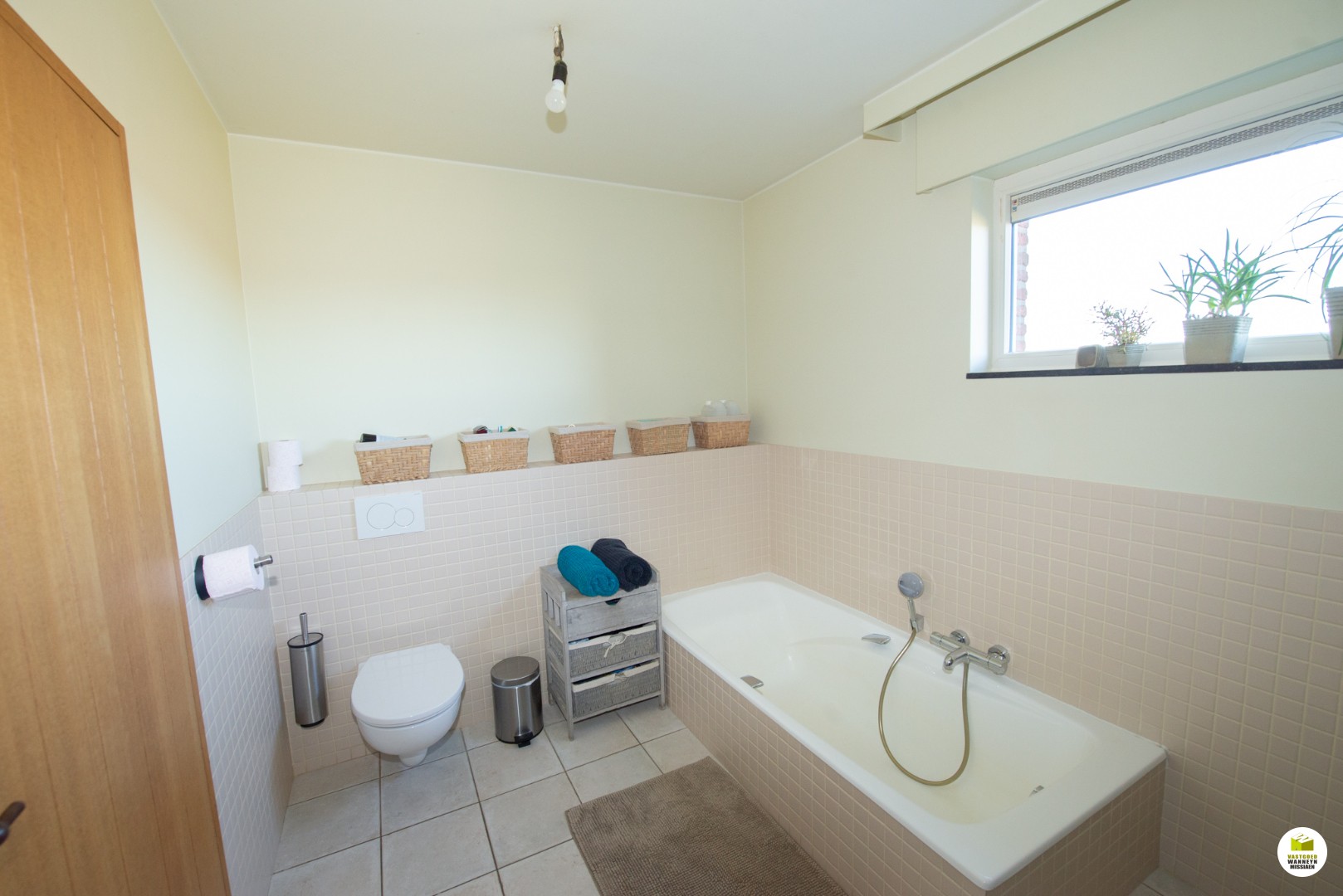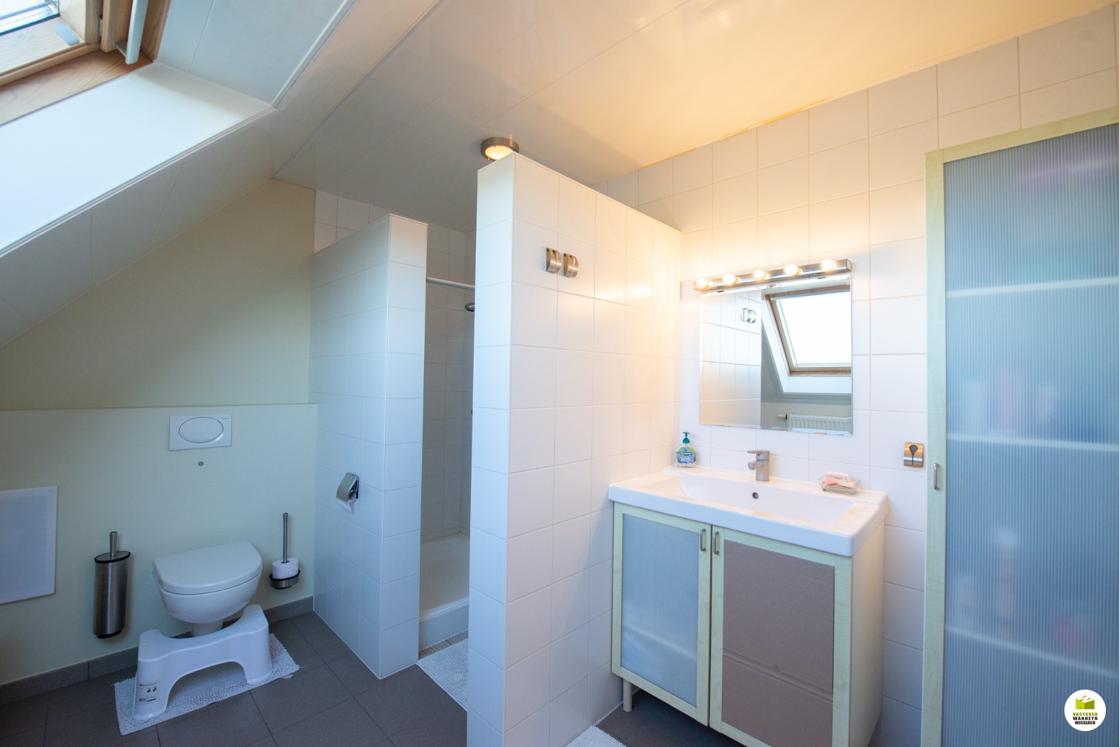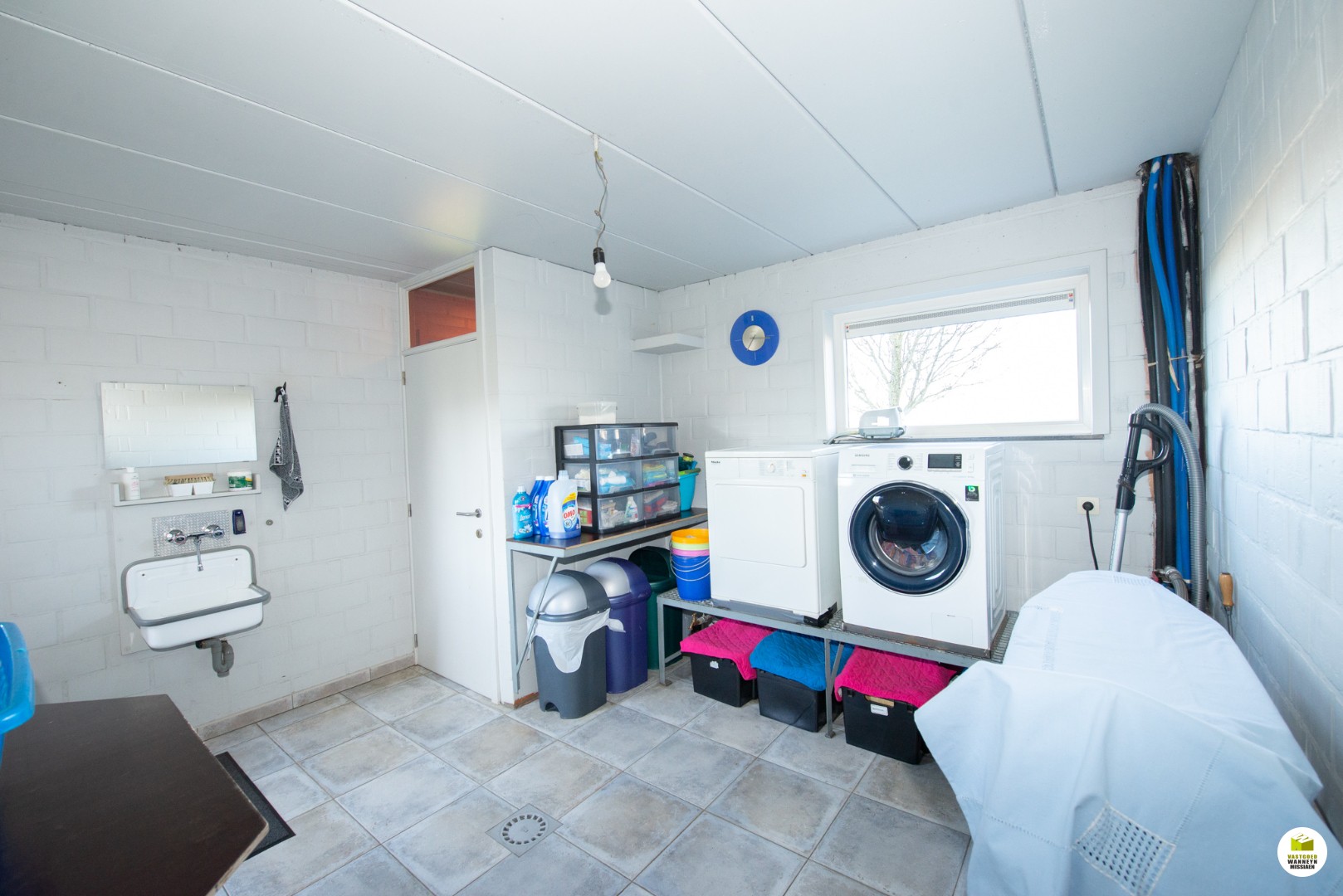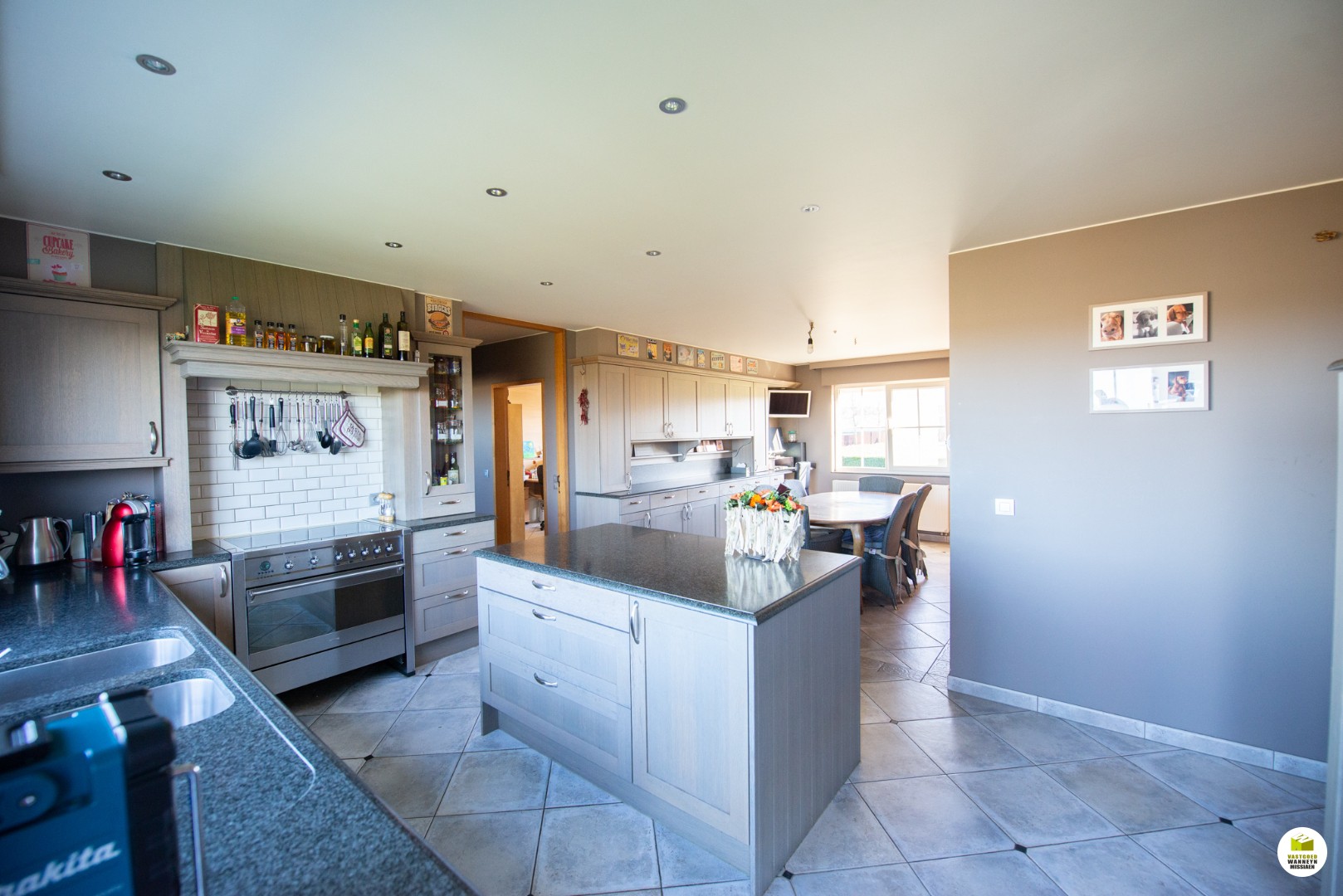 De inkomhal met apart gastentoilet, toegang naar de gezellige woonkamer met houtkachel en ruime eetplaats en ultra uitgeruste grote leefkeuken (smegtoestellen, graniet werkbladen). Gelijkvloerse badkamer (ligbad, lavabo en douche) met recht tegenover een gelijkvloerse slaapkamer of bureel. Aparte wasplaats met toilet. Garage met zolder of extra slaapkamer.