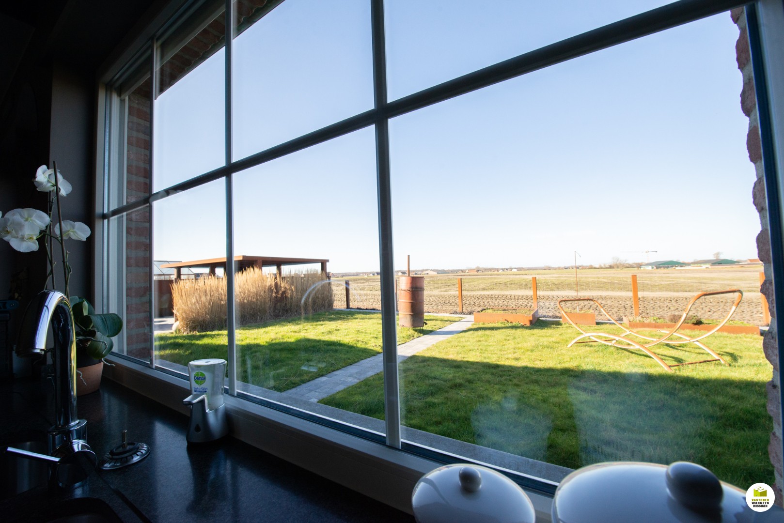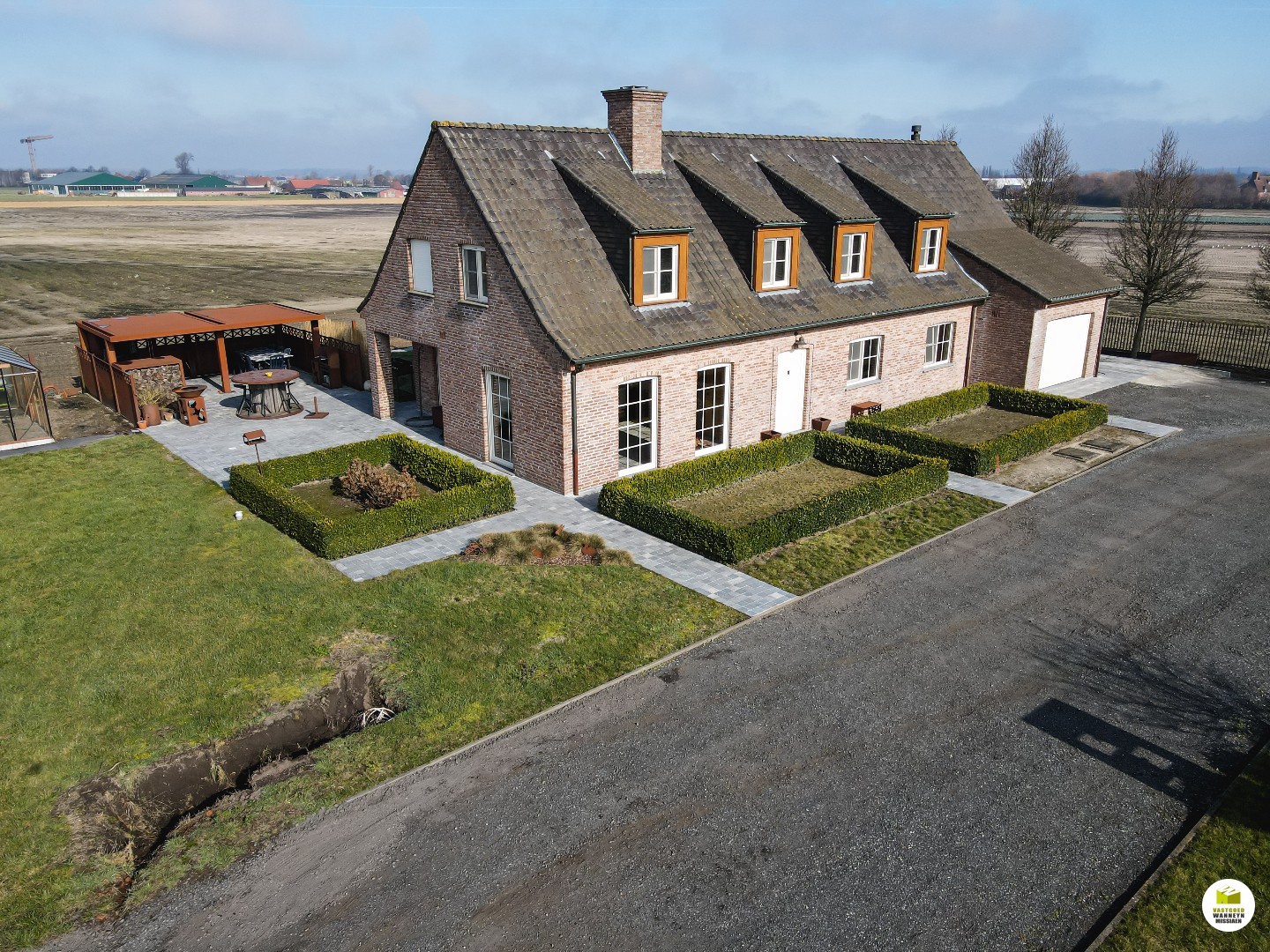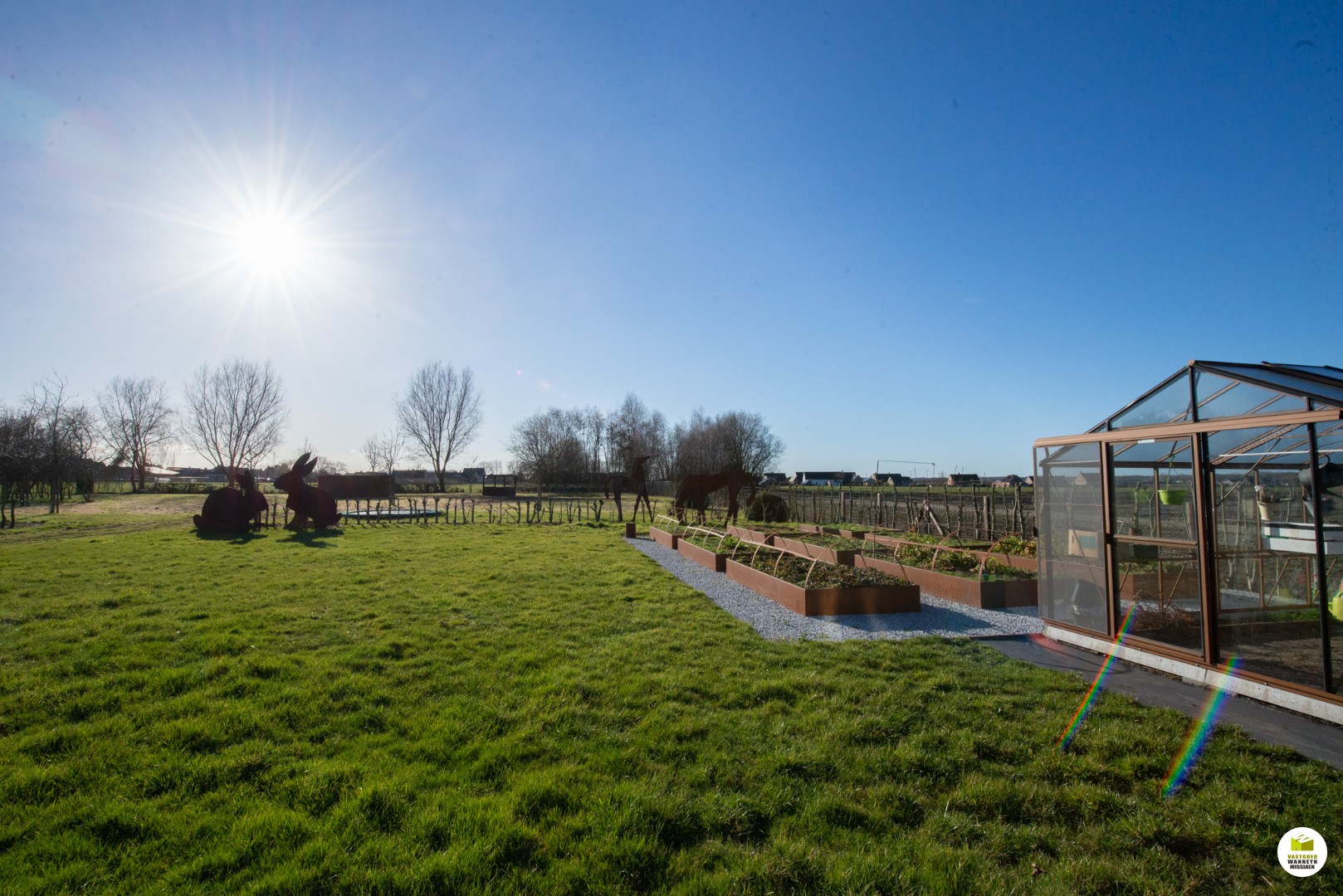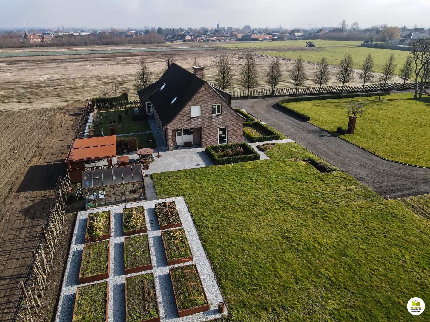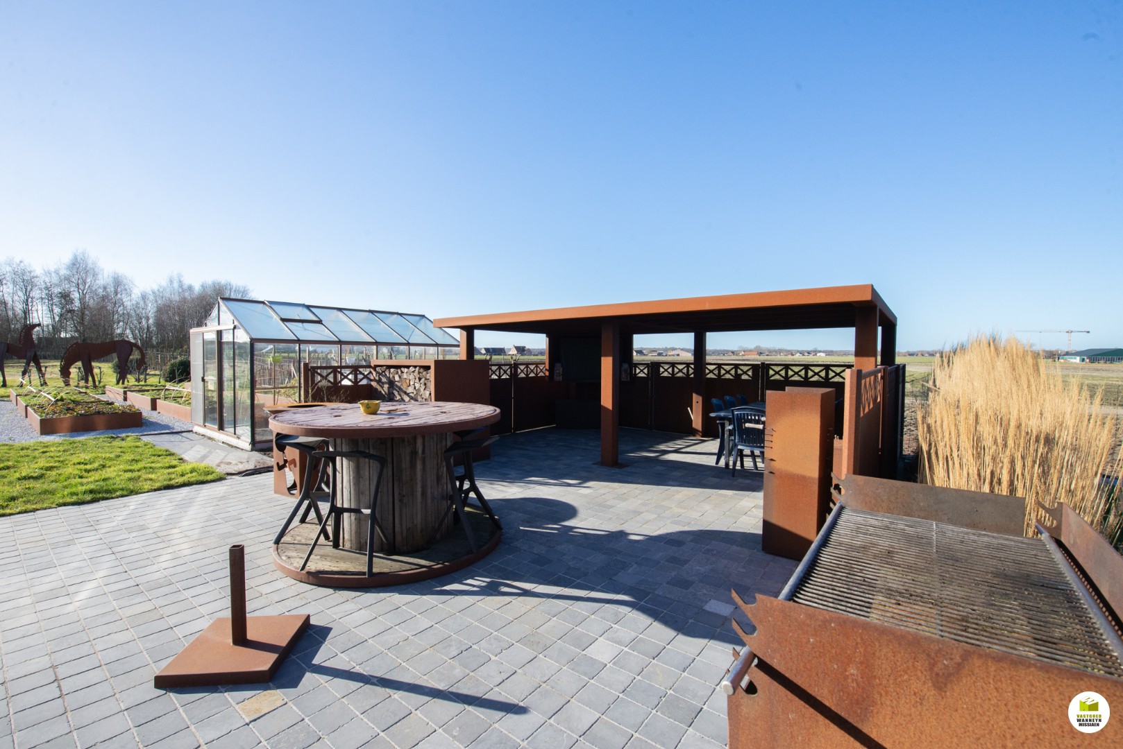 + Cortenstaalconstructies; moestuinbakken 40m2, erfafscheiding +/- 85m , prieel (overdekt terras), serre..