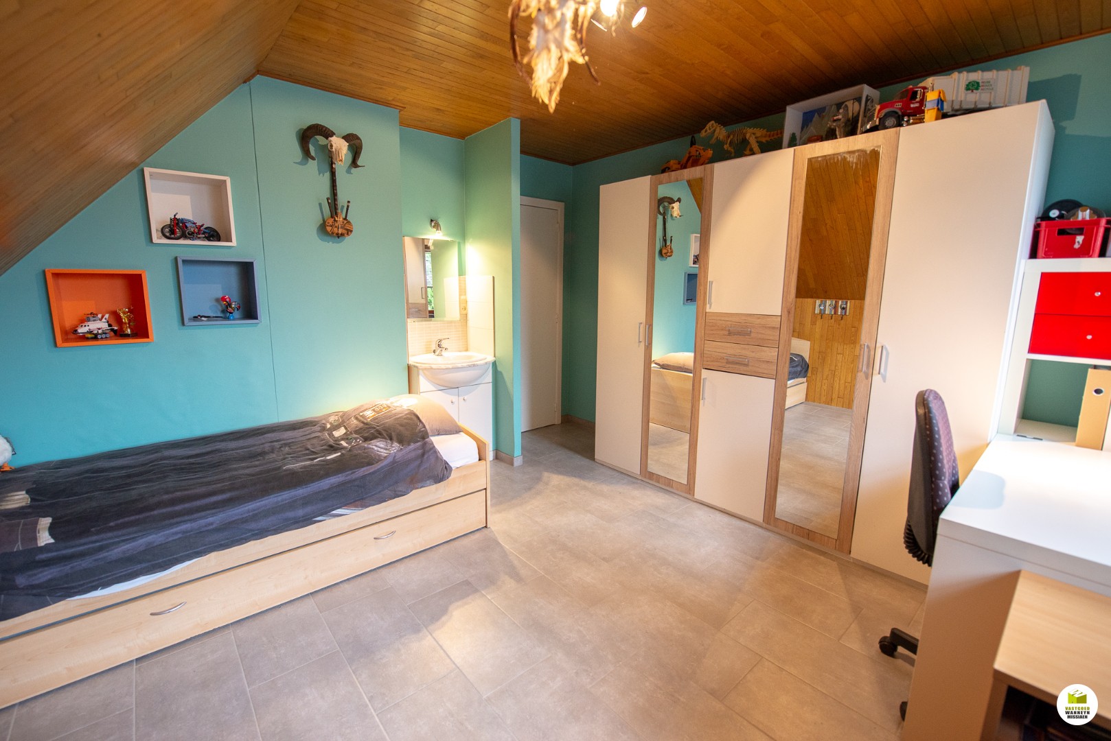 Op het gelijkvloers komen we binnen in een ruime inkomhal ( 11 m2 ) met nieuw gastentoilet ( 4 m 2 )die tevens dienst doet als eerste badkamer (met douche met lavabo). Vanuit de inkomhal kunnen we links naar de bureau/praktijkruimte/bibliotheek/speelkamer,.. ( 16 m 2) die aansluit op de grote gezellige leefkamer ( 25 m 2 ) met een glazen dubbele deur. Het salon is ingericht met een houtcassette. ( 18 m2) Er is een grote uitgeruste keuken ( 22 m 2 ) met aansluitend een praktische berg-/wasplaats en toegang naar de kelder die ideaal is als extra voorraadkamer en de inpandige garage ( 16 m ... 2) . Boven de garage is er een ruime bergzolder die tevens dienst doet als muziekkamertje. Vanuit de inkomhal kunnen we de trap nemen naar de eerste verdieping. Daar komen we toe in een grote nachthal. Deze biedt toegang tot de 4 slaapkamers (15,5 m2, 16,5 m2, 16 m 2, 25 m 2) en de nieuwe badkamer. We kunnen echt spreken over 4 volwaardige slaapkamers elk met een leuke sfeer, 2 kamers beschikken over een eigen dressingruimte, 1 slaapkamer met lavabo. Extra berging is er door vele verscholen ingebouwde kasten en de toegang naar de bergzolder via een schuiftrap.