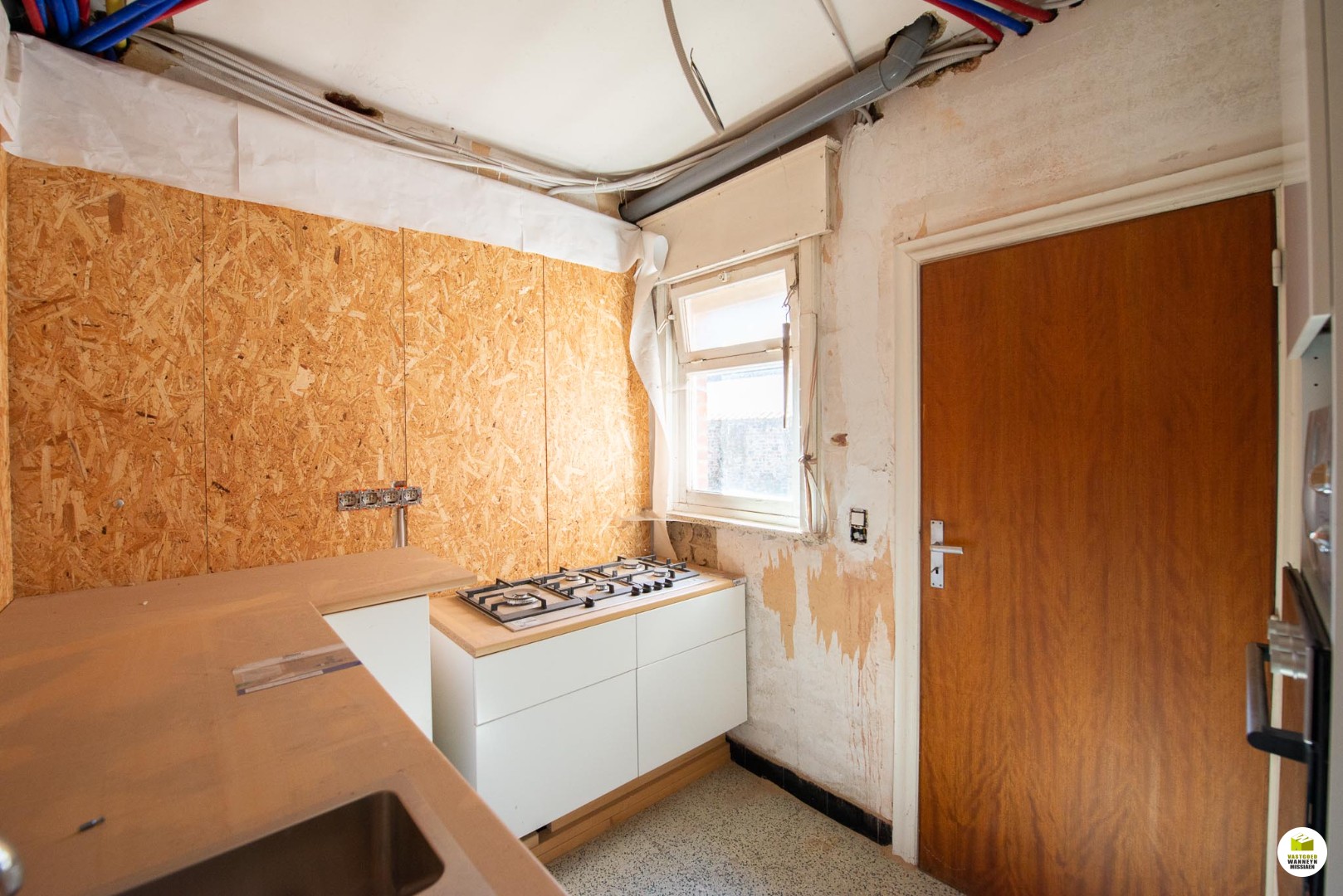 Je kan rechtstreeks van de woonkamer naar de tuin. De keuken is afzonderlijk, vrij klein, je kan er nu niet in eten, maar er zijn uitbreidingsmogelijkheden. De keuken bestaat uit nieuwe kasten maar er is enkel een oven en een spoelbak aanwezig.