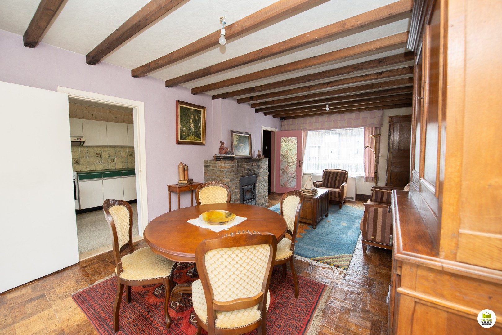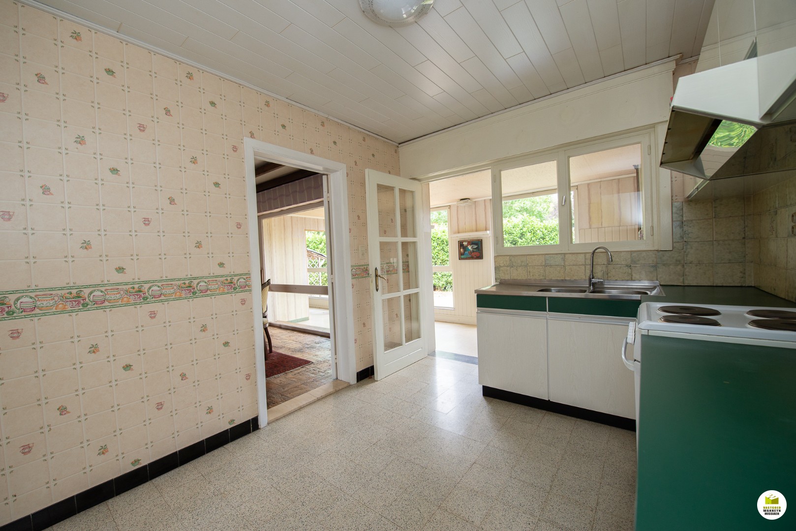 Lichtrijke leefruimte met houtcassette met aansluitend de veranda en de keuken.