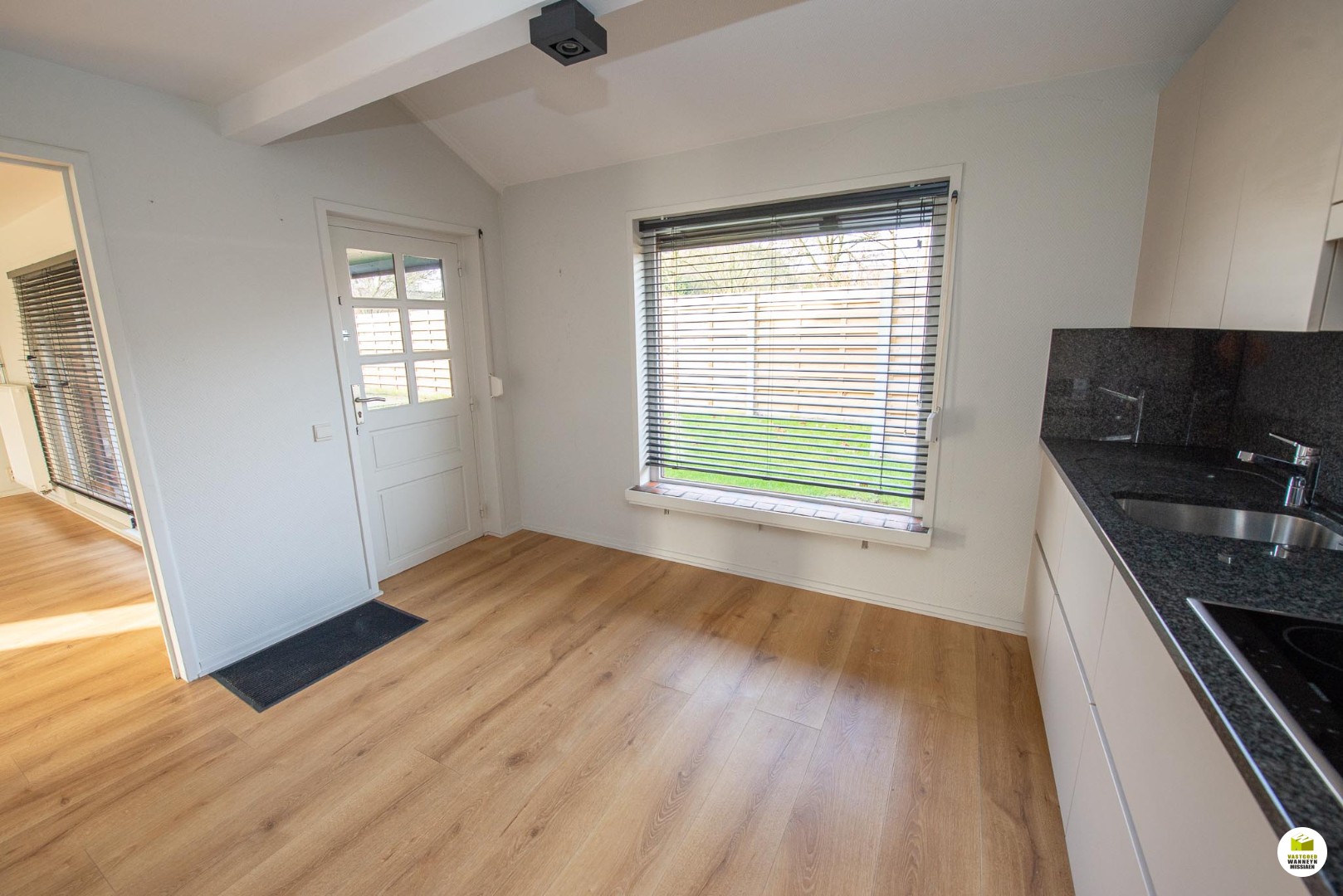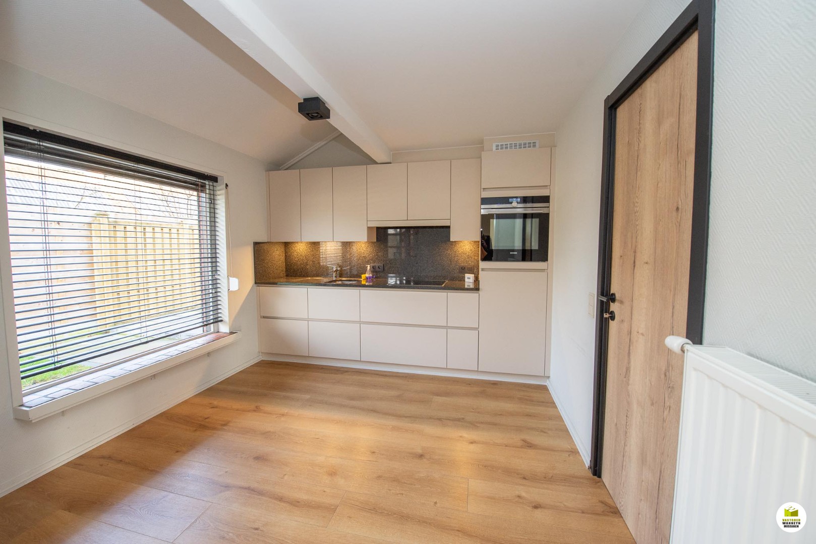 Gelijkvloers: ruime inkomhall met gastentoilet, lichtrijke leefruimte, recente keuken uitgerust met keramische kookplaat, oven (Siemens), ingebouwde frigo en granieten werkblad. Palend aan de keuken is er een garage/wasplaats.