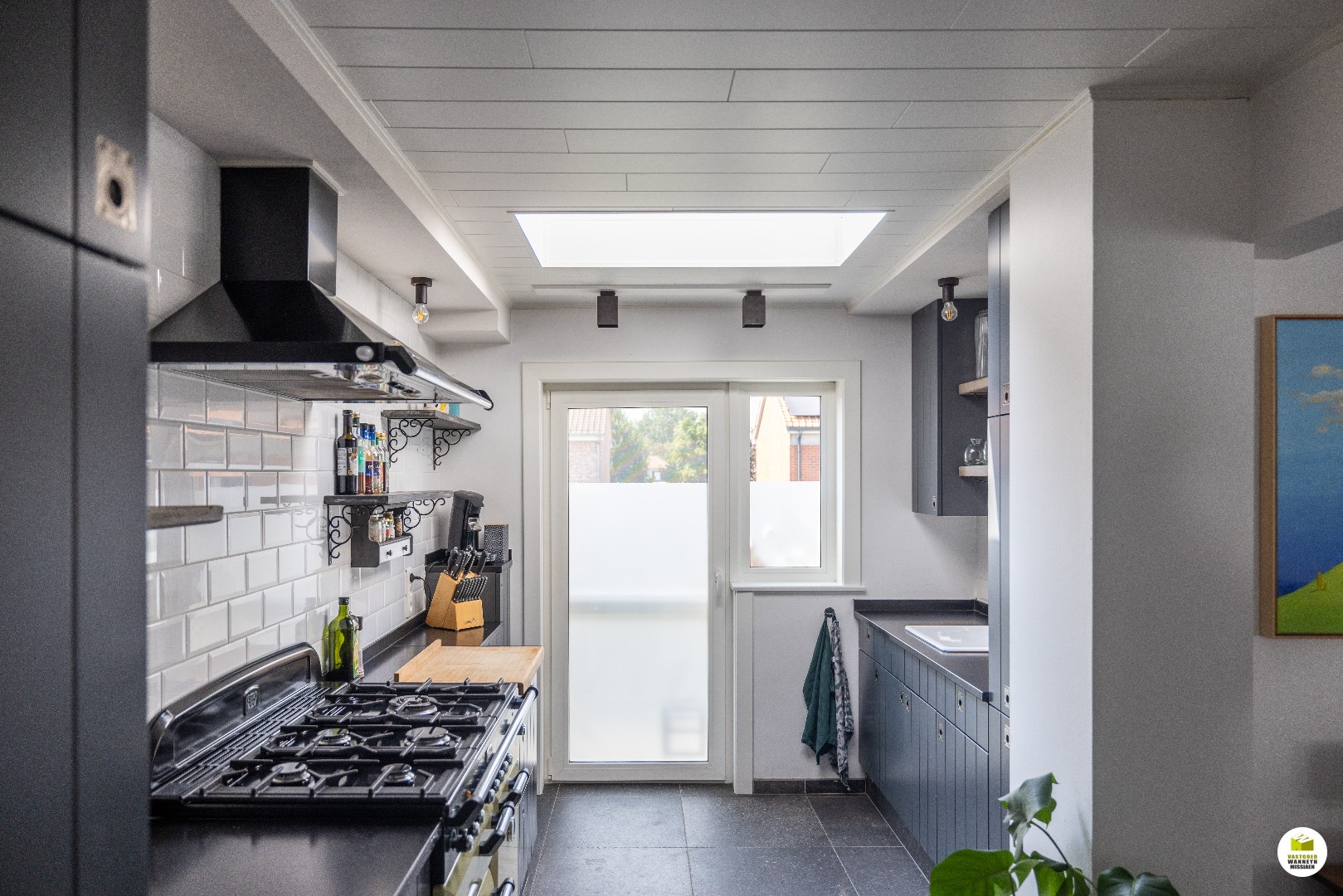 1ste verdiep: lichtrijke leefruimte en keuken uitgerust met Falcon fornuis en frigo, terras met buitentrap naar de tuin, afzonderlijk toilet