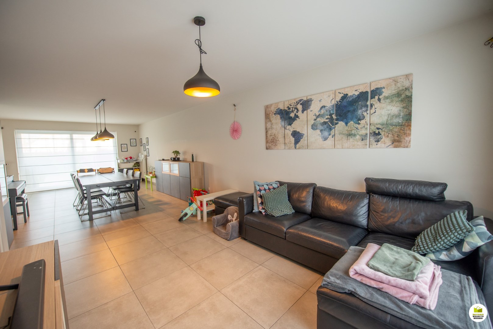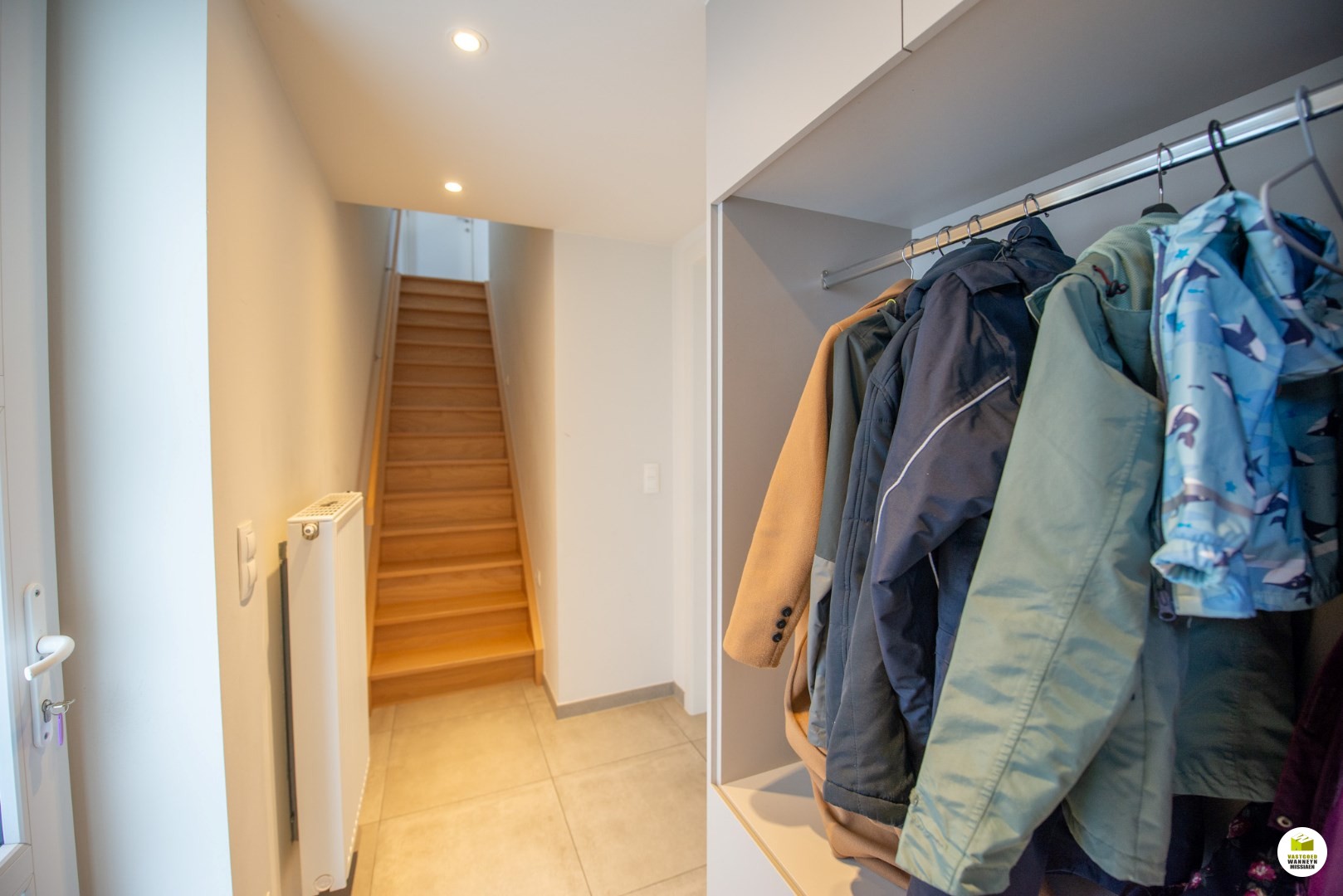 Inkomhal met ingebouwde vestiaire kast en gastentoilet. De woonkamer is lichtrijk en heel ruim.