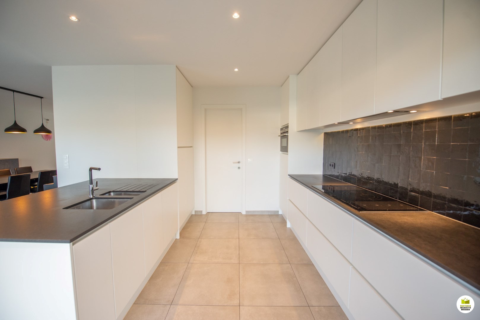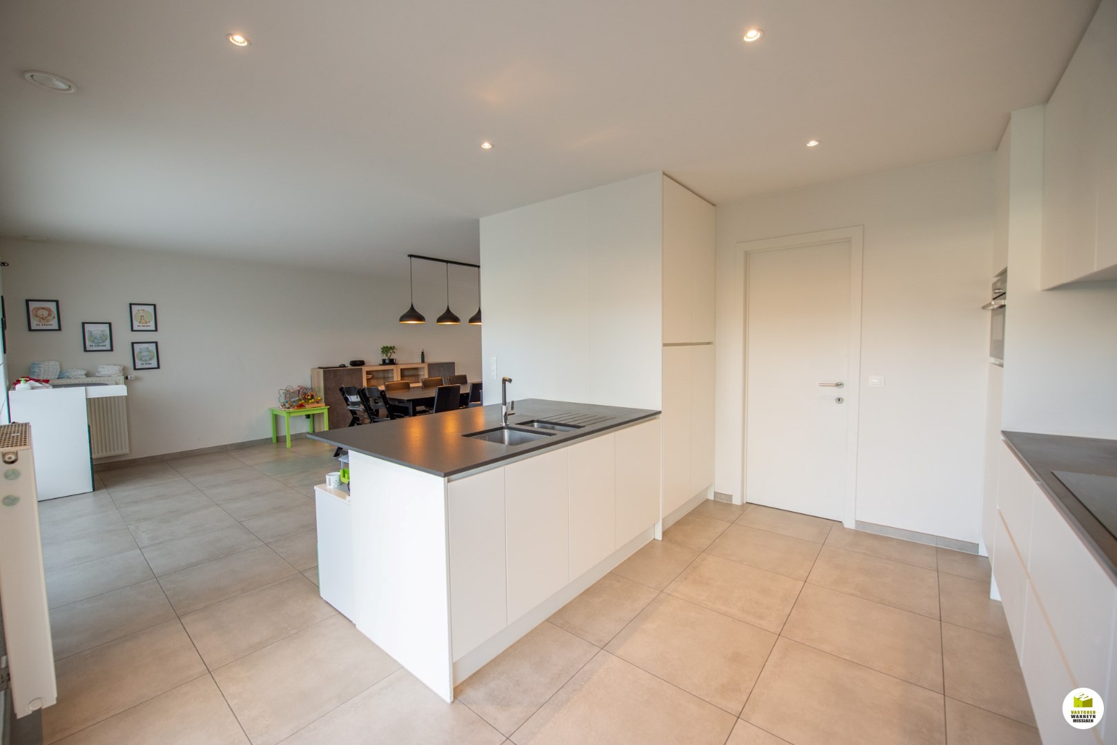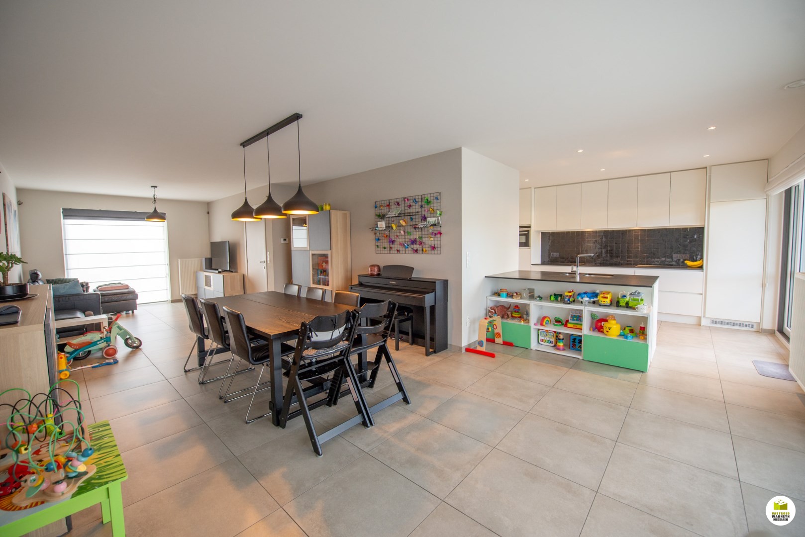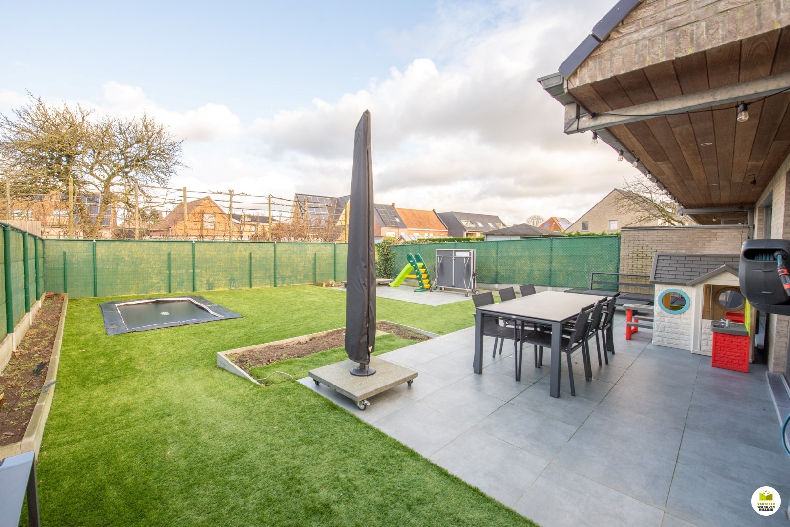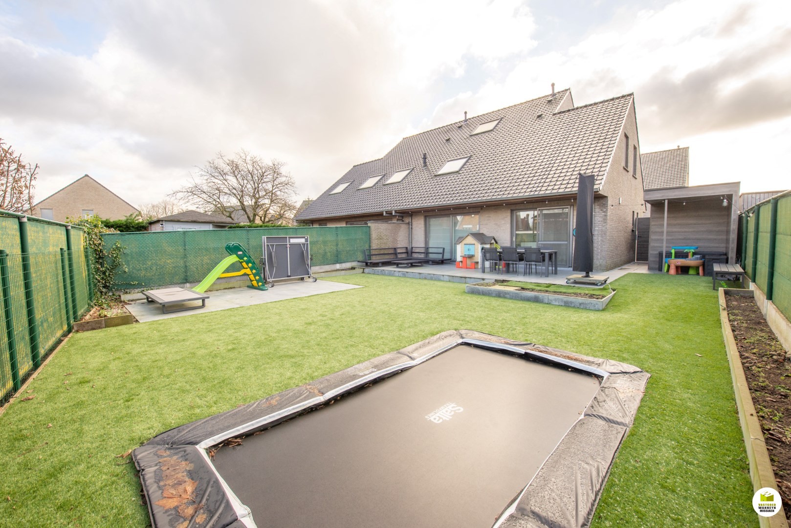 De zithoek vooraan meet 12m2, de eetplaats meet 33m2. Aan de tuinkant zijn er 2 grote schuiframen om vlot op het brede terras en de aangelegde tuin te kunnen. De tuin is ideaal georiënteerd voor wie namiddag en avondzon belangrijk vindt. De trampoline is ingebouwd en de berging is praktisch met bijhorend poortje. Hier staat de tuin altijd net door het kwaliteitsvol naturel kunstgras. De keuken is zeer ruim, stijlvol en volledig geïnstalleerd (voorzien van o.a inductiekookplaat, frigo, combi oven, ... vaatwas,..) aansluitend vinden we de wasplaats met extra berging onder de trap, toegang via een automatische poort, er kan geen wagen in maar is perfect voor iemand die zijn fiets, moto, kinderwagen,.. wilt opbergen.