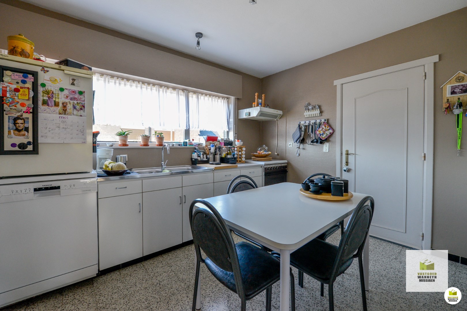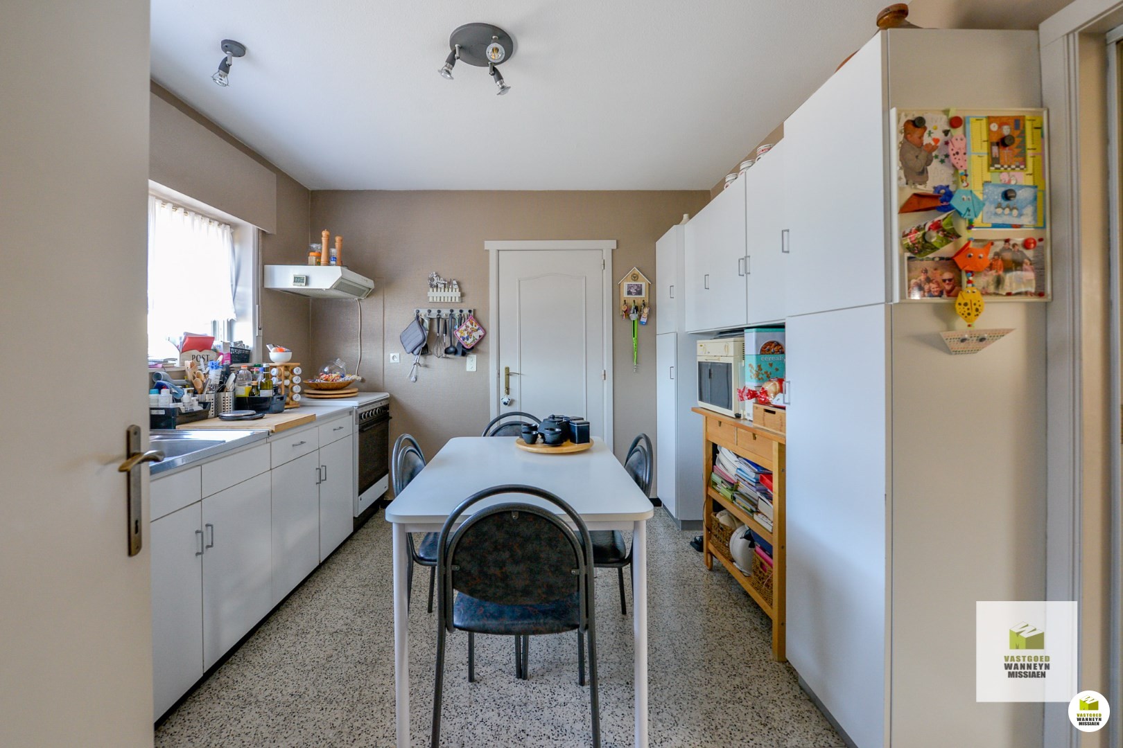 Wat meteen opvalt op het gelijkvloers is hoe lichtrijk het er is. De woonkamer is ruim en staat in verbinding met de veranda, voorzien van zonnewering. Waardoor er veel natuurlijk licht binnenkomt vanuit de ruime zuidgerichte tuin. De keuken, hoewel functioneel en voorzien van een fornuis met gasvuur, oven, frigo en aparte vaatwasmachine, kan worden aangepast aan persoonlijke smaak en behoeften. Vanuit de keuken is er ook zicht naar buiten.