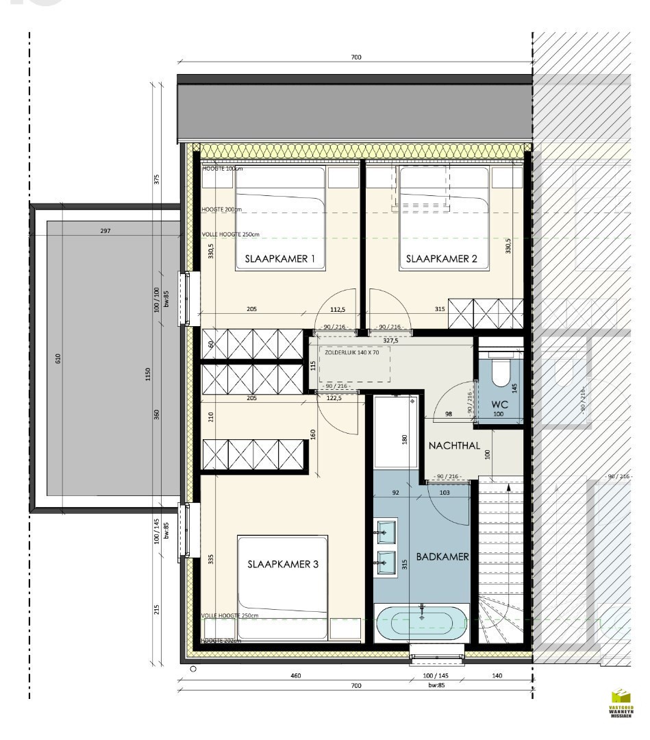 Inkomhal met gastentoilet. Hoek voor speelkamer of bureau, woonkamer en open keuken meten samen maar liefst 53 m2 en zijn gericht naar de zuid gerichte tuin. De ramen zijn groot, tot op de grond en brengen daardoor veel ... natuurlijk daglicht binnen. Naast de keuken vinden we de wasplaats/berging onder de trap. De slaapkamers bereiken we vanuit de inkomhal. Er zijn er 3 en meten respectievelijk 10 m2, 10m2 en 17m2. In de grootste kamer kan je zelfs een dressing voorzien. De badkamer is ingericht met een ligbad, een dubbele lavabo en een inloopdouche. Het toilet is bovendien apart. Er is nog een valluik naar de bergzolder.