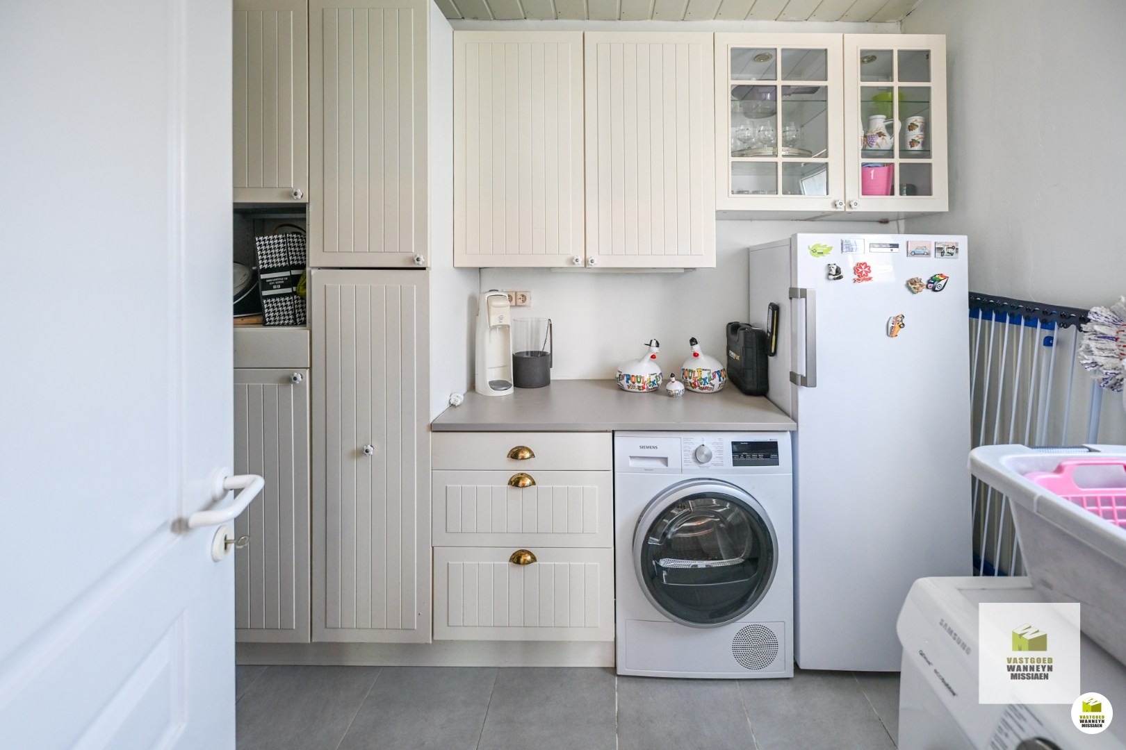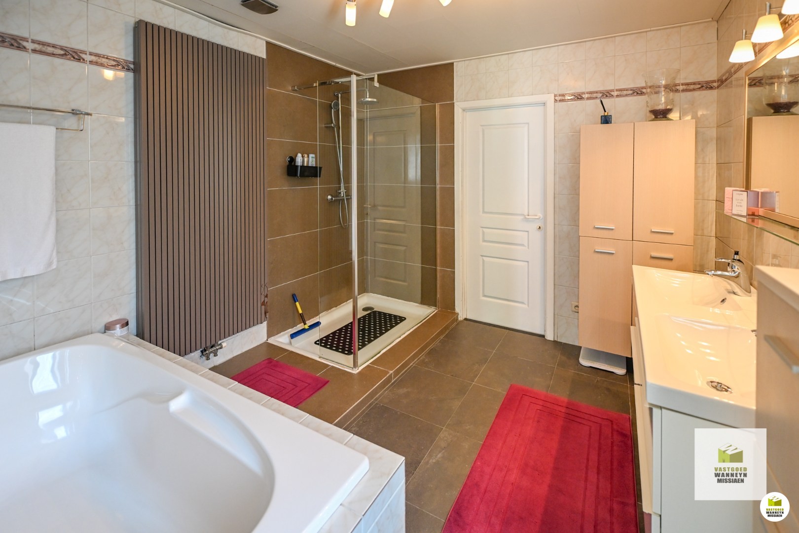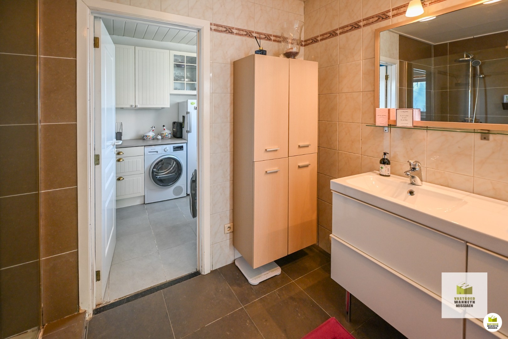 Op het gelijkvloers bevindt zich eveneens de badkamer, voorzien van zowel een inloopdouche als een ligbad en een dubbele wastafel. Aansluitend is er een praktische bergruimte/wasplaats. Er is ook een kleine droge kelder met waterontharder.