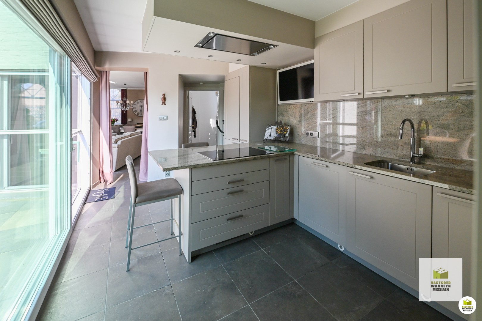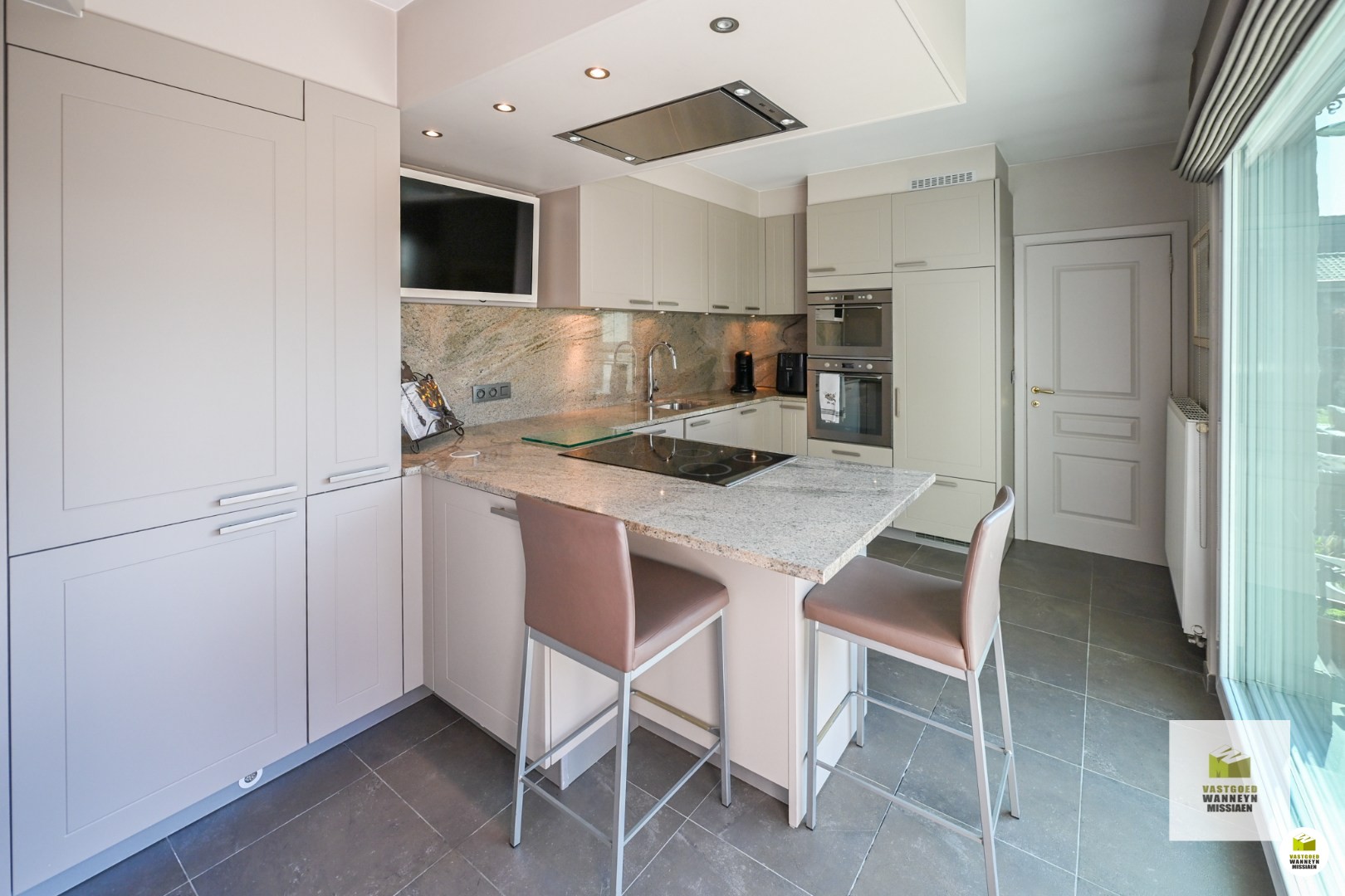 De keuken, afgewerkt met een granieten werkblad, straalt klasse uit en is uitgerust met een inductiekookplaat, vaatwas, koelkast, oven en microgolfoven.