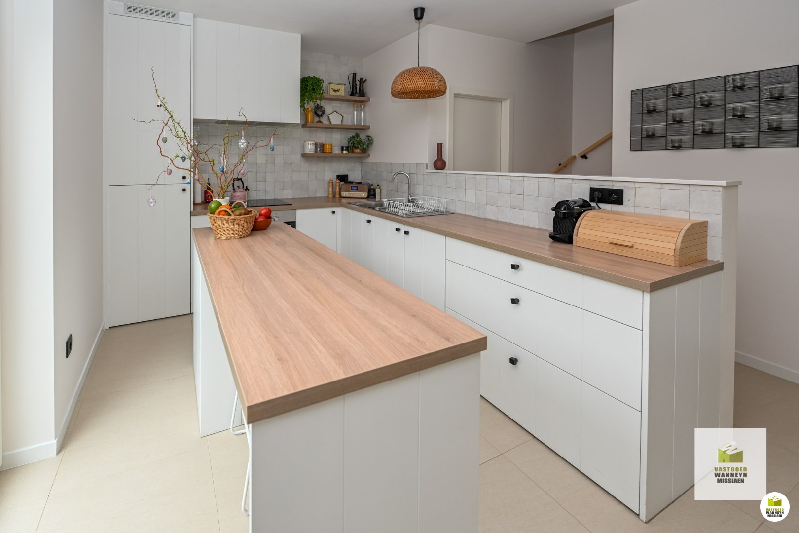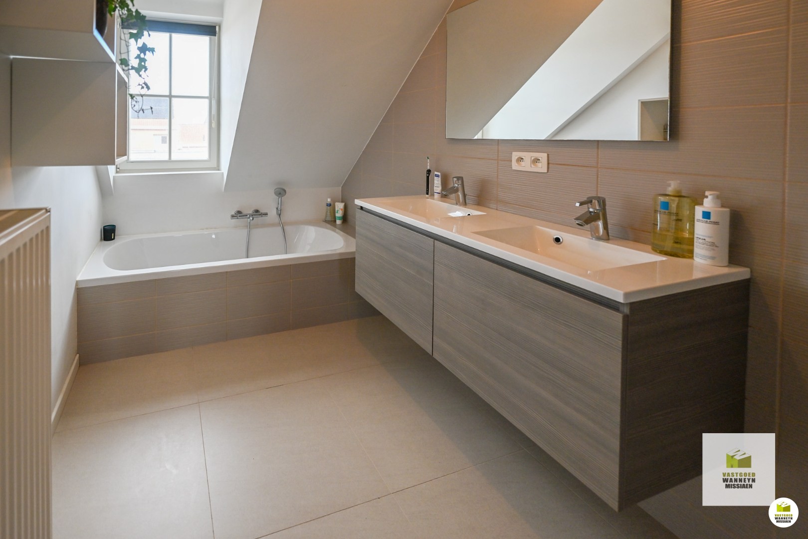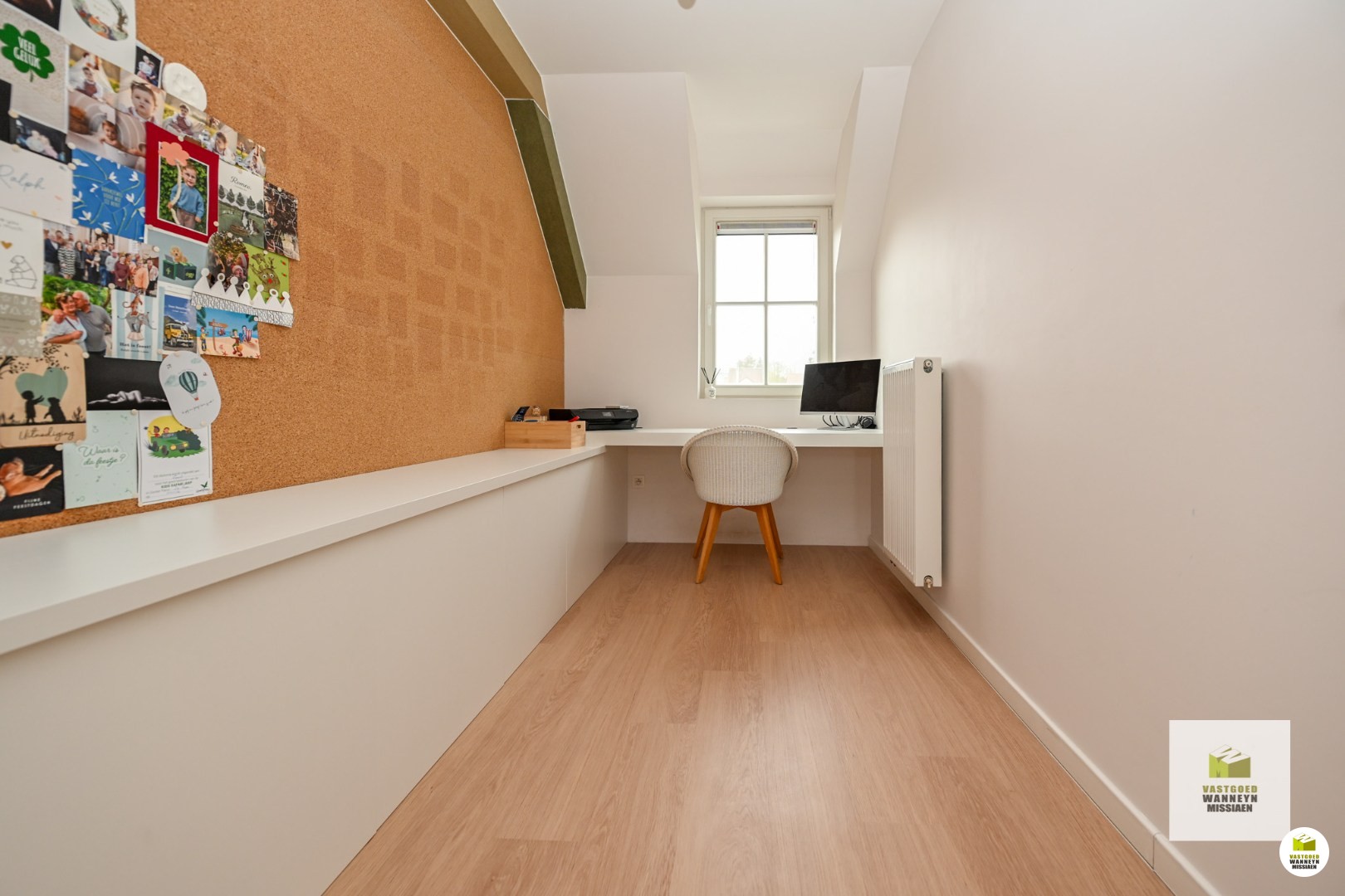 Indeling: inkom met gastentoilet, bergplaats en een praktische wasplaats, lichtrijke leefruimte met zonnewering en een open keuken die is uitgerust met een kookplaat, frigo, microgolf en oven, berging onder de trap. Via de mooie houten trap komen we op de 1ste verdieping waar zich 2 slaapkamers bevinden, een bureau, dressing, toilet alsook een mooie badkamer met ligbad, douche en wastafel. Op de 2de verdieping bevindt zich de masterbedroom met ingebouwde kasten alsook een logeerkamer. De tuin heeft een mooie zuid-west oriëntatie met aangelegd terras en een groot tuinhuis van 40m2. Er is centrale verwarming op aardgas alsook 3 airco's, deze kunnen zowel koelen en warmen. De woning is uitgerust met 8 zonnepanelen.