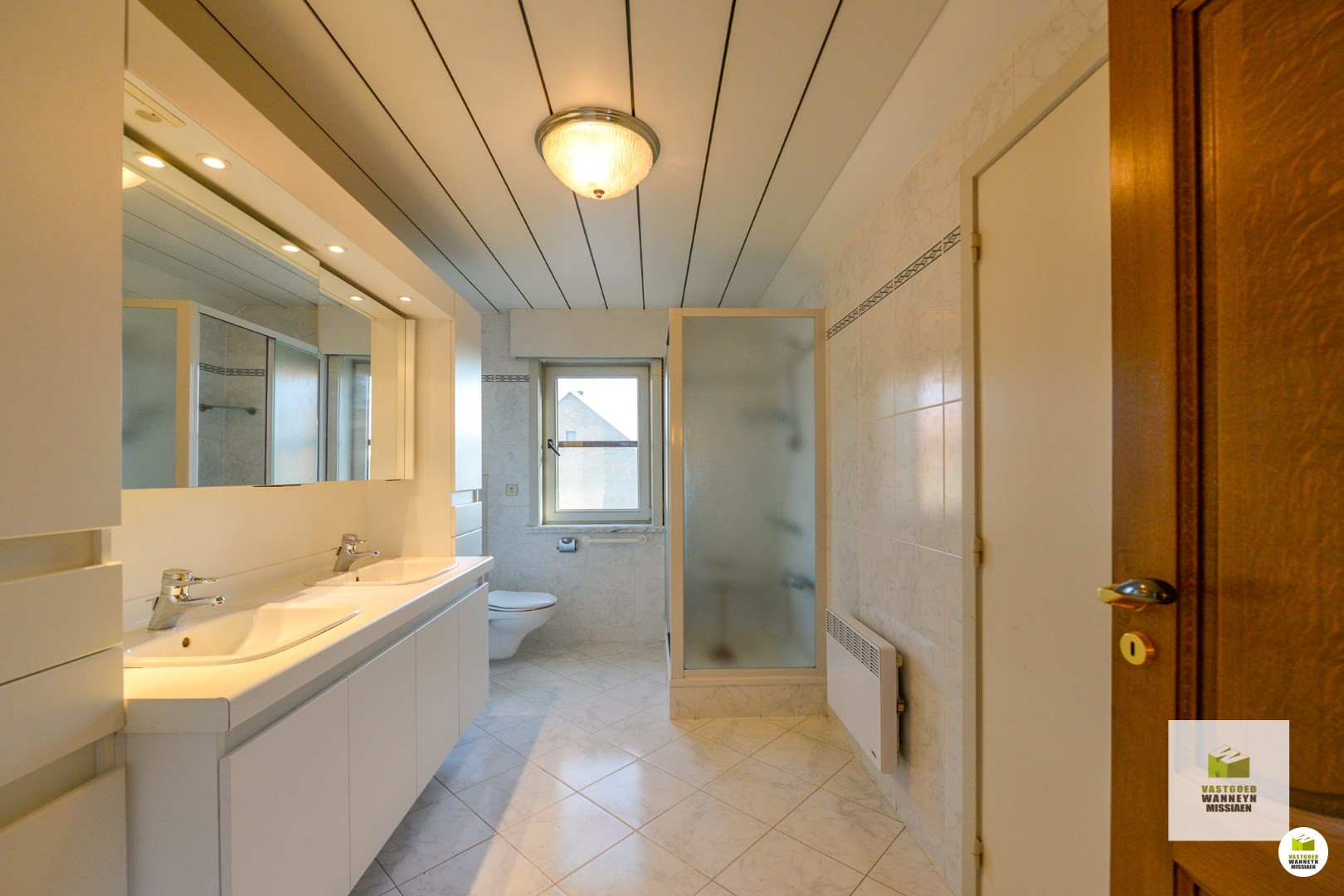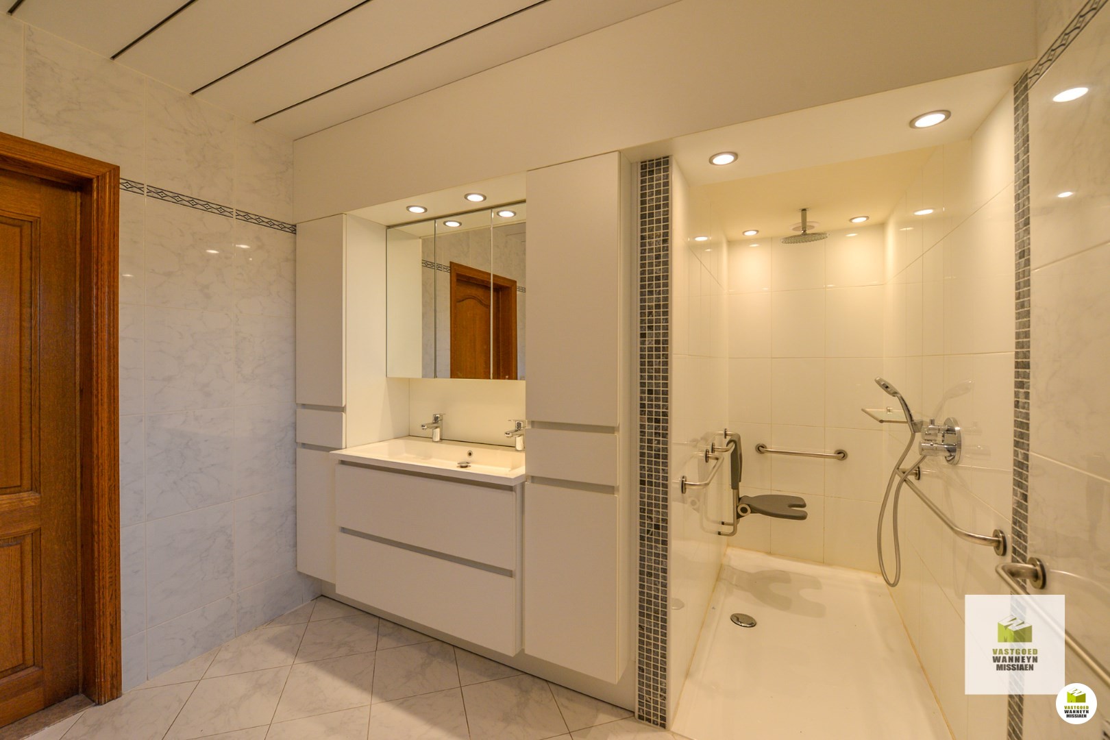 Vervolgens is er nog een gelijkvloerse slaapkamer met ernaast een gelijkvloerse badkamer. De badkamer werd uitgerust met een extra toilet, ligbad, dubbele lavabo en ruime inloopdouche.