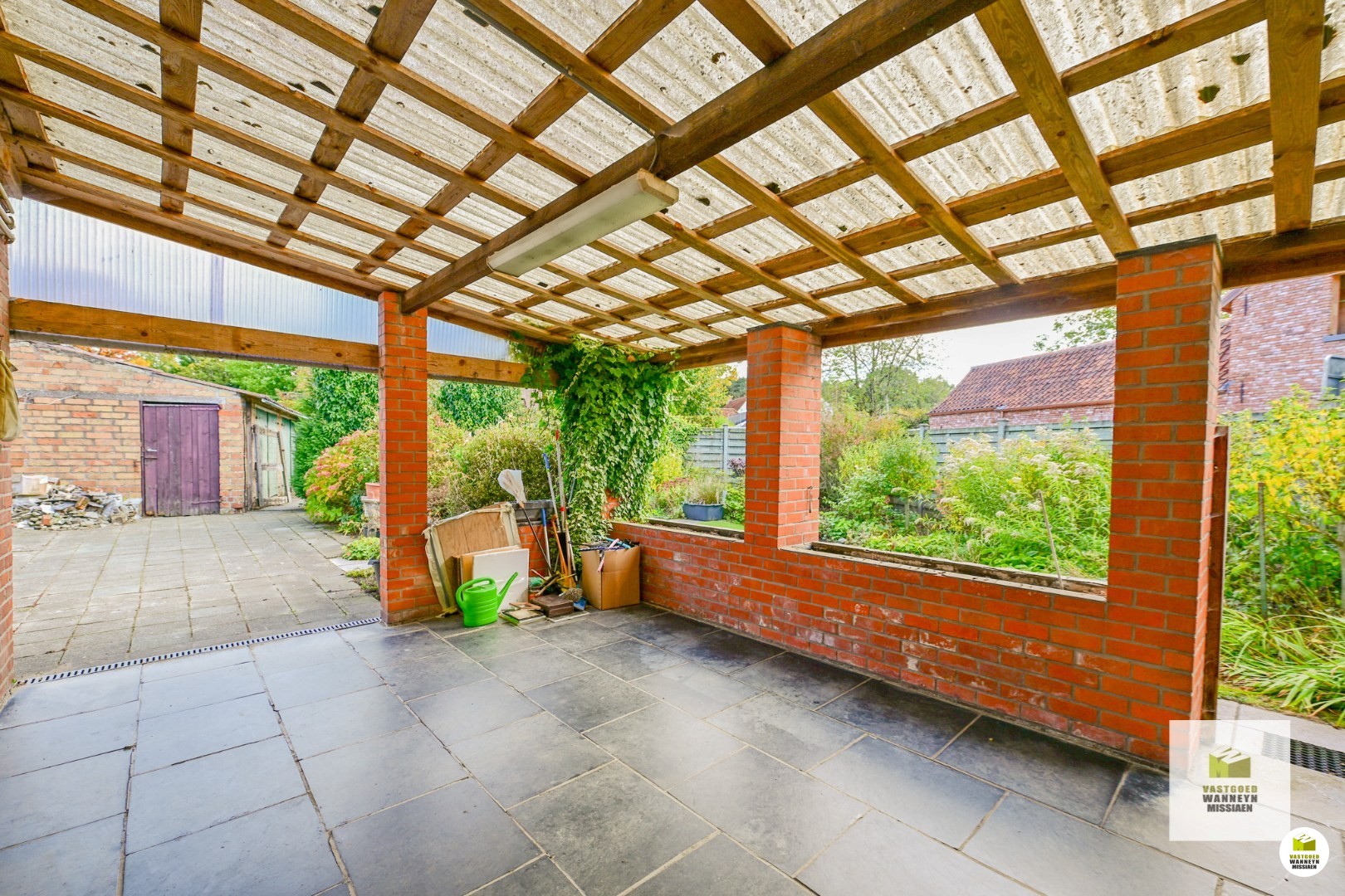 Indeling: binnenkomen in de aparte inkomhal, vervolgens de lichtrijke leefruimte met zithoek en eetplaats. Vanuit de zithoek is zicht op de gezellige houtkachel. Hier achter is de keuken gelegen, die basis is ingericht maar ruim genoeg is zodoende er ook een eettafel kan geplaatst worden. De keuken geeft via de achterdeur toegang tot het overdekt terras en de tuin. Vanuit de keuken komen enerzijds terug in de inkomhal en anderzijds in het achterste gedeelte van de woning waar de badkamer met bad, lavabo en toilet en de eerste slaapkamer gelegen zijn. In de inkom is nog toegang tot een tweede slaapkamer, de berging en een derde slaapkamer. ... Deze geeft dan terug uit tot het achterste deel met de slaapkamer en badkamer. In totaal zijn er dus 3 slaapkamers en beschikt de woning op heden over 132m2 bewoonbare oppervlakte. Voldoende ruimte voor voldoende mogelijkheden dus! De tuin is zuidgericht, waardoor u de hele dag in de zon kunt genieten. In de tuin is nog een tuinberging terug te vinden, alsook een garage met oprit die toegankelijk is via de poort aan de zijkant van het perceel.