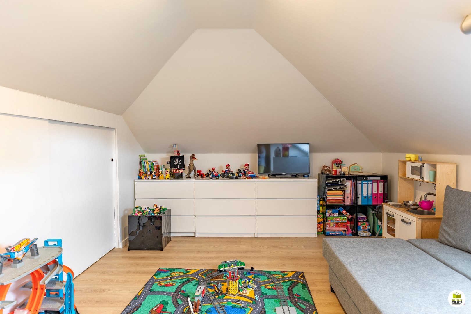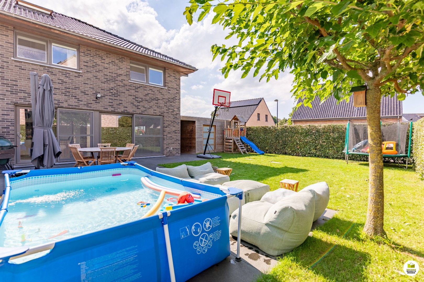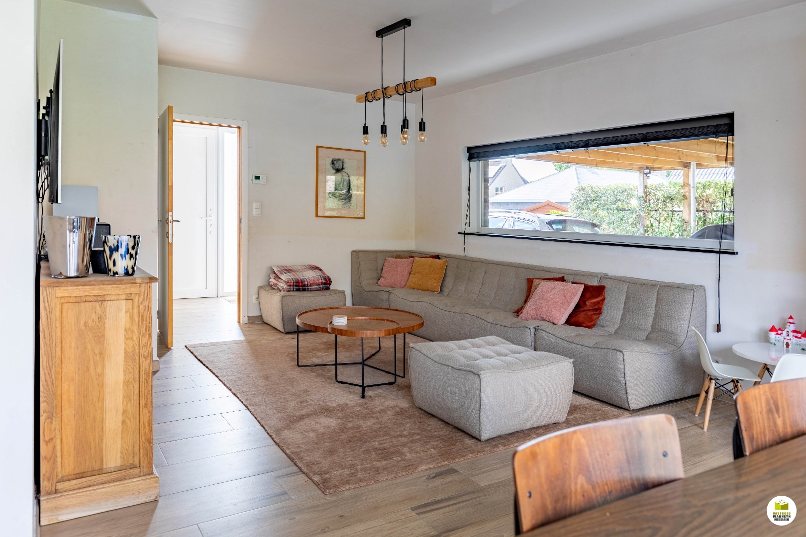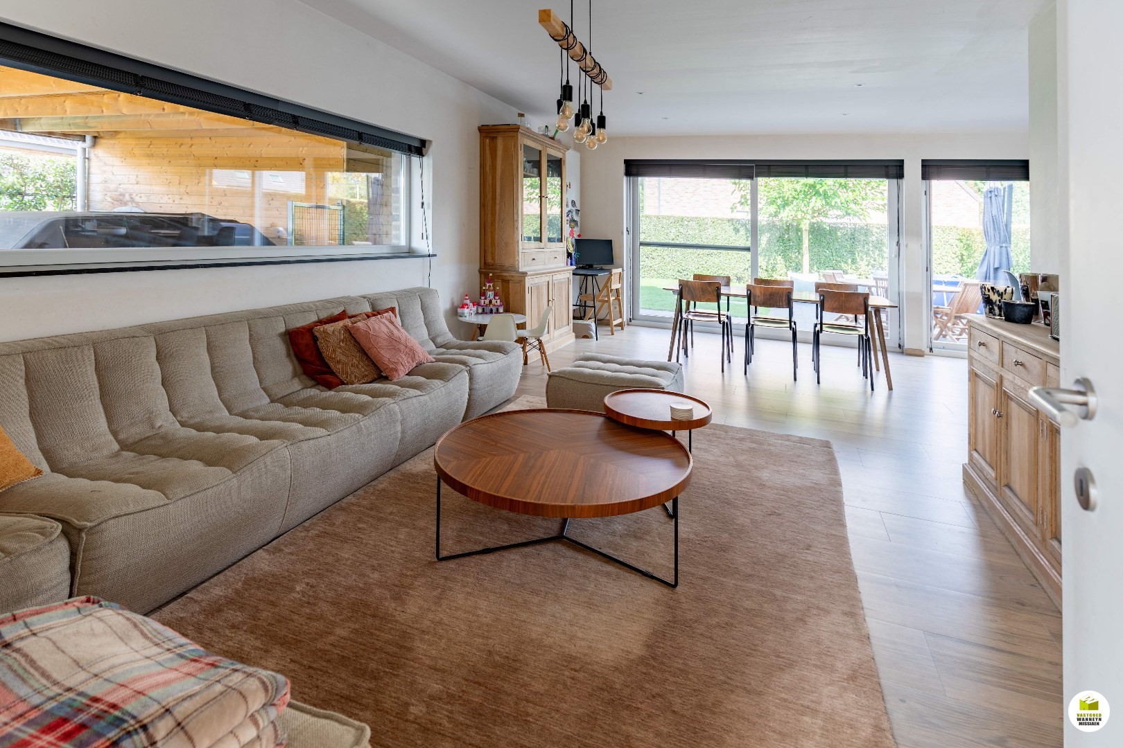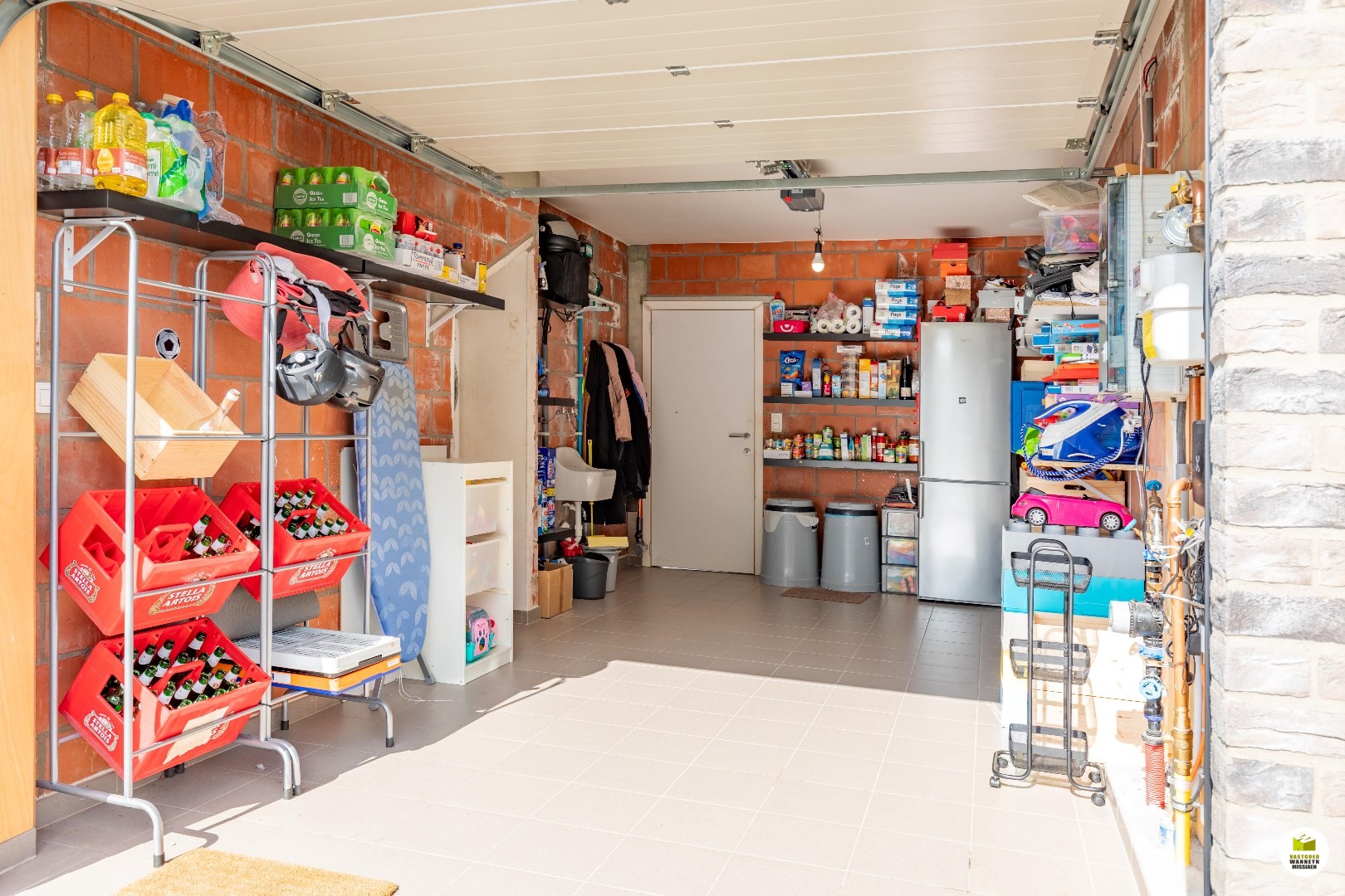 Binnenin de woning vindt u een inkom met gastentoilet, een gezellige leefruimte die dankzij de grote ramen veel natuurlijk licht heeft. De open keuken is volledig uitgerust met vaatwas, combi oven/microgolf en werkblad in natuursteen. Vanuit de leefruimtes heb je zicht en toegang naar de mooie tuin met groot terras. Er is ook een tuinhuis met een carport. Ook is er vooraan nog extra parkeerruimte. Naast de keuken bevindt zicht de garage met sectionaalpoort. Op de verdieping bevinden zich 3 slaapkamers alsook een dressing met vaste trap naar de zolderkamer. Er is een badkamer met dubbele lavabo en inloopdouche en toilet.