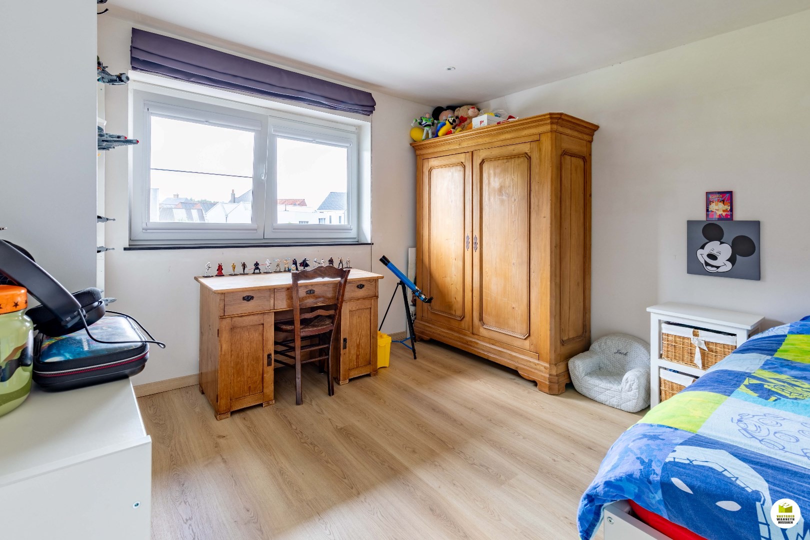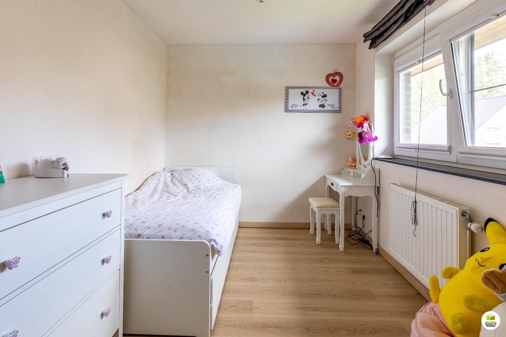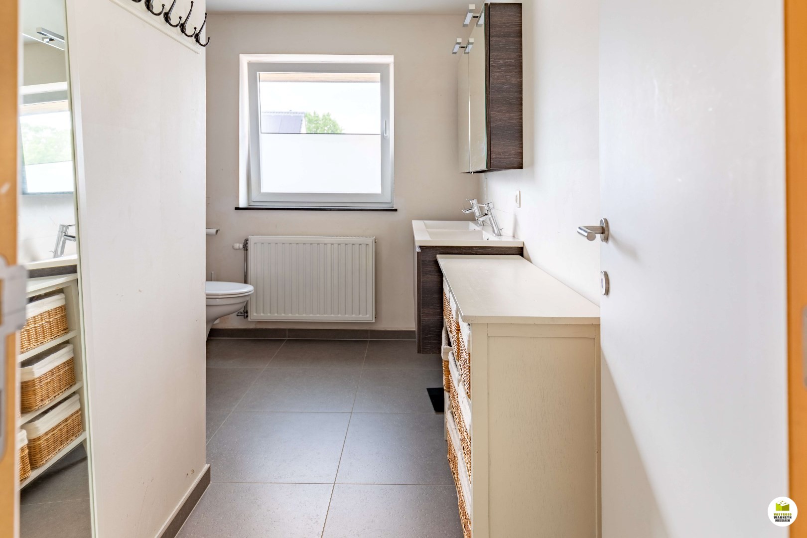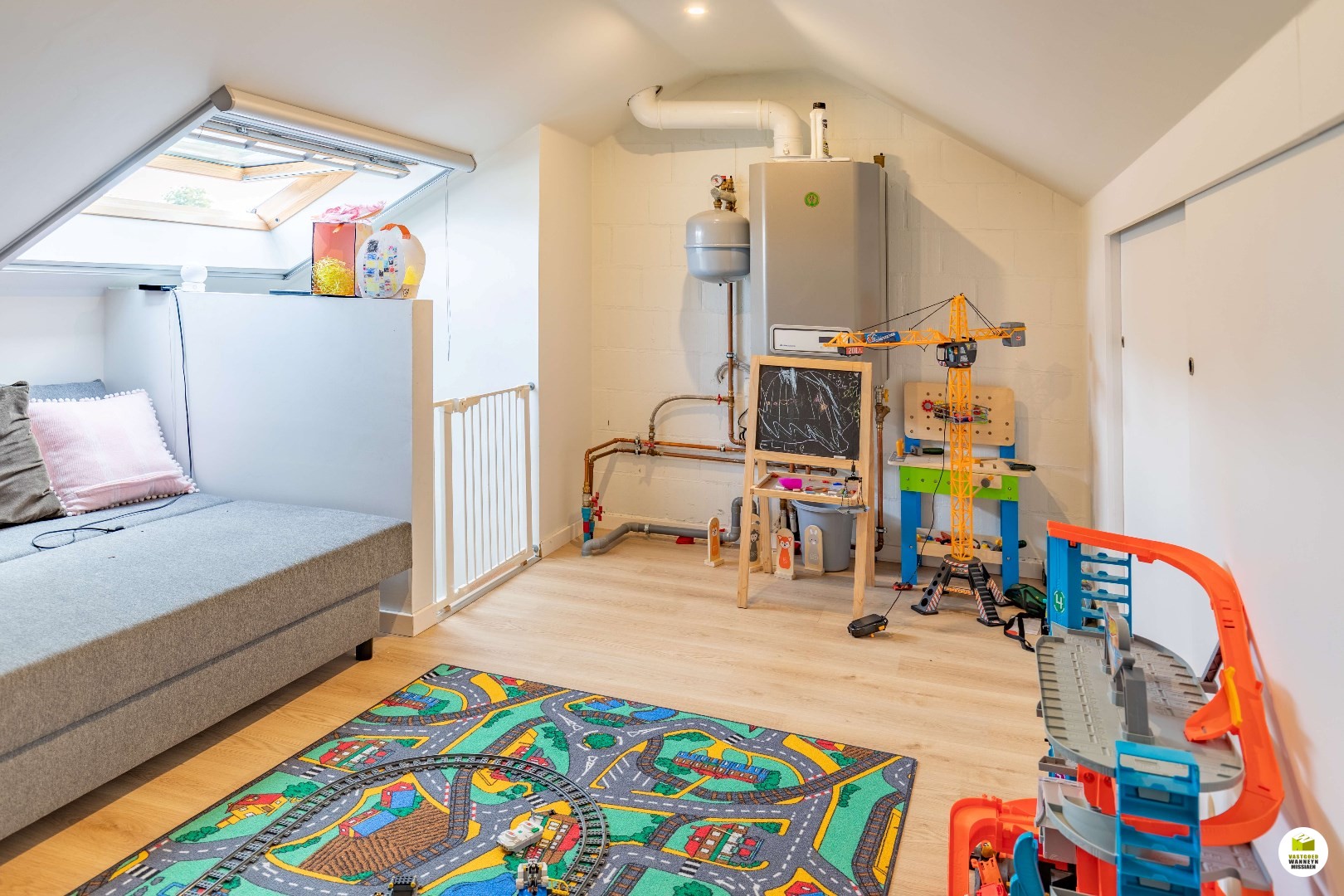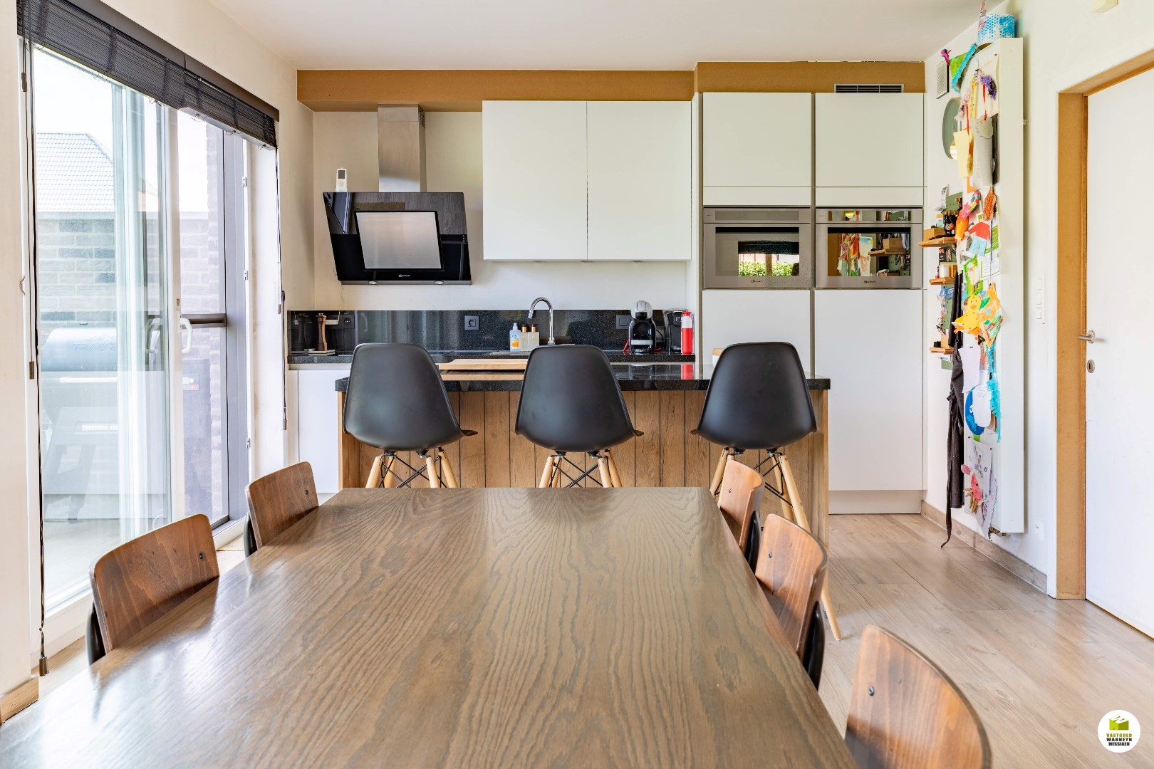 Binnenin de woning vindt u een inkom met gastentoilet, een gezellige leefruimte die dankzij de grote ramen veel natuurlijk licht heeft. De open keuken is volledig uitgerust met vaatwas, combi oven/microgolf en werkblad in natuursteen. Vanuit de leefruimtes heb je zicht en toegang naar de mooie tuin met groot terras. Er is ook een tuinhuis met een carport. Ook is er vooraan nog extra parkeerruimte. Naast de keuken bevindt zicht de garage met sectionaalpoort. Op de verdieping bevinden zich 3 slaapkamers alsook een dressing met vaste trap naar de zolderkamer. Er is een badkamer met dubbele lavabo en inloopdouche en toilet.