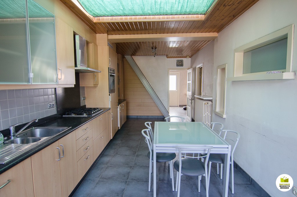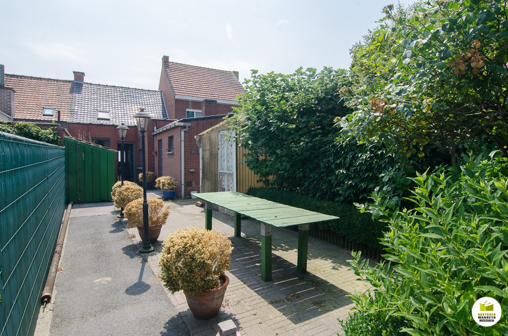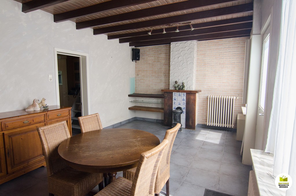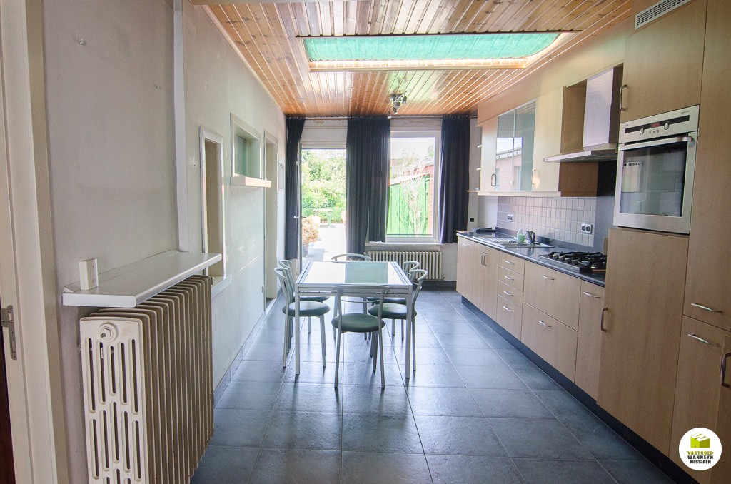 Knusse starterswoning 2 slaapkamers, grote onderhoudsvriendelijke tuin met uitweg en grote garage (33m2)\n\nLigging: op 500m van het station, door centrumligging quasi alles binnen wandelafstand bereikbaar.\n\nIndeling: we komen binnen in de woonkamer, knusse eetplaats en tv-hoek. De keuken is nieuw van 2004 en is goed geïnstalleerd (AEG toestellen), naar aanleiding van die werken werden ook de sanitaire leidingen vernieuwd, alsook werd er toen een nieuwe vloer gelegd. Aansluitend vinden we de badkamer (zitbad) met apart toilet. De badkamer kan flink groter gemaakt worden. De hobby- werkplaats sluit aan de wasplaats. Vanuit de keuken heb je zicht op de tuin, serre en het terras. Er is een tuinhuis en een grote garage voorzien van een sectionale poort (33m2). Op de eerste verdieping zijn er 2 slaapkamers. Alle hoekjes en kantjes werden optimaal gebruikt door nissen en inbouwkasten. Er is een grote zolder, toegankelijk met een schuiftrap.\n\nPluspunten: \n- overal centrale verwarming (mazout)\n- nieuwe keuken 2004\n- centrumligging doch ...