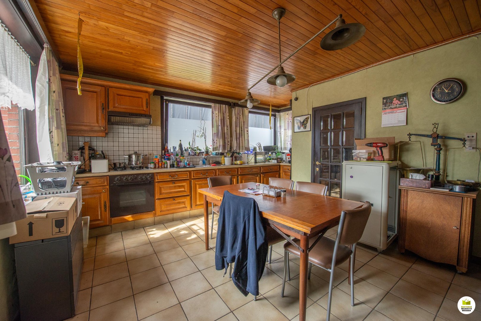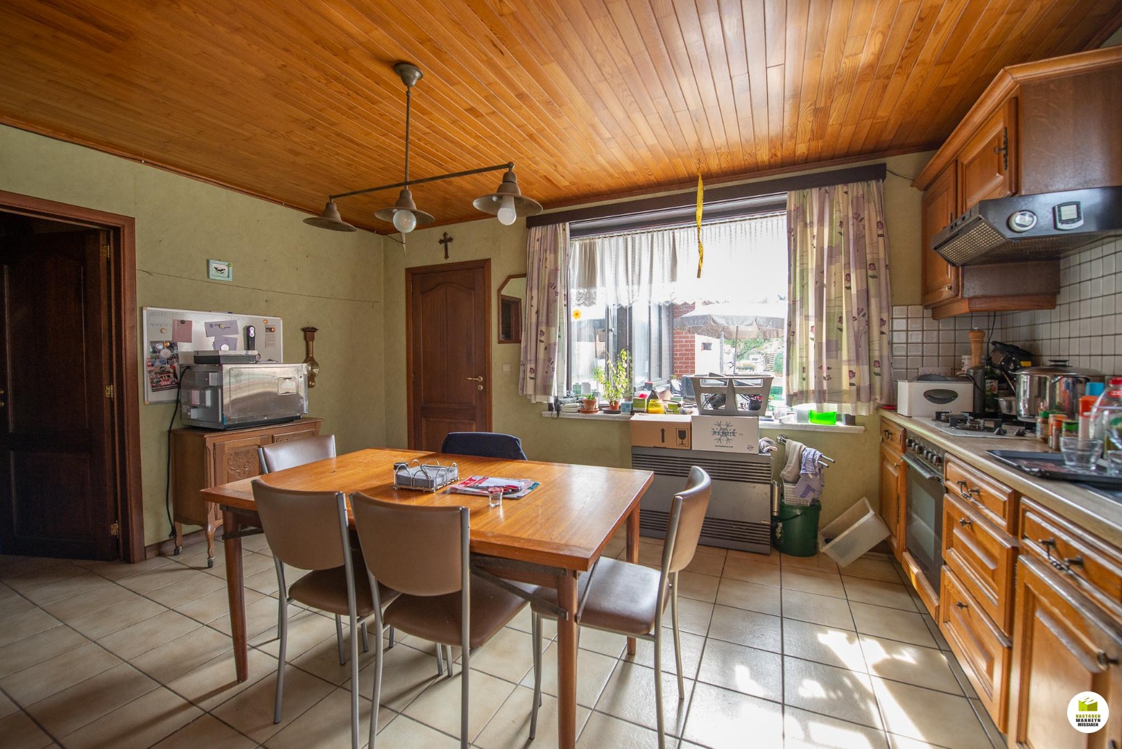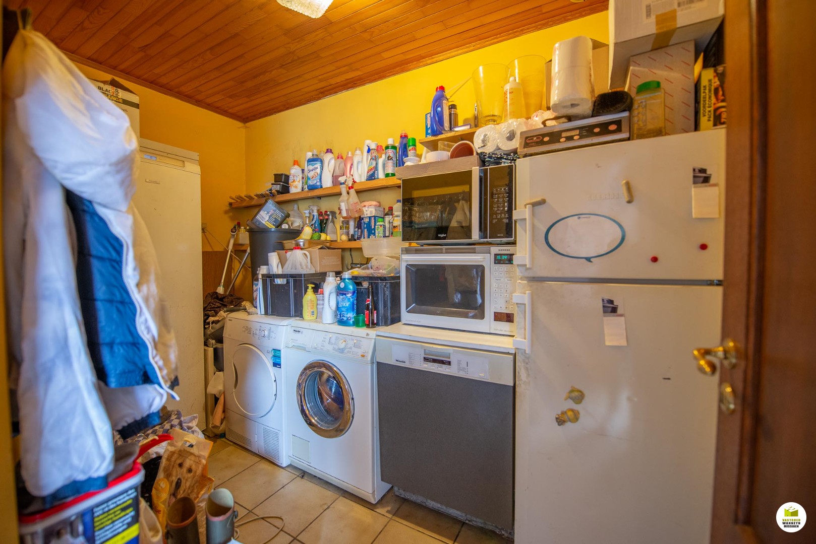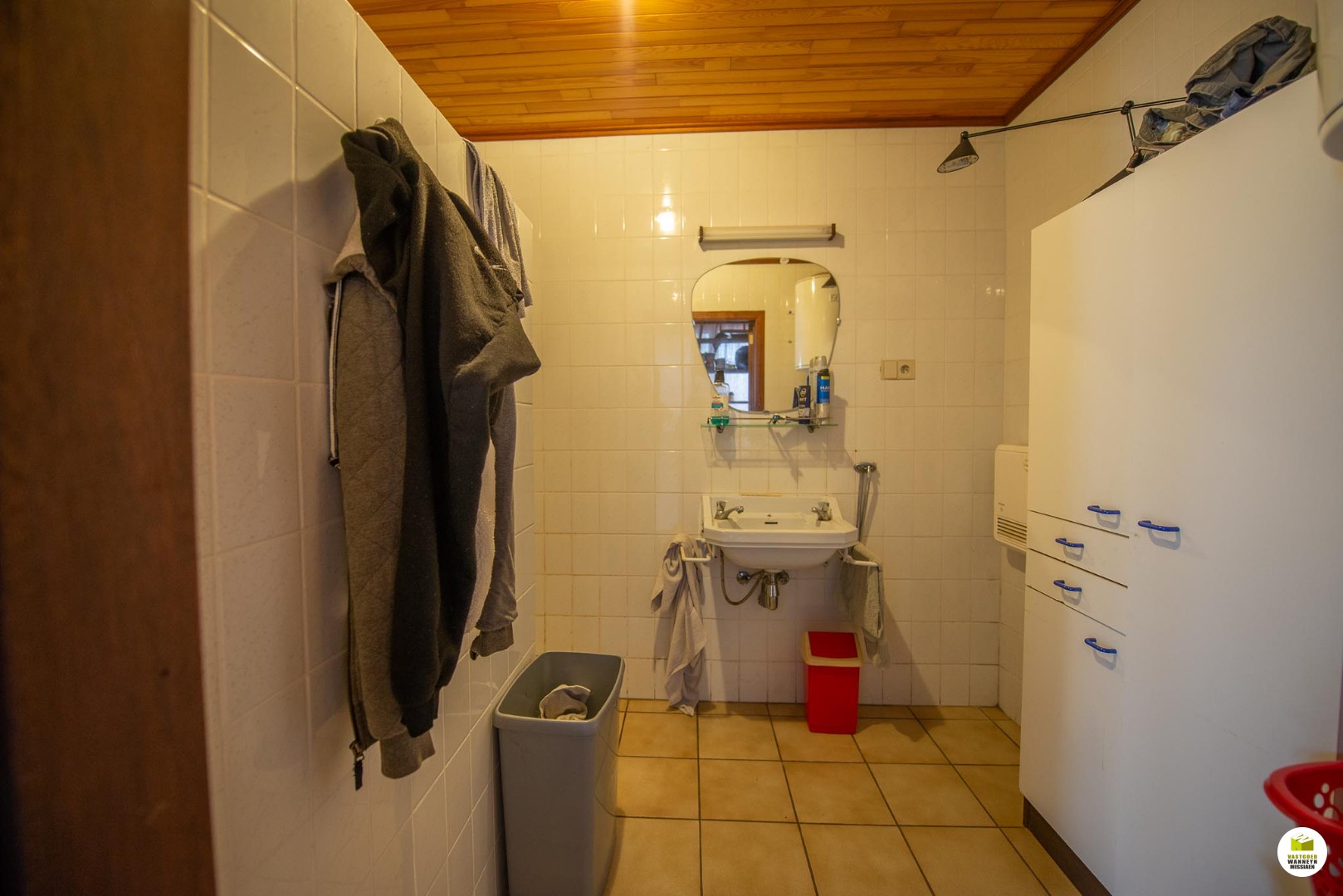 Indeling woning: inkom met rechtstreekse toegang tot de achtergelegen keuken en de leefruimte. Beide ruimtes worden verwarmd door middel van een gaskachel, centrale verwarming is in de woning niet aanwezig. De leefruimte wordt verbonden met de keuken via de eetplaats, waar voldoende ruimte is om een grote eettafel te plaatsen. De keuken is basis ingericht en uitgerust met een oven en kookplaat. Aanpalend aan de keuken is er een kelder én een koele berging. In de keuken is het leuk kokkerellen met zicht op de zongerichte tuin. In deze aanbouw vinden we als een ruime wasplaats, alsook een afzonderlijk toilet en een gelijkvloerse badkamer met lavabo en inloopdouche. Er is ook een gelijkvloerse slaapkamer die ook gebruikt kan worden als bureauruimte. Ook van hieruit is er zicht op de grote ... tuin.