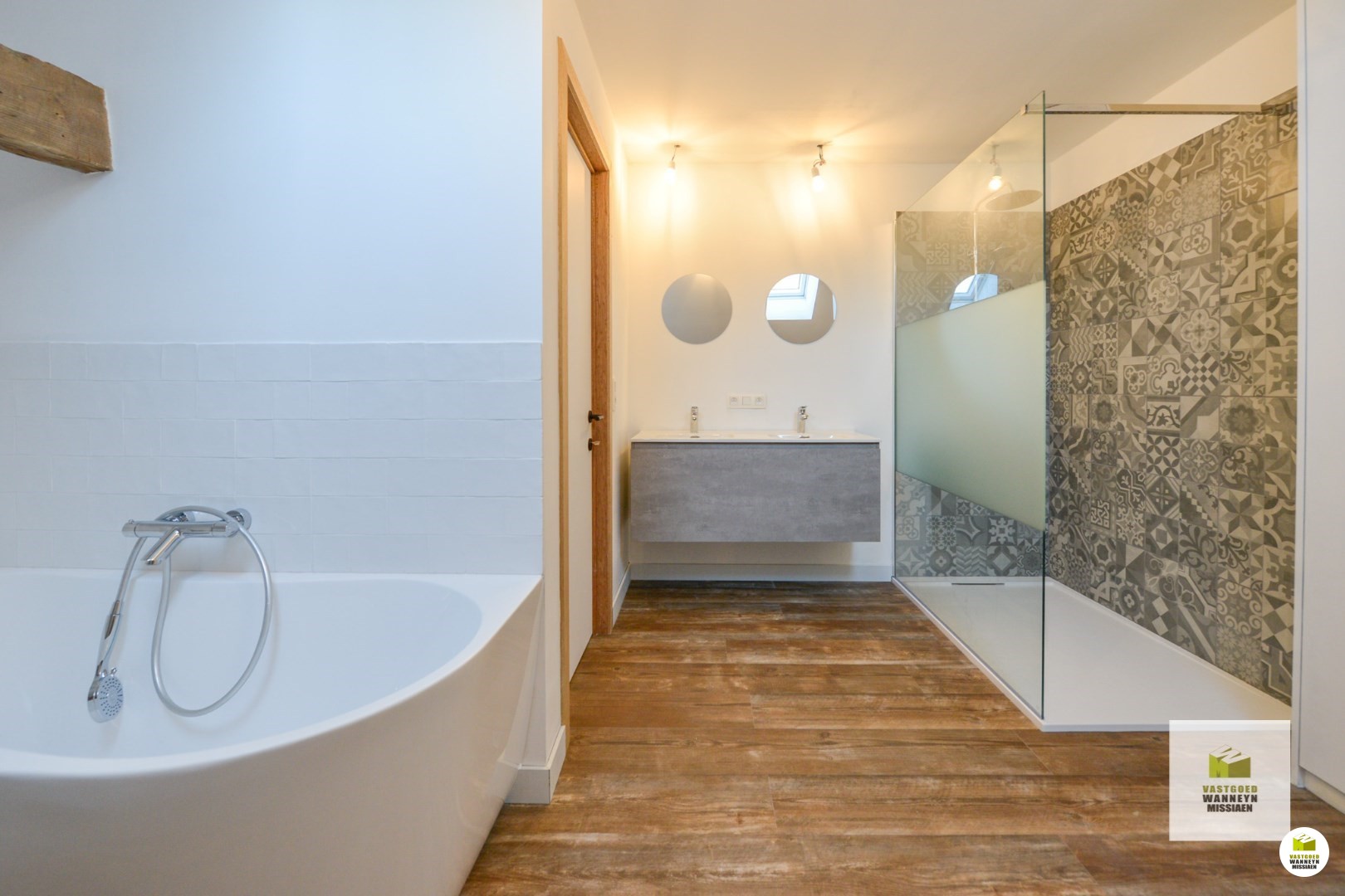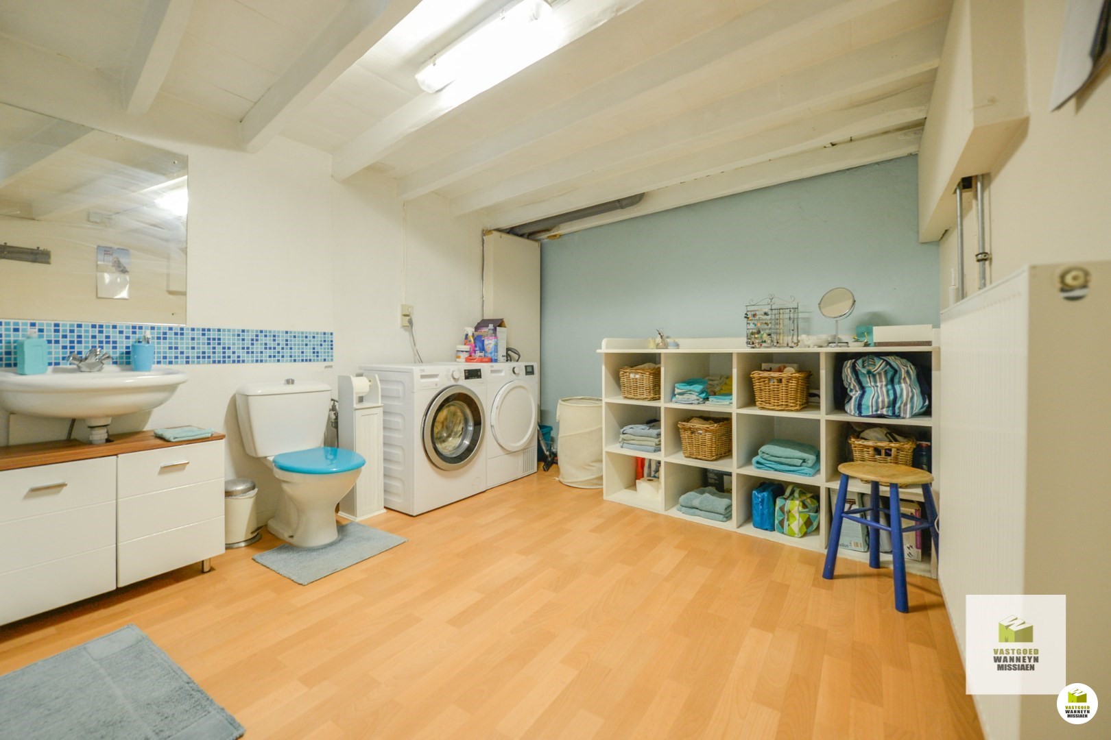 Via de trap bereiken we de voute, waar de badkamer en wasplaats gelegen zijn. De badkamer werd uitgerust met een douchebad en lavabo. Hier is ook aansluiting voor wasmachine en droogkast.