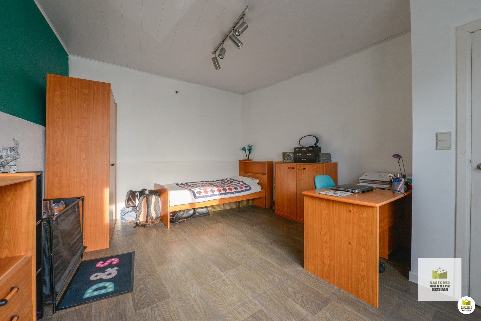 Naast de leefruimte is de eerste gelijkvloerse slaapkamer gelegen. Deze kan ook perfect dienen tot bureauruimte, hobbykamer, berging...