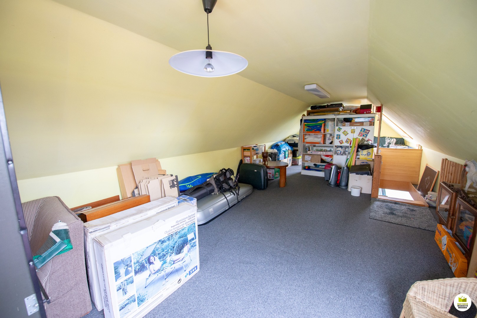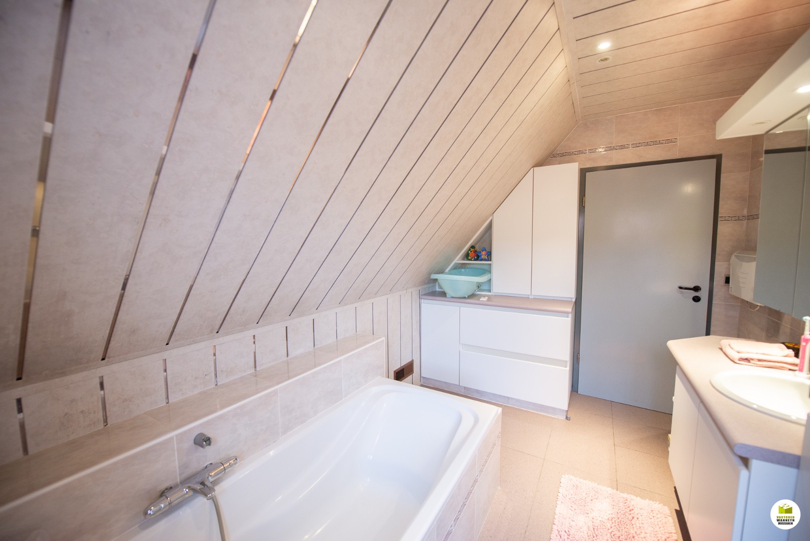 Ruime inkomhal met gastentoilet, woonkamer met zithoek (houtkachel), schuifraam naar het terras en mooi uitgestrekt zicht over de tuin en de aanpalende weilanden, ruime praktische tijdloze keuken met eetplaats en toegang naar de droge kelder. De eerste verdieping bereiken we via de inkomhal waar er 3/4 slaapkamer zijn de slaapkamers meten elk : 17m2, 18m2, 13m2 en 7m2, een badkamer voorzien van ligbad, lavabo, veel bergruimte en een apart (hang)toilet. Via een schuiftrap toegang naar de geïsoleerde (15cm) hele grote bergzolder.