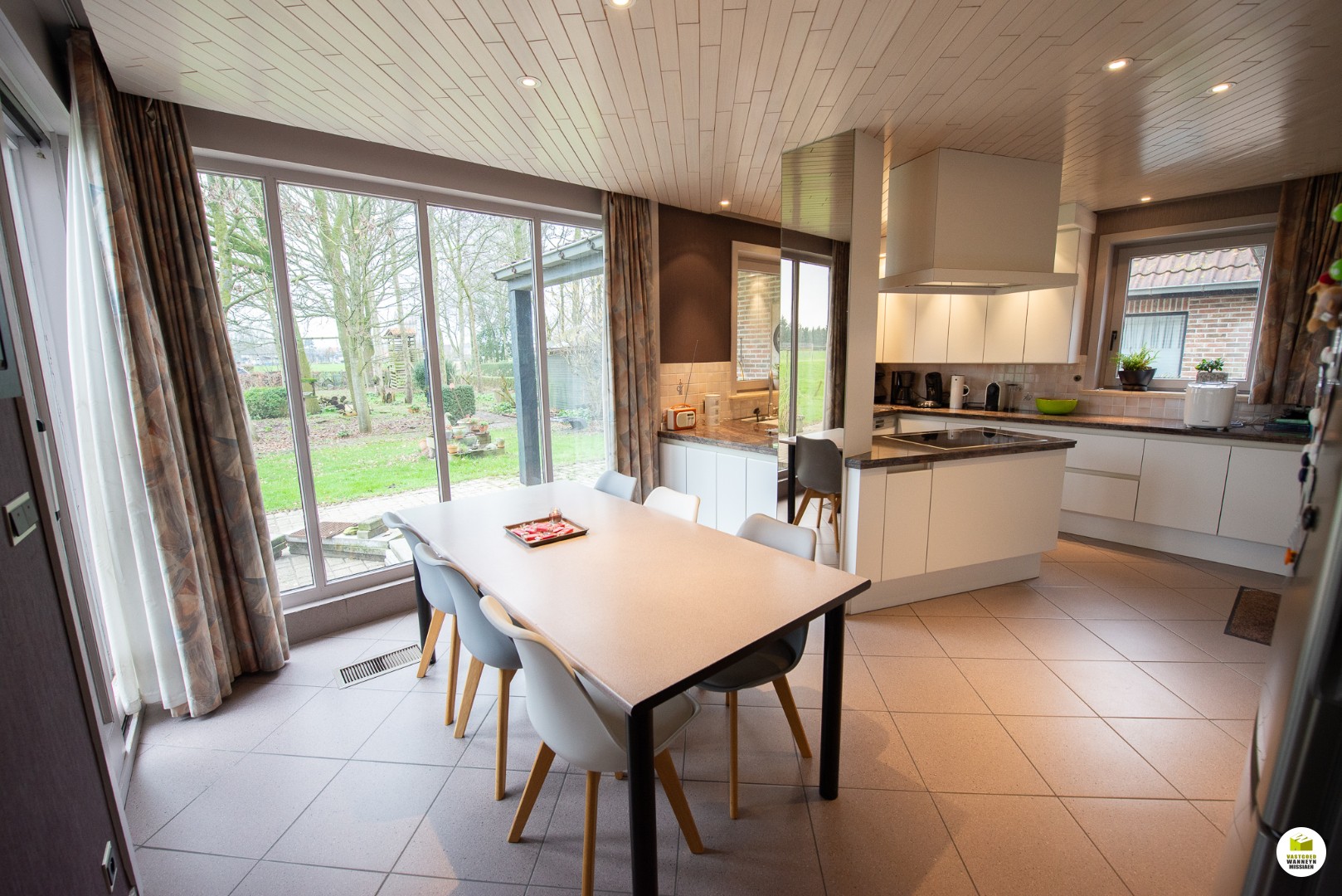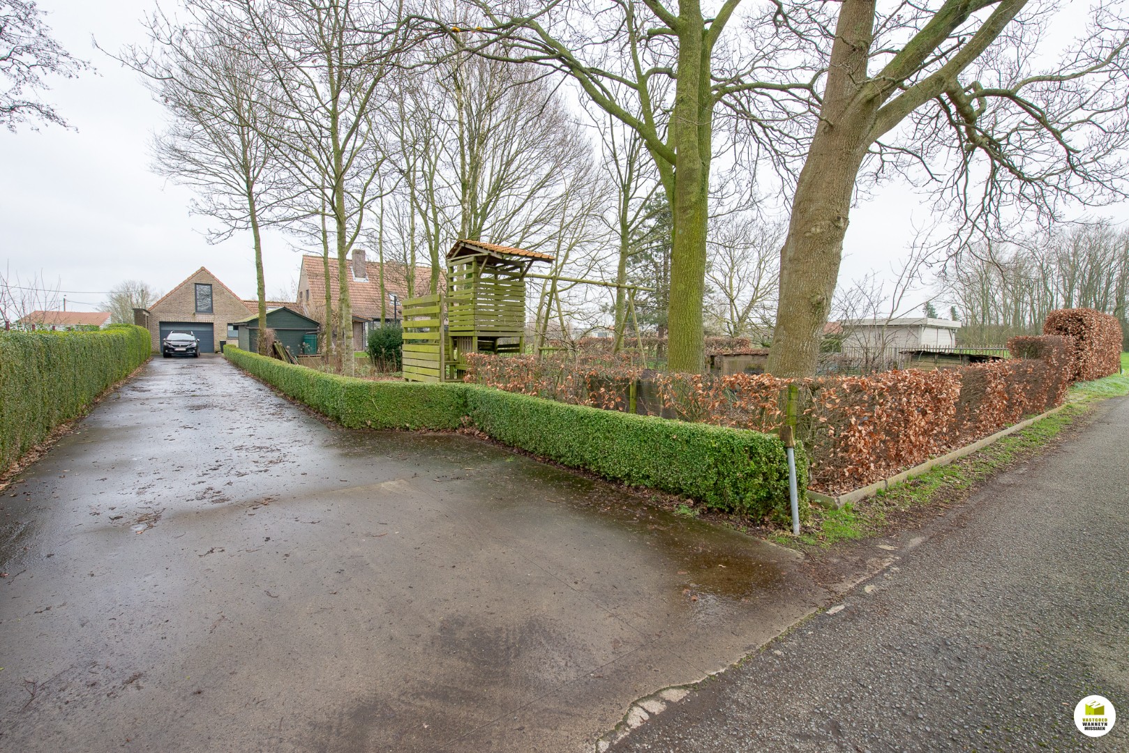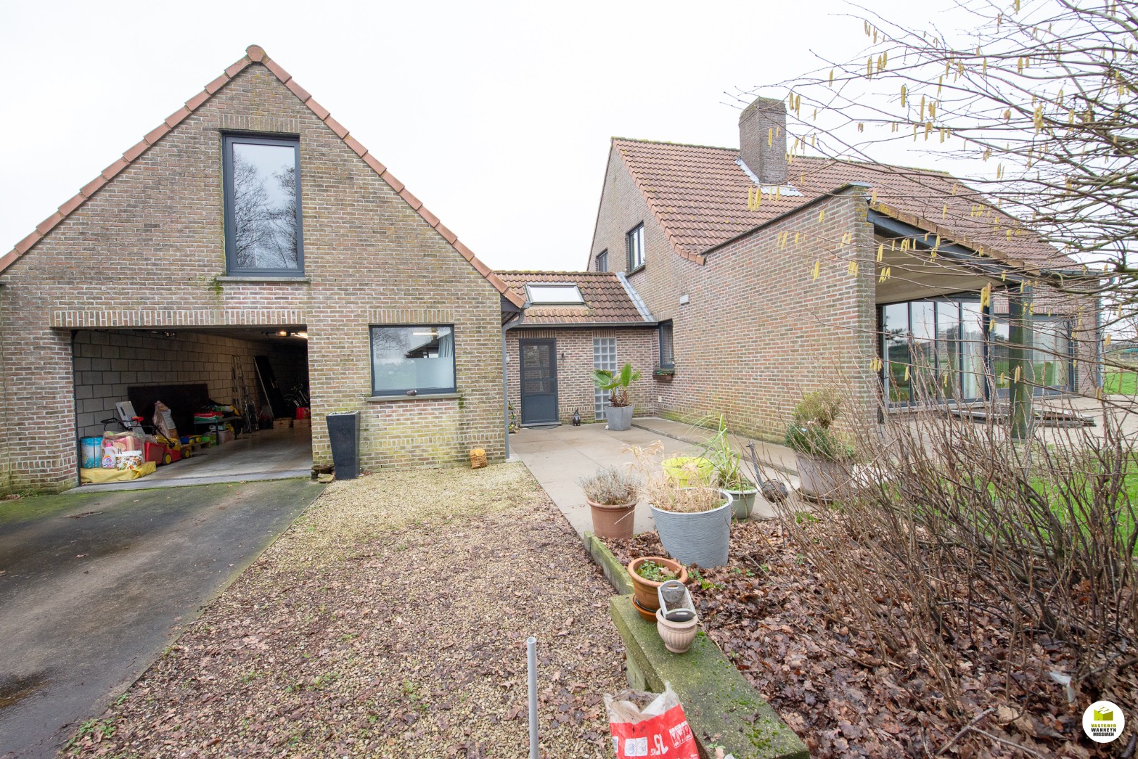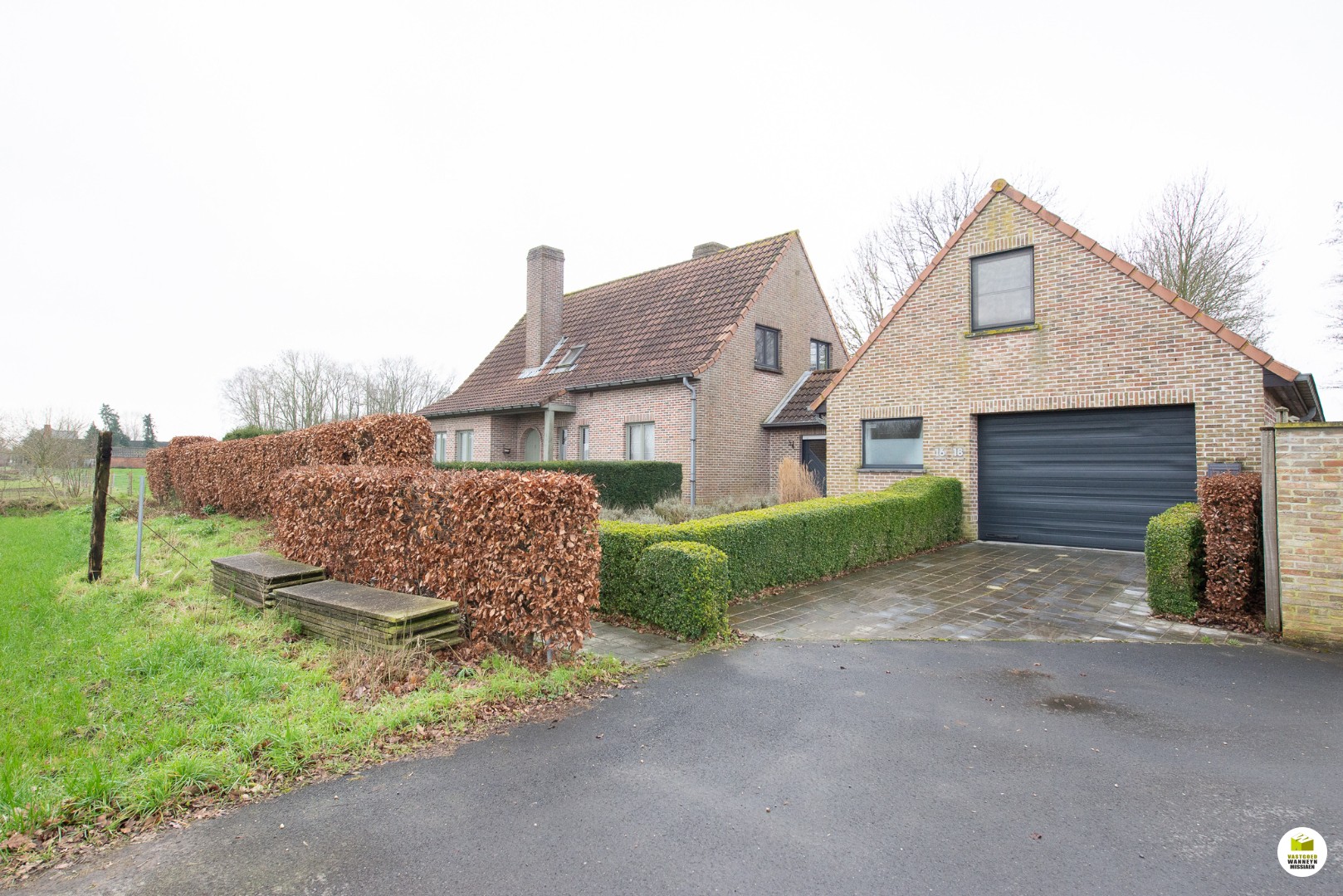 Landelijk gelegen alleenstaande woning met gelijkvloers bureel (12m2) en grote garage (65m2) met 3/4 slaapkamers op +/- 1700m2 zicht op de velden