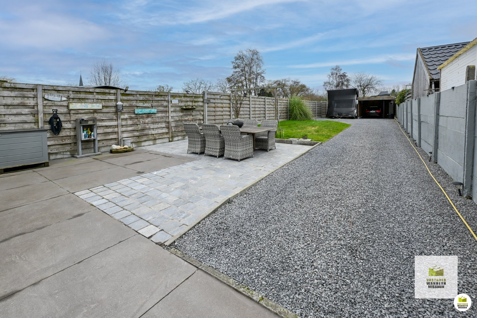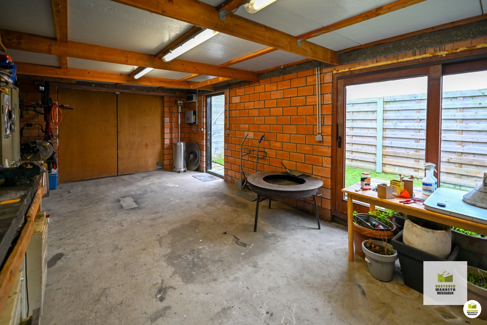 Via de elektrische poort en de oprit in gepolierd beton kom je meteen tot rust in de ruime tuin. Er is plaats voor 2 wagens of zelfs 1 mobilhome + 1 wagen, ... die achteraan veilig kunnen worden geplaatst onder de carports. Verder is er een garage (momenteel in gebruik als klusruimte) én nog een bijkomende berging, ideaal als houtopslag voor de kachel. Kortom: een woning met veel ruimte, zowel binnen als buiten.