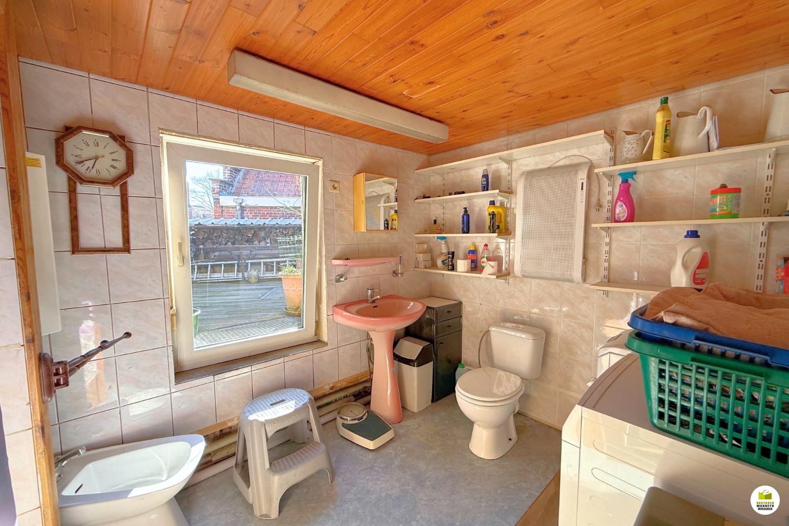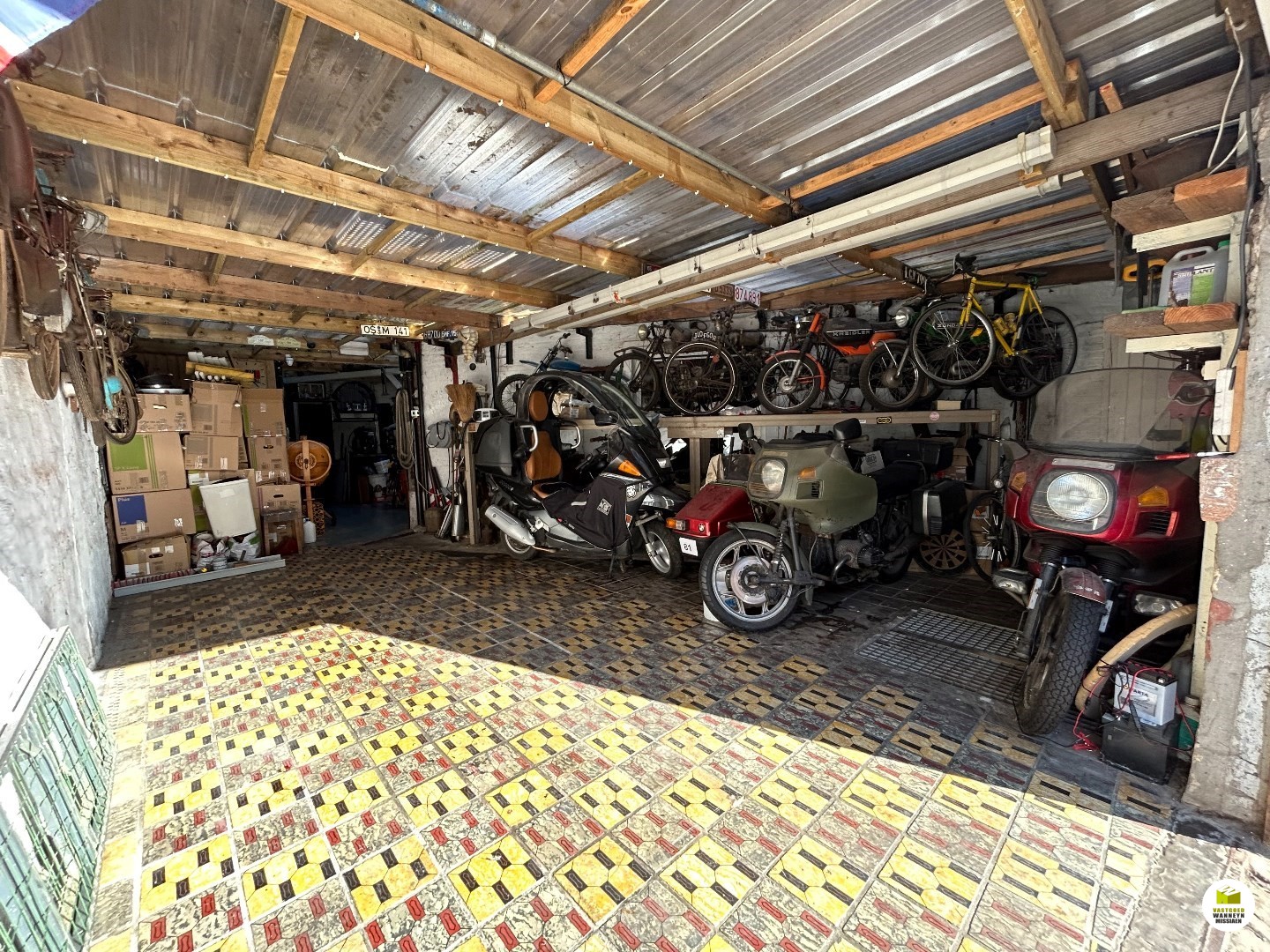 Ruime garage/werkplaats van van 10 m diep op een breedte van 3,5 m. De garage was vroeger niet zo groot. Indien je niet zo een grote garage wenst kan je er weer een gezellige binnenkoer van maken zoals het vroeger was. Of carport maken waardoor je kunt blijven parken op eigen terrein. Indeling woonst: woonkamer met tv hoek en eetplaats, aansluitend vinden we de keuken (koken met aardgas). Deze ruimtes worden verwarmd met een pelletkachel (maar deze gaat weg). Er is een gastentoilet en een droge kelder. Op de eerste verdieping is er een slaapkamer, een badkamer en een extra bergruimte (met voorziening van toe-en afvoer van water, ideaal voor wasplaats). In de badkamer is er een toilet, lavabo en douche. Met een vaste trap gaan we naar de zolderkamers. Er kan een gipskartonwand weggehaald worden om een ... grotere kamer te krijgen. Met een trapladdertje bereiken we de opperzolder die geschikt is als berging.