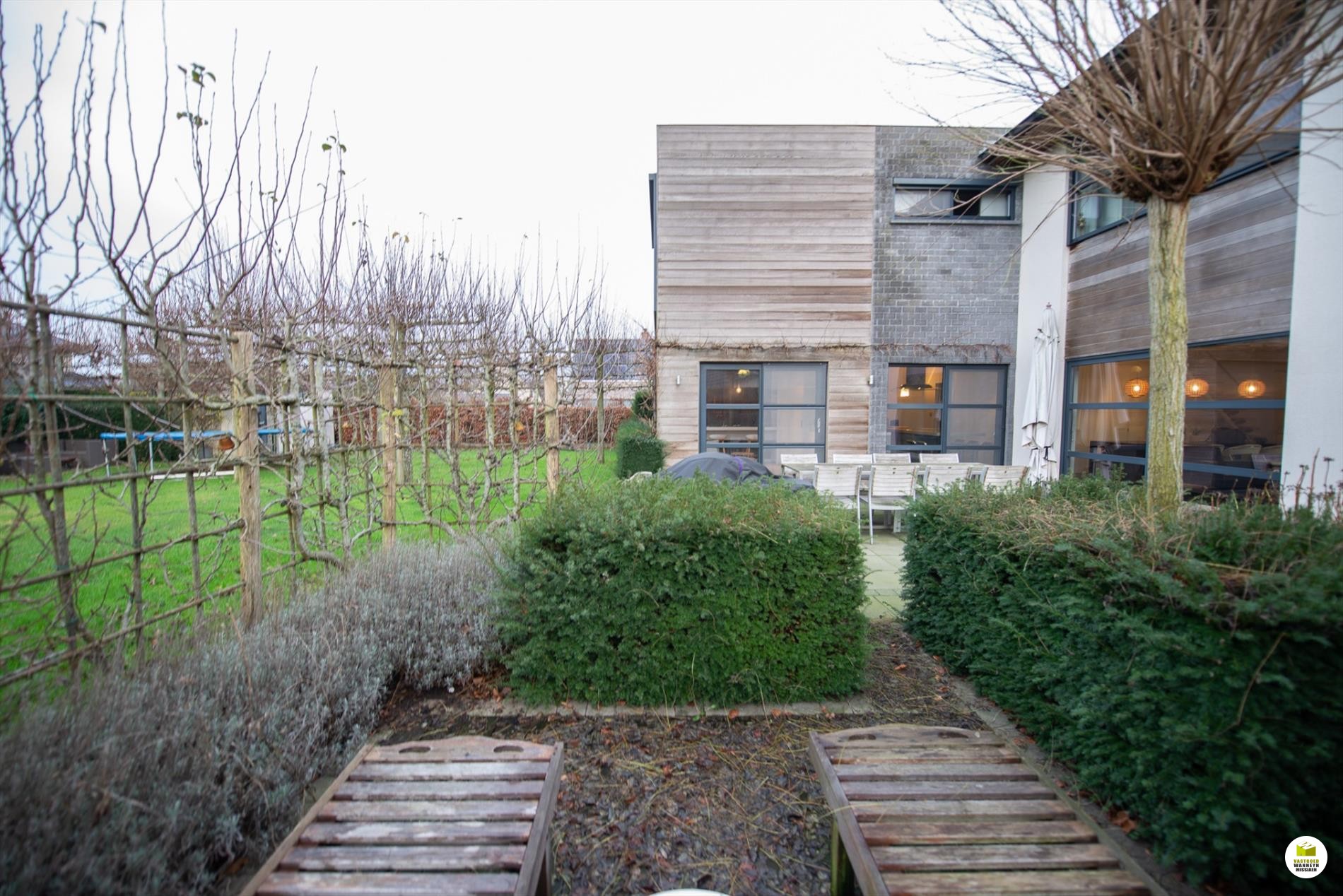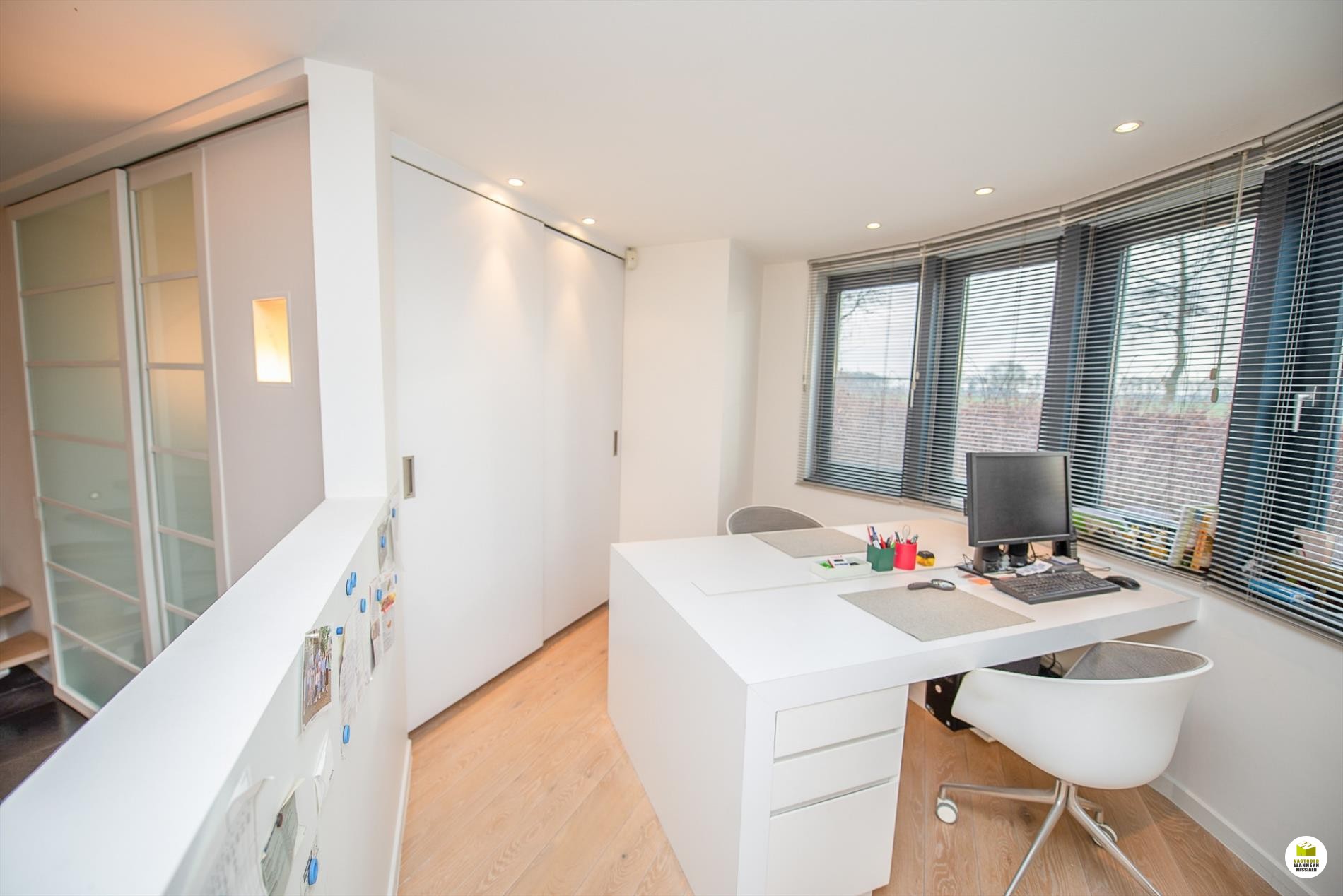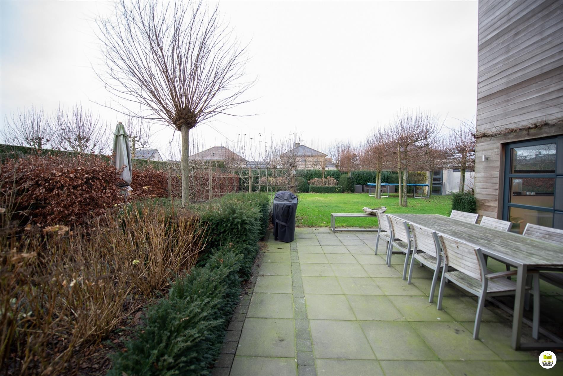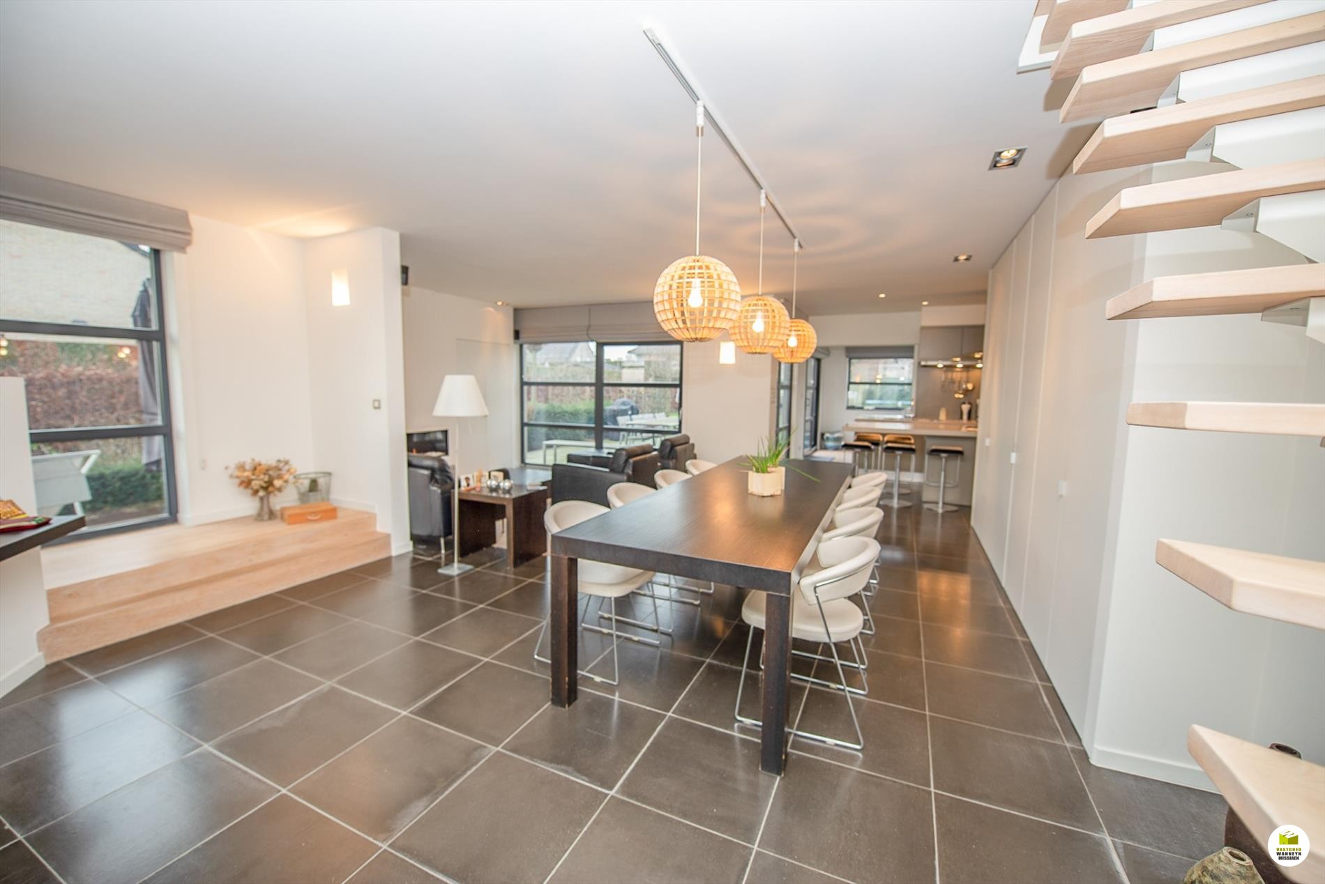 Mooi op het terrein gekomen via een wandelpad geflankeerd door rozenstruiken, ontdekken we de strakke inkomhal met gastentoilet. Via een licht doorlatende schuifdeur bereiken we de innemende living voorzien van een bureel die weggestoken zit maar toch contact met iedereen van het gezin belangrijk vindt. 2 ingemaakte bureautafels en een kastenwand zorgen dat u ongestoord kunt werken, uitzonderlijk zicht op de velden doordat het bureel 2 treden hoger gelegen is tov de woonkamer. Het salon maakt tijd en ruimte vrij voor een goed boek of een animerende film met zicht op de tuin en het gezellige gashaardvuur (Well ... Straler). De woonkamer zelf meet 7m diep waardoor er met gemak een tafel voor 10 personen kan staan, de muren zijn optimaal benut door ingemaakte kasten van plafond tot vloer, over een breedte van bijna 4m. Tevens zeer gemakkelijk naast de ingerichte leefkeuken die een ongedwongen sfeer uitstraalt (geluidloze vaatwas, Amerikaanse frigo, stoom- en warmelucht oven, ed. merk Miele). Aansluitend is er de heerlijke wintertuin voor vrienden- en familie onderonsjes, of een studeerkamer waar u ongestoord piano kunt spelen met zicht op de tuin, ook hier zijn er ingemaakte kasten en tafel ingebouwd.
