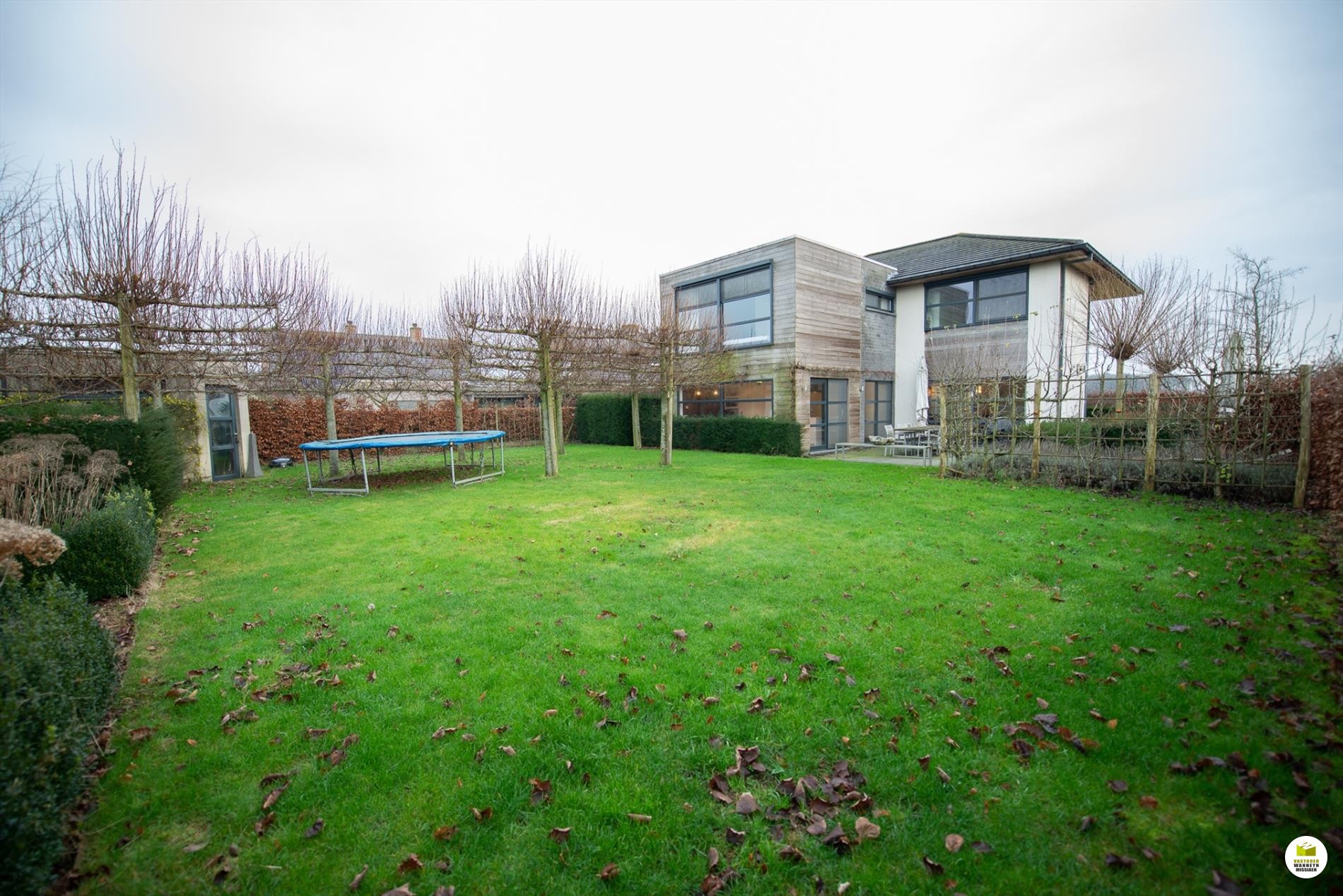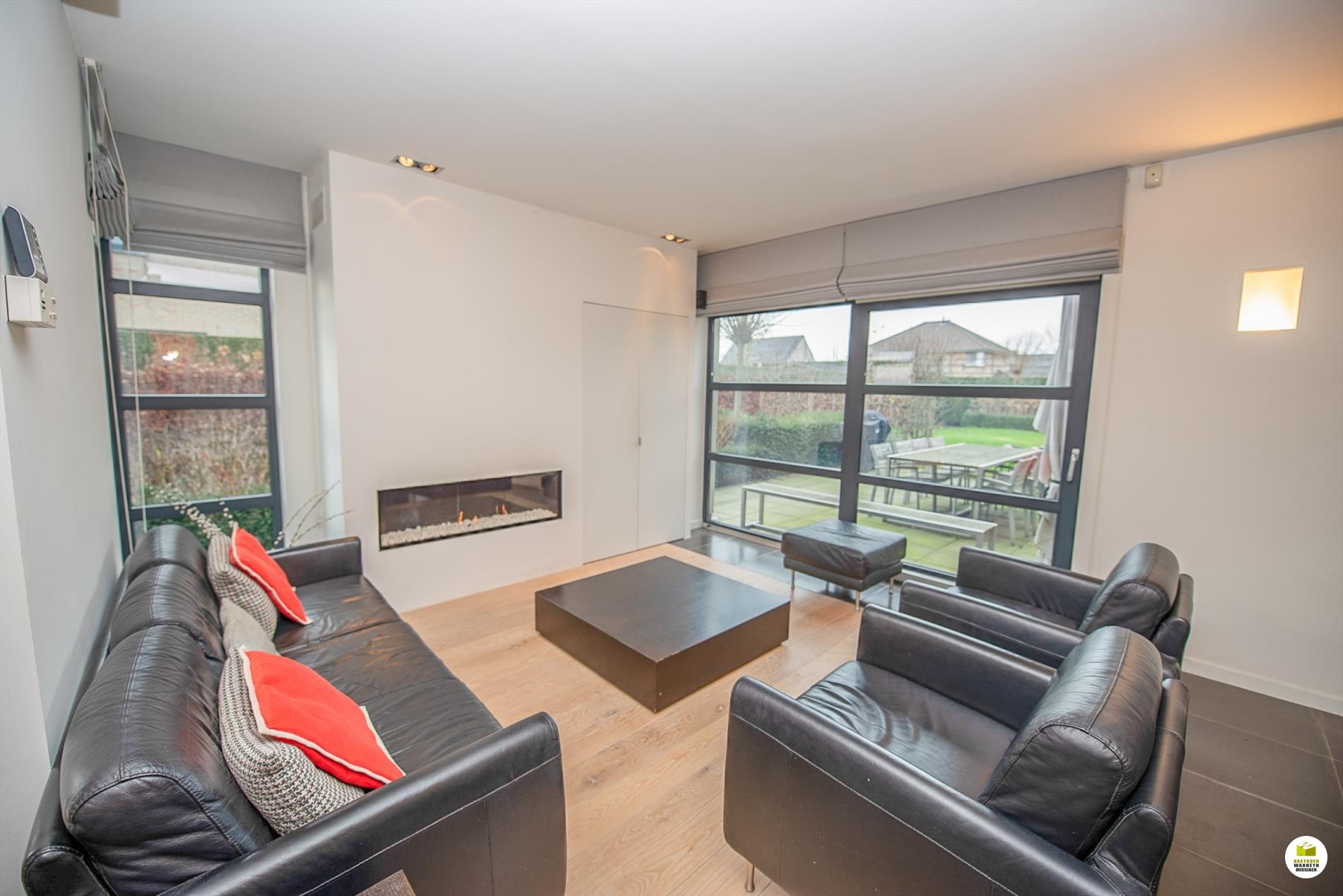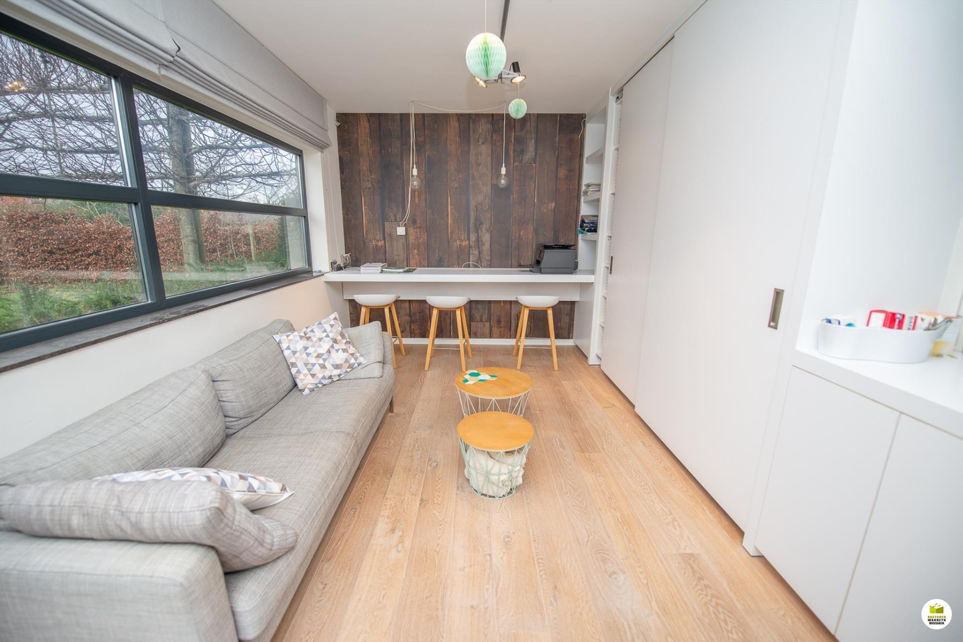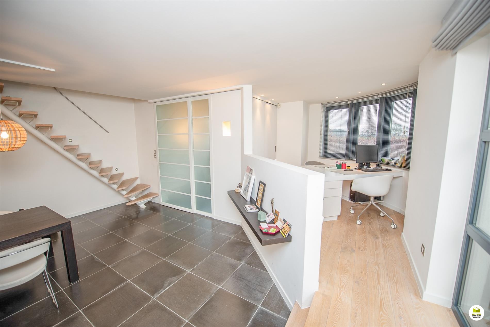 Mooi op het terrein gekomen via een wandelpad geflankeerd door rozenstruiken, ontdekken we de strakke inkomhal met gastentoilet. Via een licht doorlatende schuifdeur bereiken we de innemende living voorzien van een bureel die weggestoken zit maar toch contact met iedereen van het gezin belangrijk vindt. 2 ingemaakte bureautafels en een kastenwand zorgen dat u ongestoord kunt werken, uitzonderlijk zicht op de velden doordat het bureel 2 treden hoger gelegen is tov de woonkamer. Het salon maakt tijd en ruimte vrij voor een goed boek of een animerende film met zicht op de tuin en het gezellige gashaardvuur (Well ... Straler). De woonkamer zelf meet 7m diep waardoor er met gemak een tafel voor 10 personen kan staan, de muren zijn optimaal benut door ingemaakte kasten van plafond tot vloer, over een breedte van bijna 4m. Tevens zeer gemakkelijk naast de ingerichte leefkeuken die een ongedwongen sfeer uitstraalt (geluidloze vaatwas, Amerikaanse frigo, stoom- en warmelucht oven, ed. merk Miele). Aansluitend is er de heerlijke wintertuin voor vrienden- en familie onderonsjes, of een studeerkamer waar u ongestoord piano kunt spelen met zicht op de tuin, ook hier zijn er ingemaakte kasten en tafel ingebouwd.