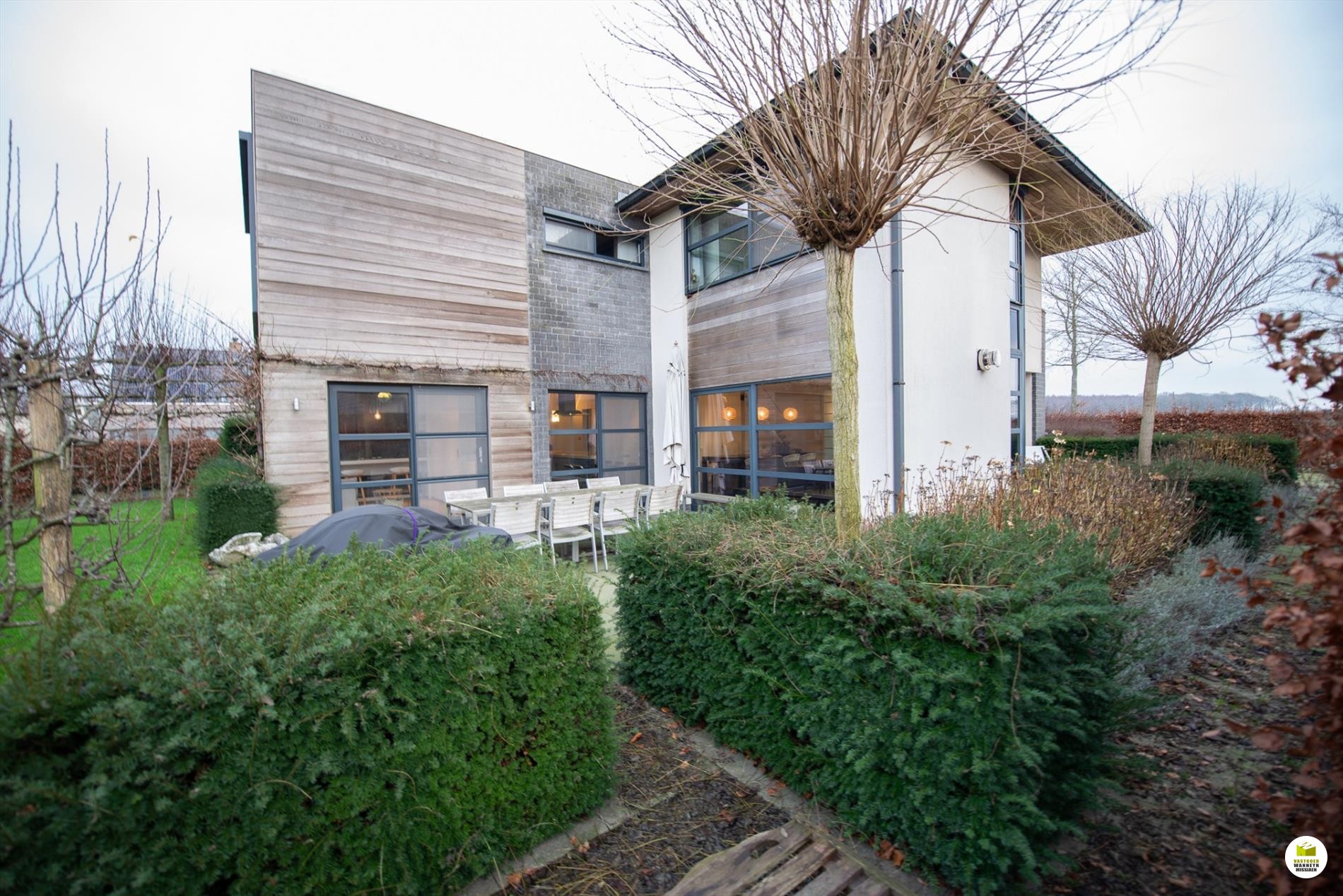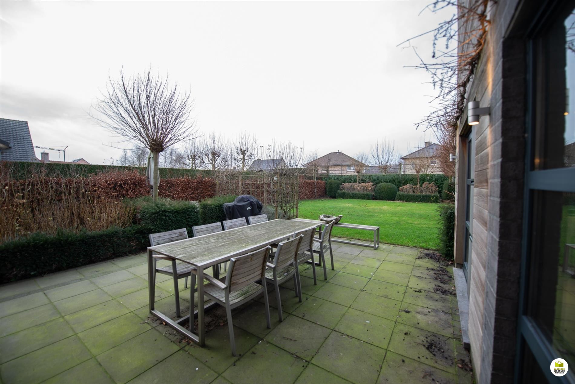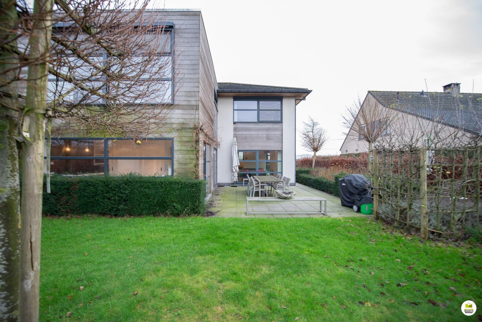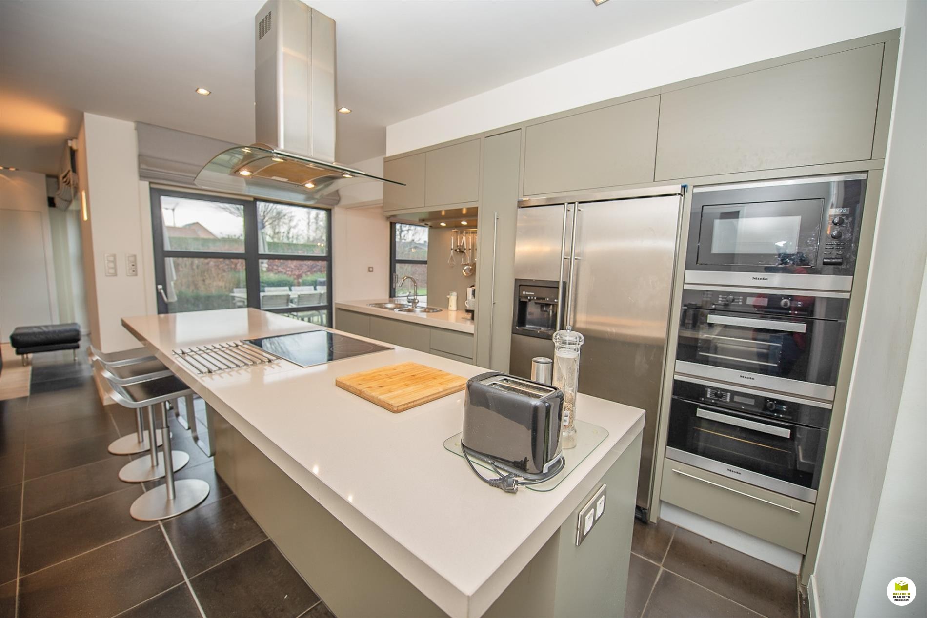 Mooi op het terrein gekomen via een wandelpad geflankeerd door rozenstruiken, ontdekken we de strakke inkomhal met gastentoilet. Via een licht doorlatende schuifdeur bereiken we de innemende living voorzien van een bureel die weggestoken zit maar toch contact met iedereen van het gezin belangrijk vindt. 2 ingemaakte bureautafels en een kastenwand zorgen dat u ongestoord kunt werken, uitzonderlijk zicht op de velden doordat het bureel 2 treden hoger gelegen is tov de woonkamer. Het salon maakt tijd en ruimte vrij voor een goed boek of een animerende film met zicht op de tuin en het gezellige gashaardvuur (Well ... Straler). De woonkamer zelf meet 7m diep waardoor er met gemak een tafel voor 10 personen kan staan, de muren zijn optimaal benut door ingemaakte kasten van plafond tot vloer, over een breedte van bijna 4m. Tevens zeer gemakkelijk naast de ingerichte leefkeuken die een ongedwongen sfeer uitstraalt (geluidloze vaatwas, Amerikaanse frigo, stoom- en warmelucht oven, ed. merk Miele). Aansluitend is er de heerlijke wintertuin voor vrienden- en familie onderonsjes, of een studeerkamer waar u ongestoord piano kunt spelen met zicht op de tuin, ook hier zijn er ingemaakte kasten en tafel ingebouwd.