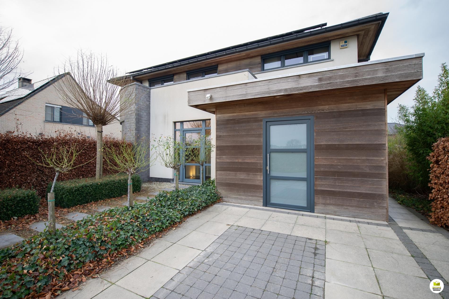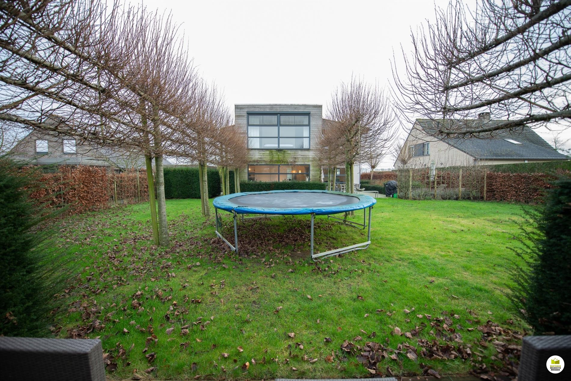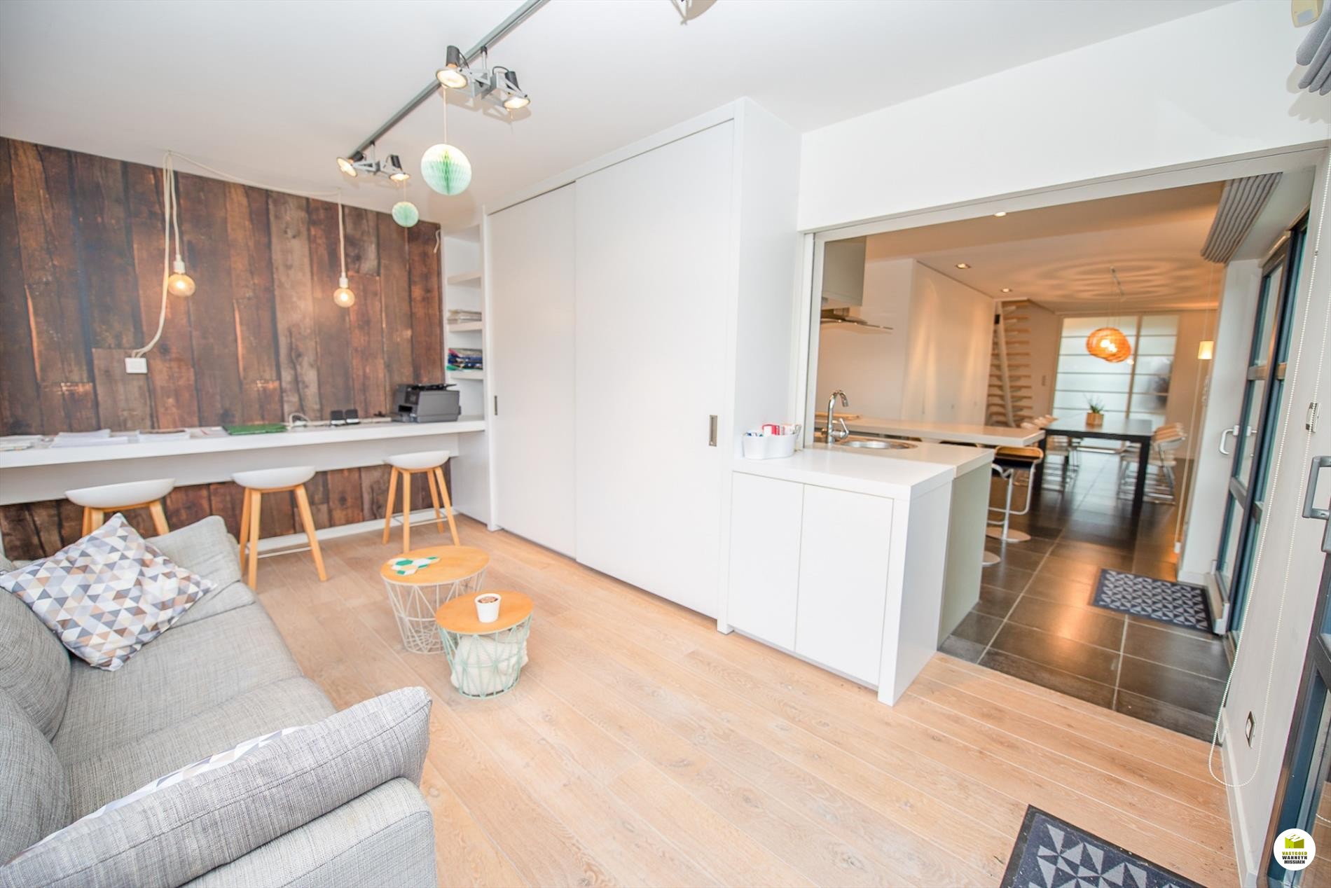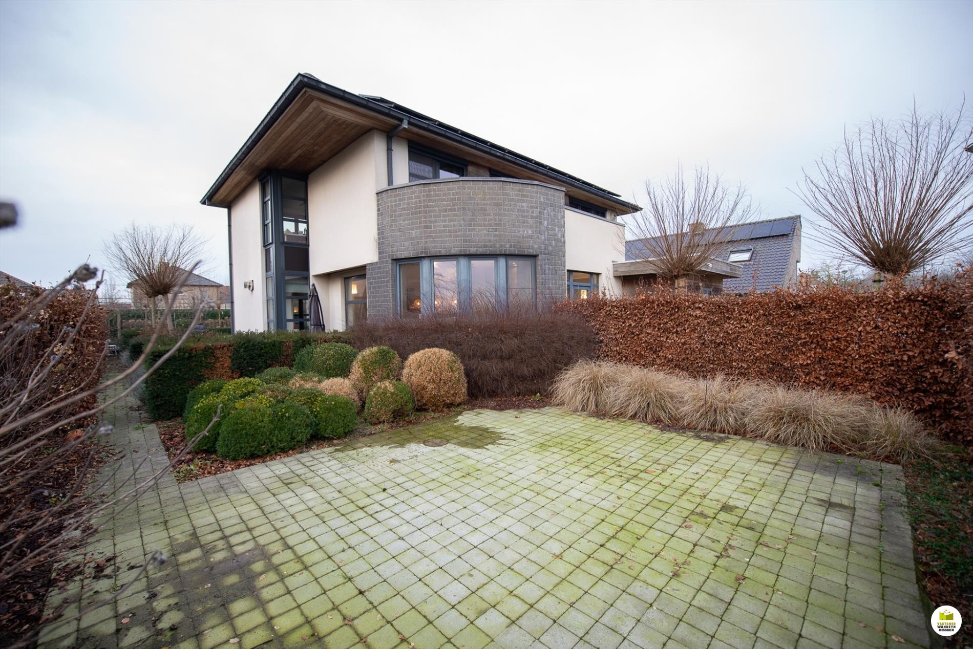 Mooi op het terrein gekomen via een wandelpad geflankeerd door rozenstruiken, ontdekken we de strakke inkomhal met gastentoilet. Via een licht doorlatende schuifdeur bereiken we de innemende living voorzien van een bureel die weggestoken zit maar toch contact met iedereen van het gezin belangrijk vindt. 2 ingemaakte bureautafels en een kastenwand zorgen dat u ongestoord kunt werken, uitzonderlijk zicht op de velden doordat het bureel 2 treden hoger gelegen is tov de woonkamer. Het salon maakt tijd en ruimte vrij voor een goed boek of een animerende film met zicht op de tuin en het gezellige gashaardvuur (Well ... Straler). De woonkamer zelf meet 7m diep waardoor er met gemak een tafel voor 10 personen kan staan, de muren zijn optimaal benut door ingemaakte kasten van plafond tot vloer, over een breedte van bijna 4m. Tevens zeer gemakkelijk naast de ingerichte leefkeuken die een ongedwongen sfeer uitstraalt (geluidloze vaatwas, Amerikaanse frigo, stoom- en warmelucht oven, ed. merk Miele). Aansluitend is er de heerlijke wintertuin voor vrienden- en familie onderonsjes, of een studeerkamer waar u ongestoord piano kunt spelen met zicht op de tuin, ook hier zijn er ingemaakte kasten en tafel ingebouwd.
