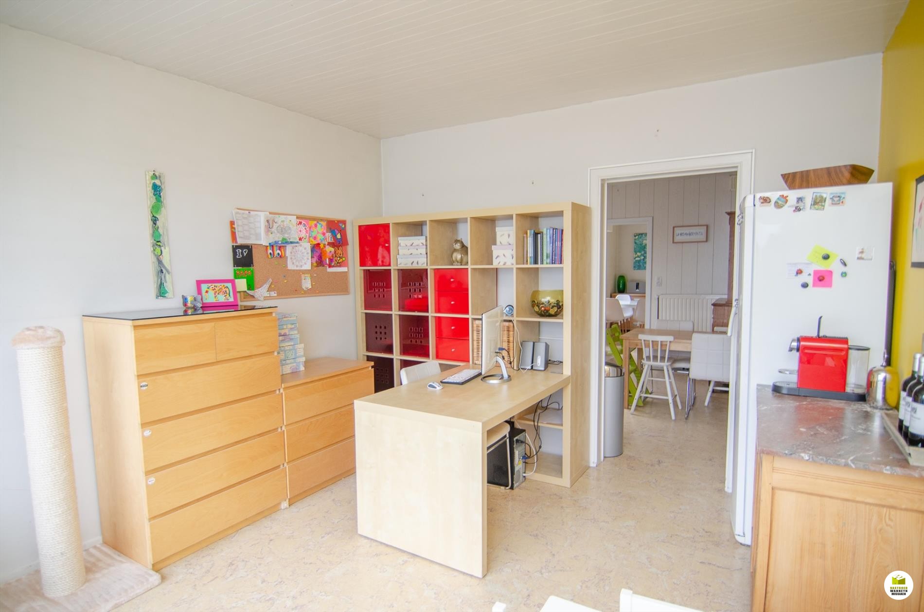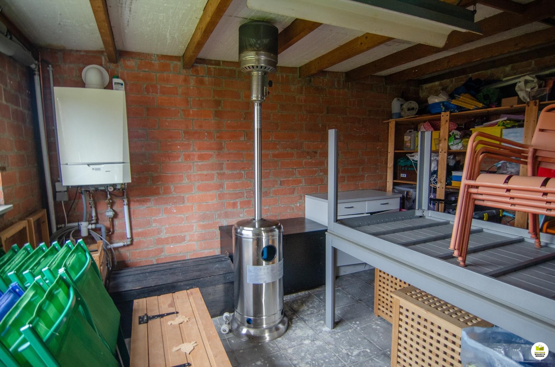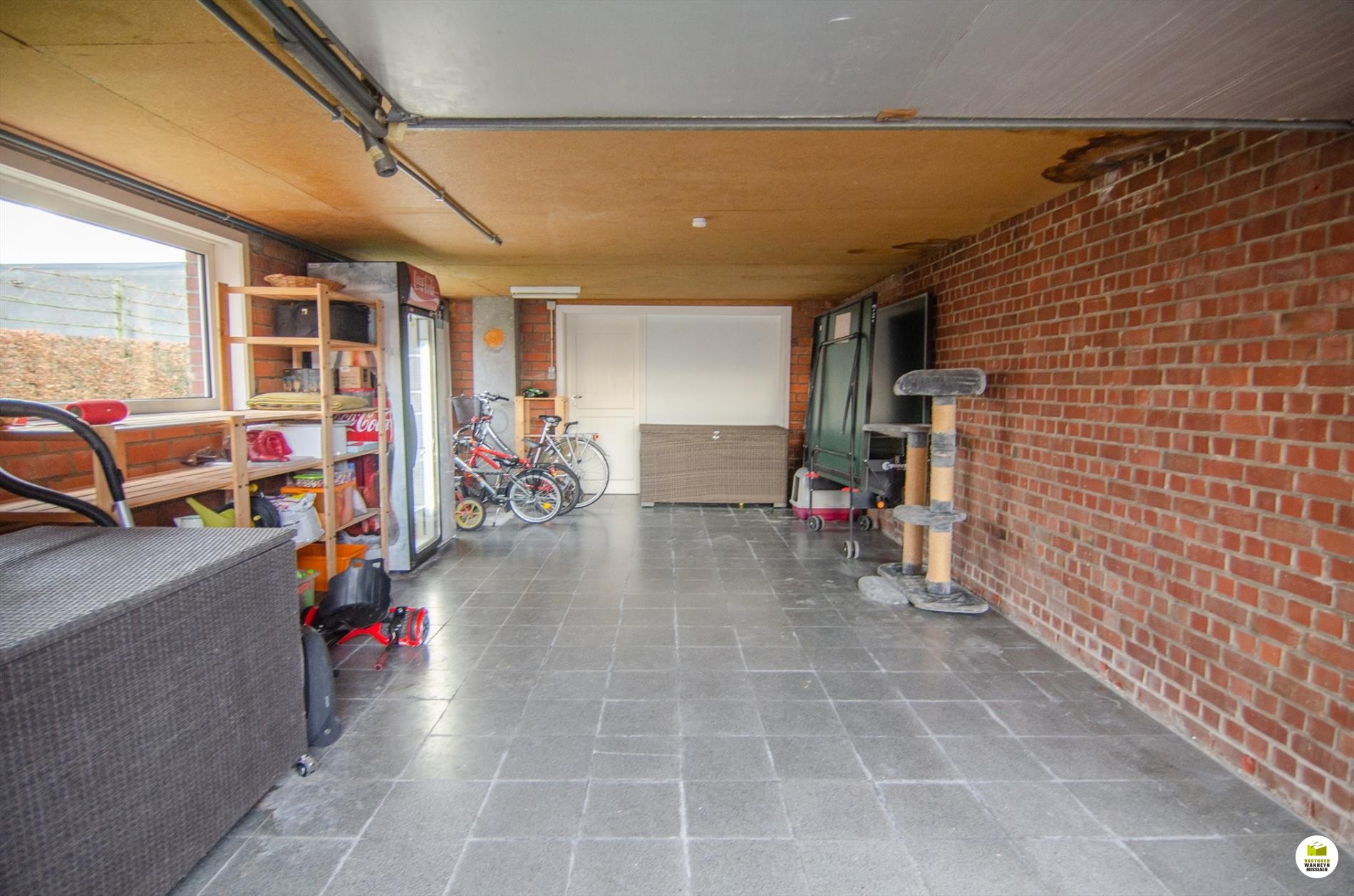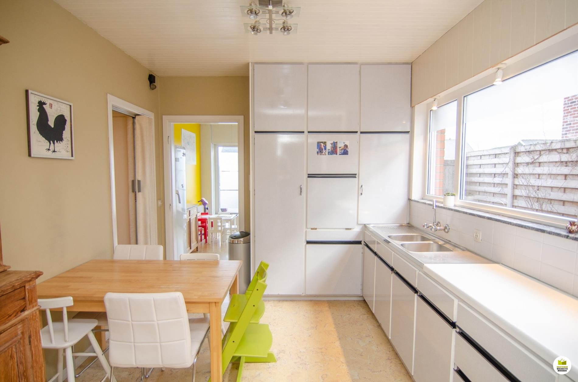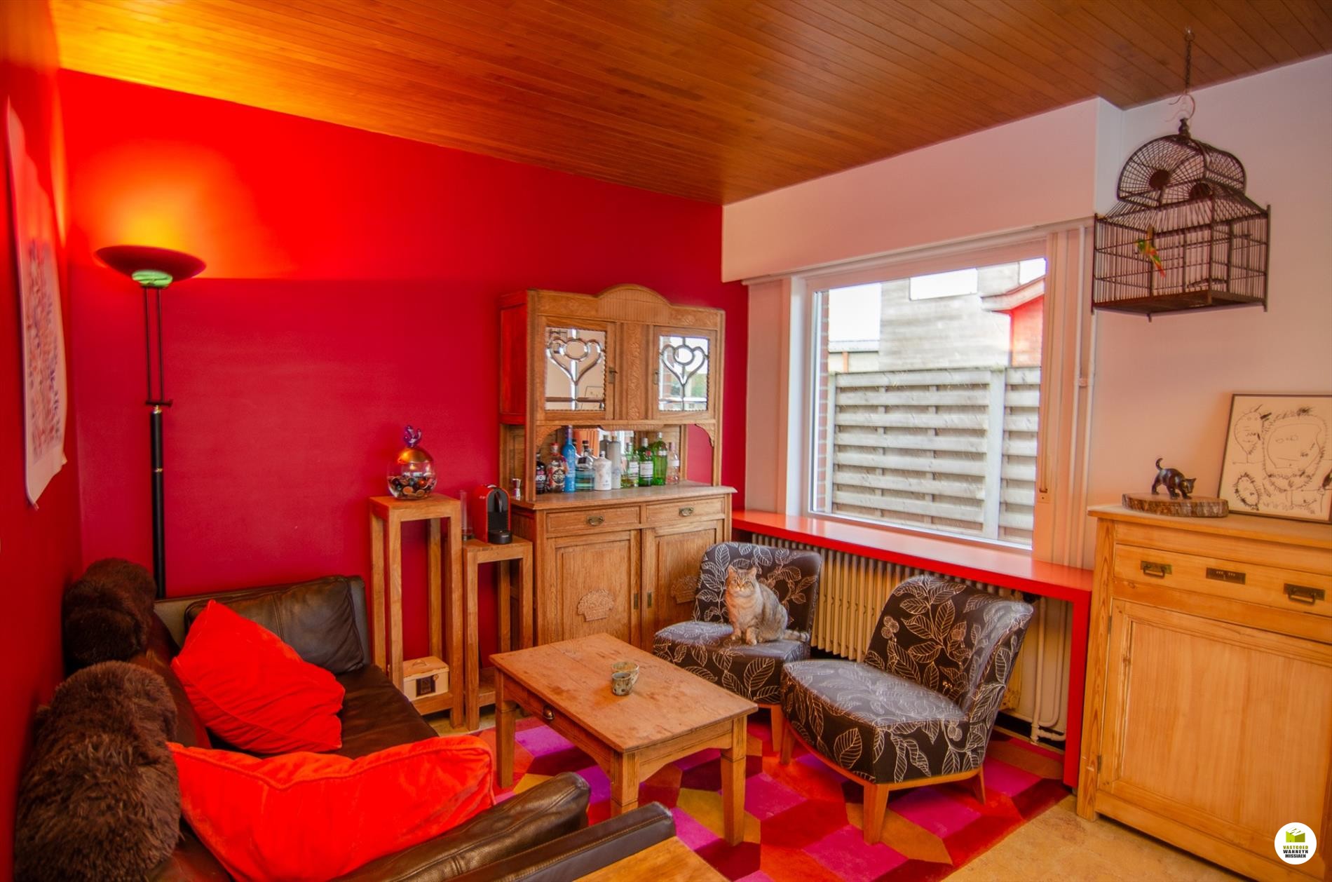 Inkomhal met toilet. Directe doorgang naar de garage van 60m2 via wasplaats. De woonkamer is sfeervol ingericht en voorzien van 2 schouwkanalen. Met een schuifraam is de tuin en het terras bereikbaar. Optimaal lichtinval door goede oriëntatie van het huis/tuin (zuidwest). De keuken met kookfornuis van Smeg bevindt zich tussen de woonkamer en het bureel/speelkamer. De kelder zit centraal en is een koele berging. Er is een 2de zithoek vooraan die kan dienen als praktijkruimte.