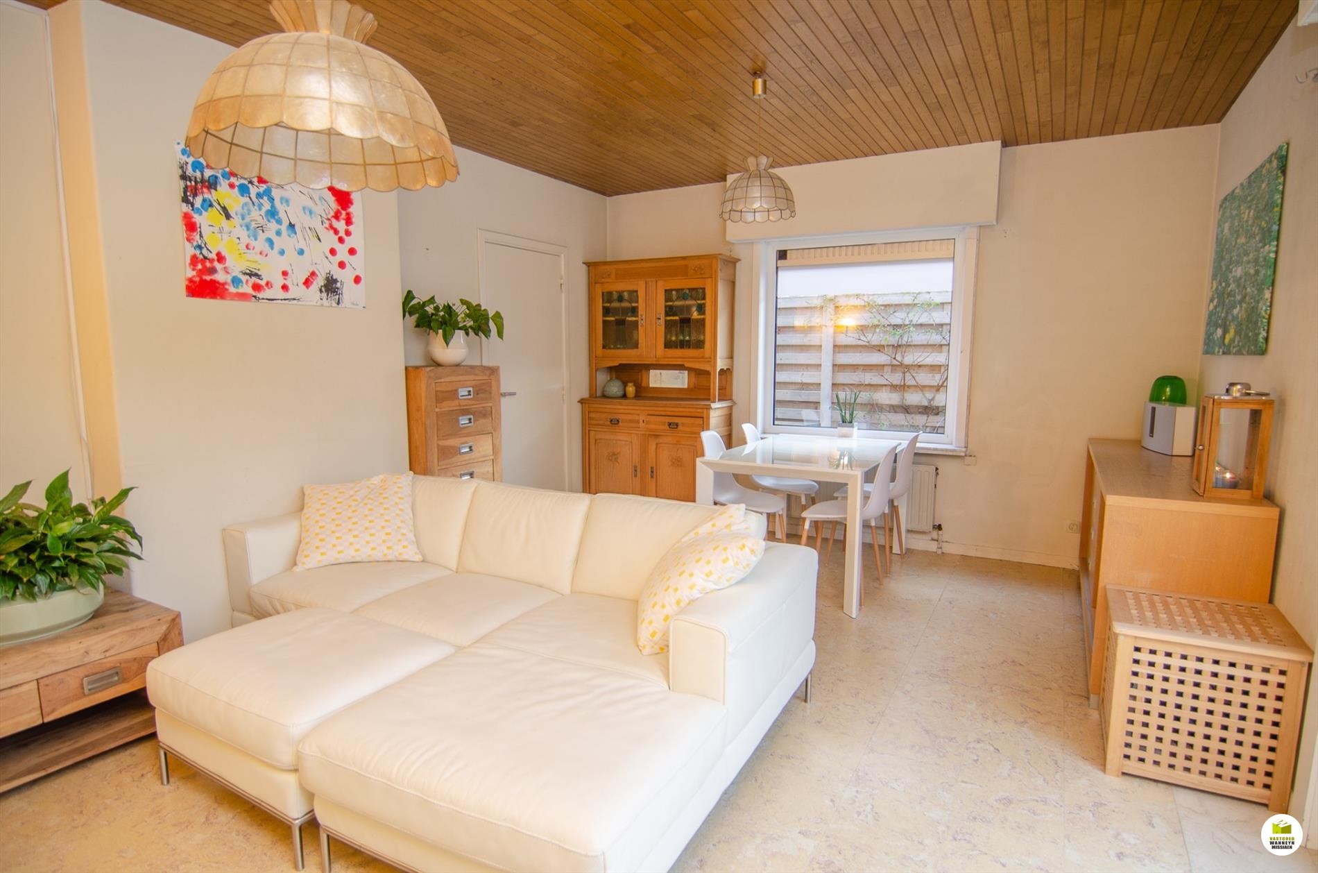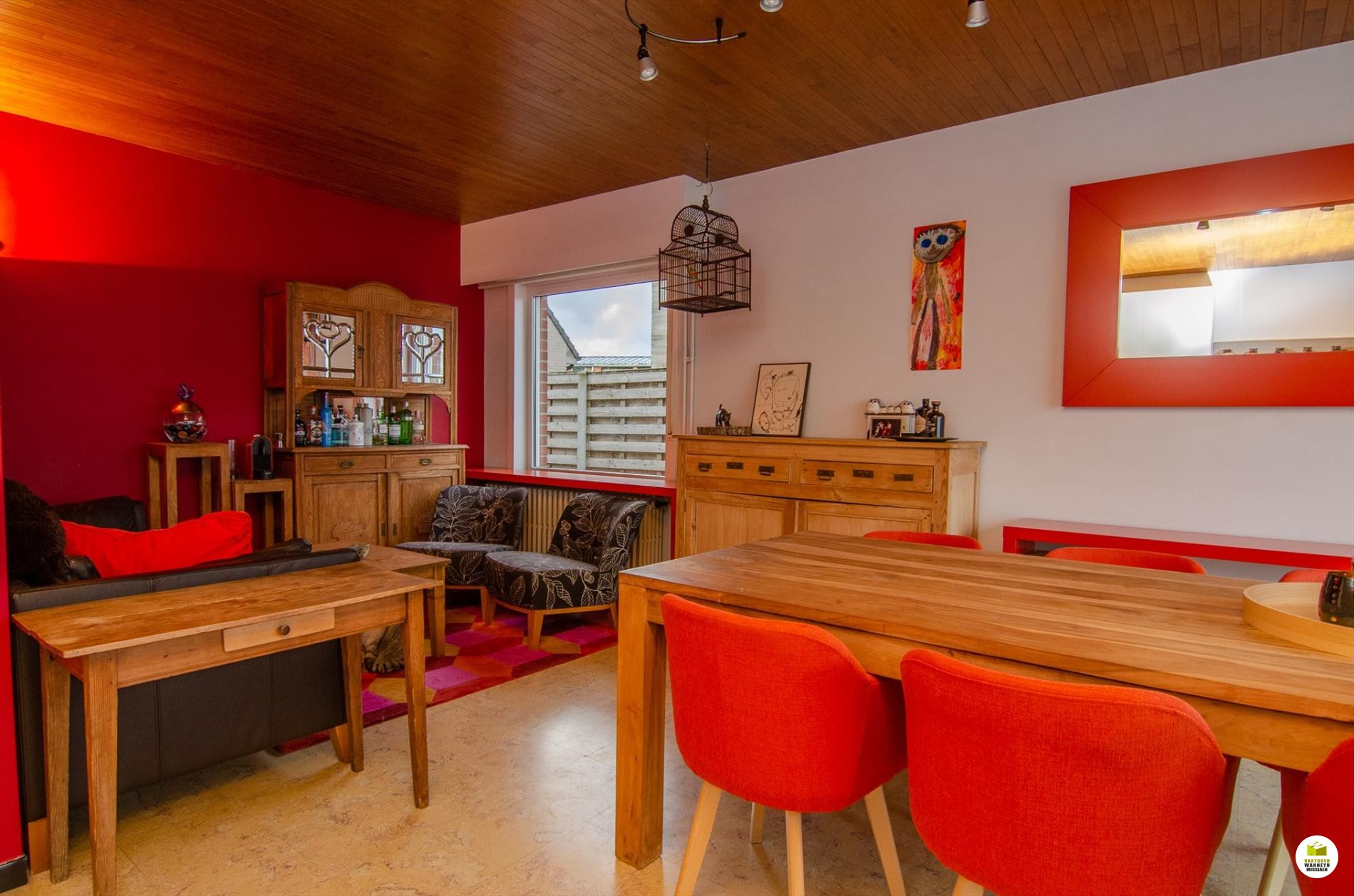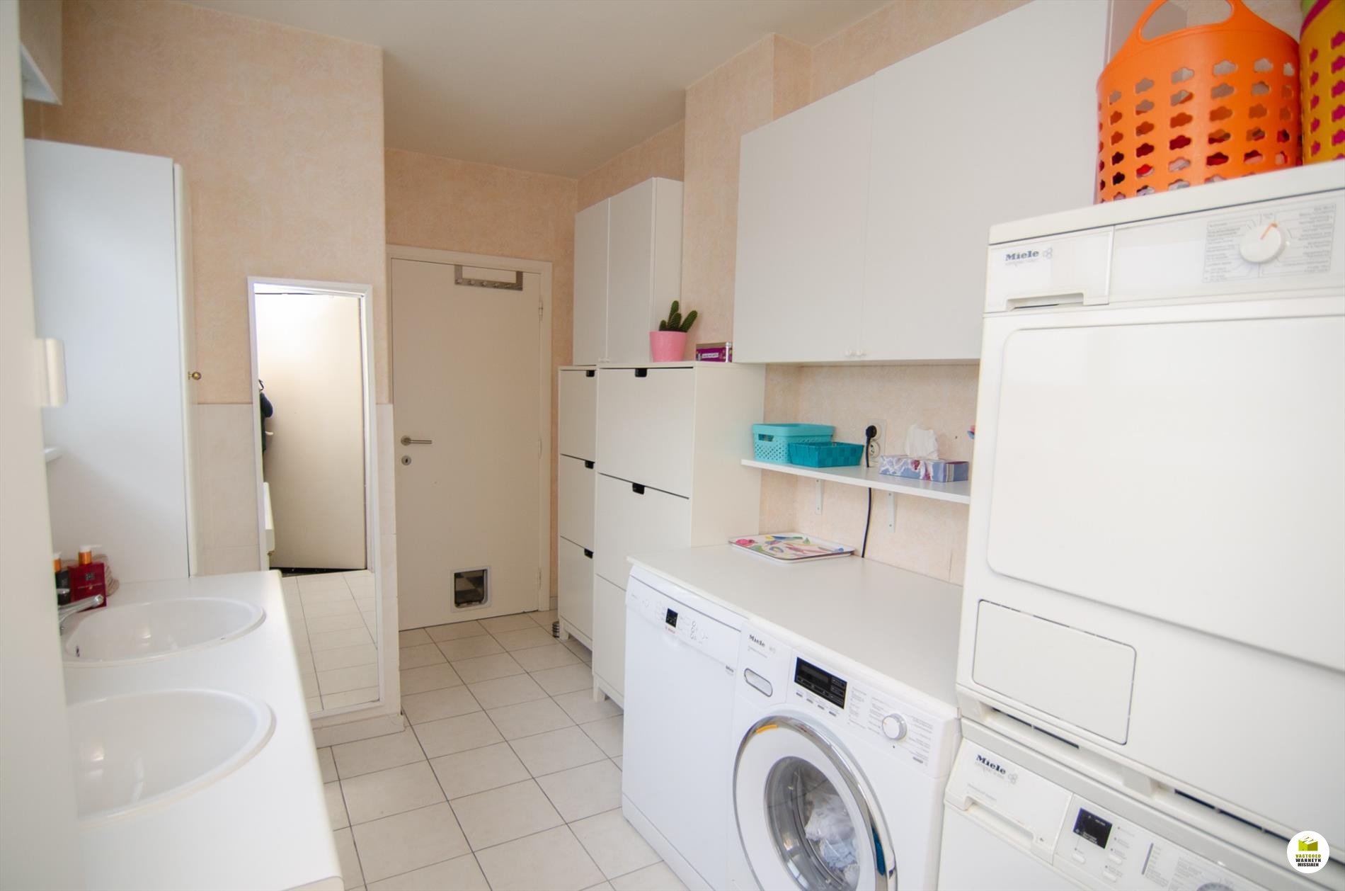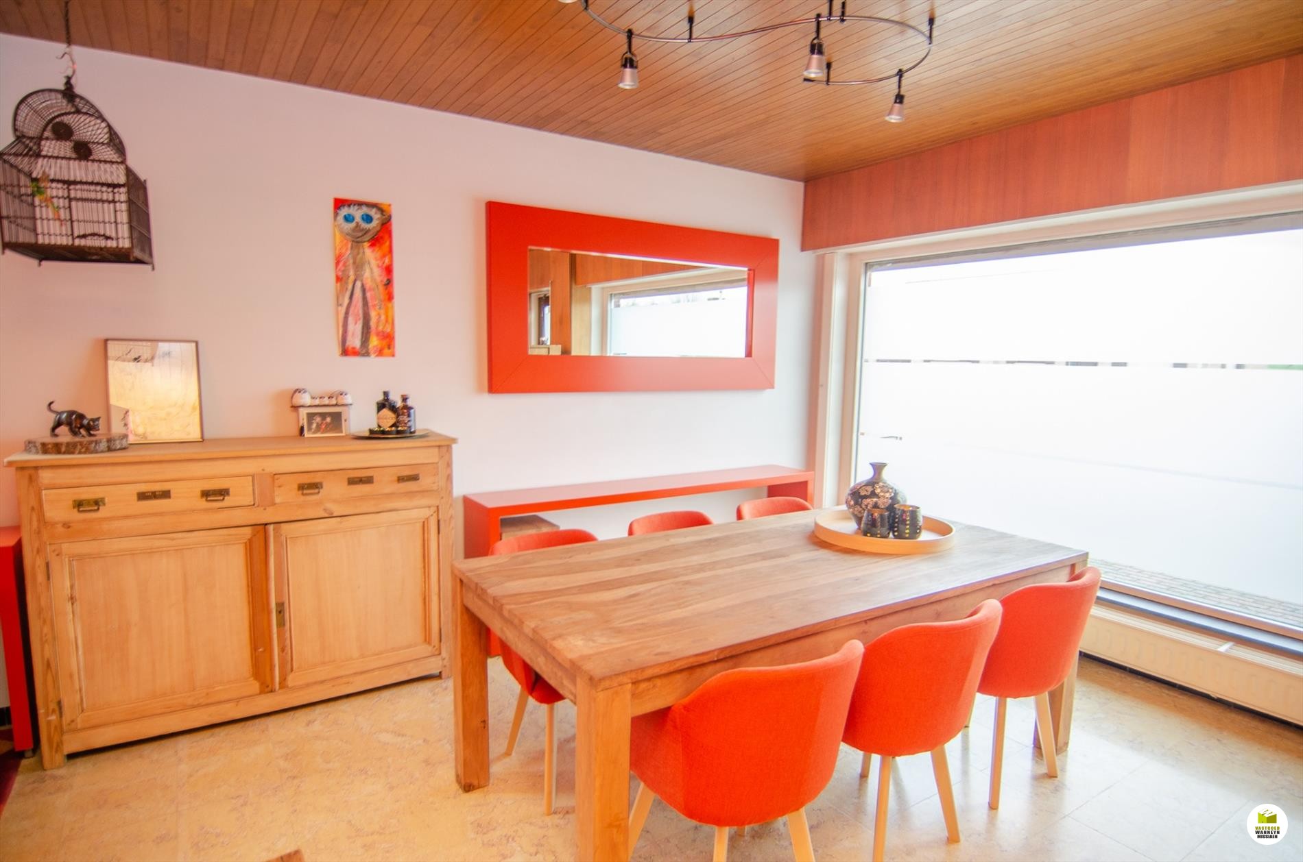 Inkomhal met toilet. Directe doorgang naar de garage van 60m2 via wasplaats. De woonkamer is sfeervol ingericht en voorzien van 2 schouwkanalen. Met een schuifraam is de tuin en het terras bereikbaar. Optimaal lichtinval door goede oriëntatie van het huis/tuin (zuidwest). De keuken met kookfornuis van Smeg bevindt zich tussen de woonkamer en het bureel/speelkamer. De kelder zit centraal en is een koele berging. Er is een 2de zithoek vooraan die kan dienen als praktijkruimte.