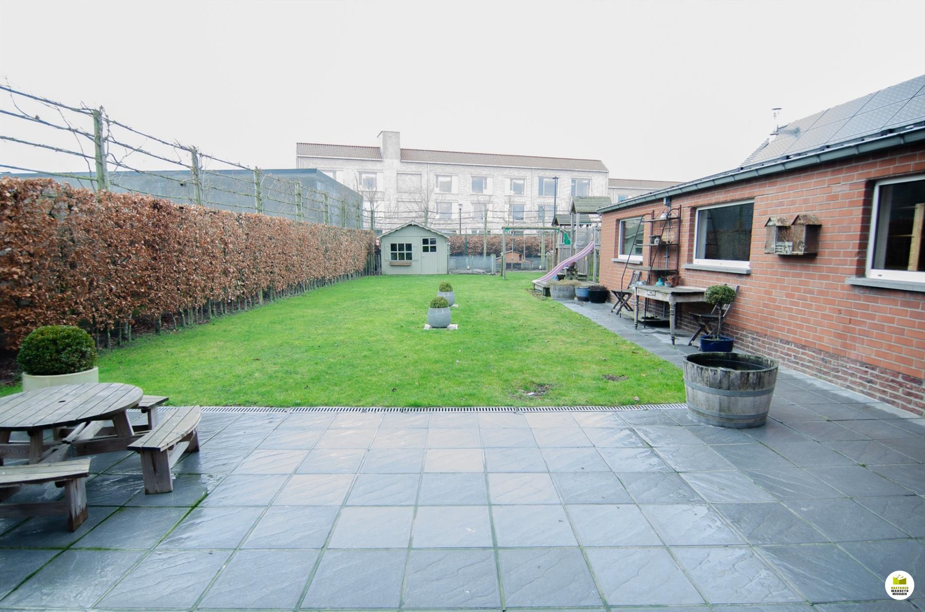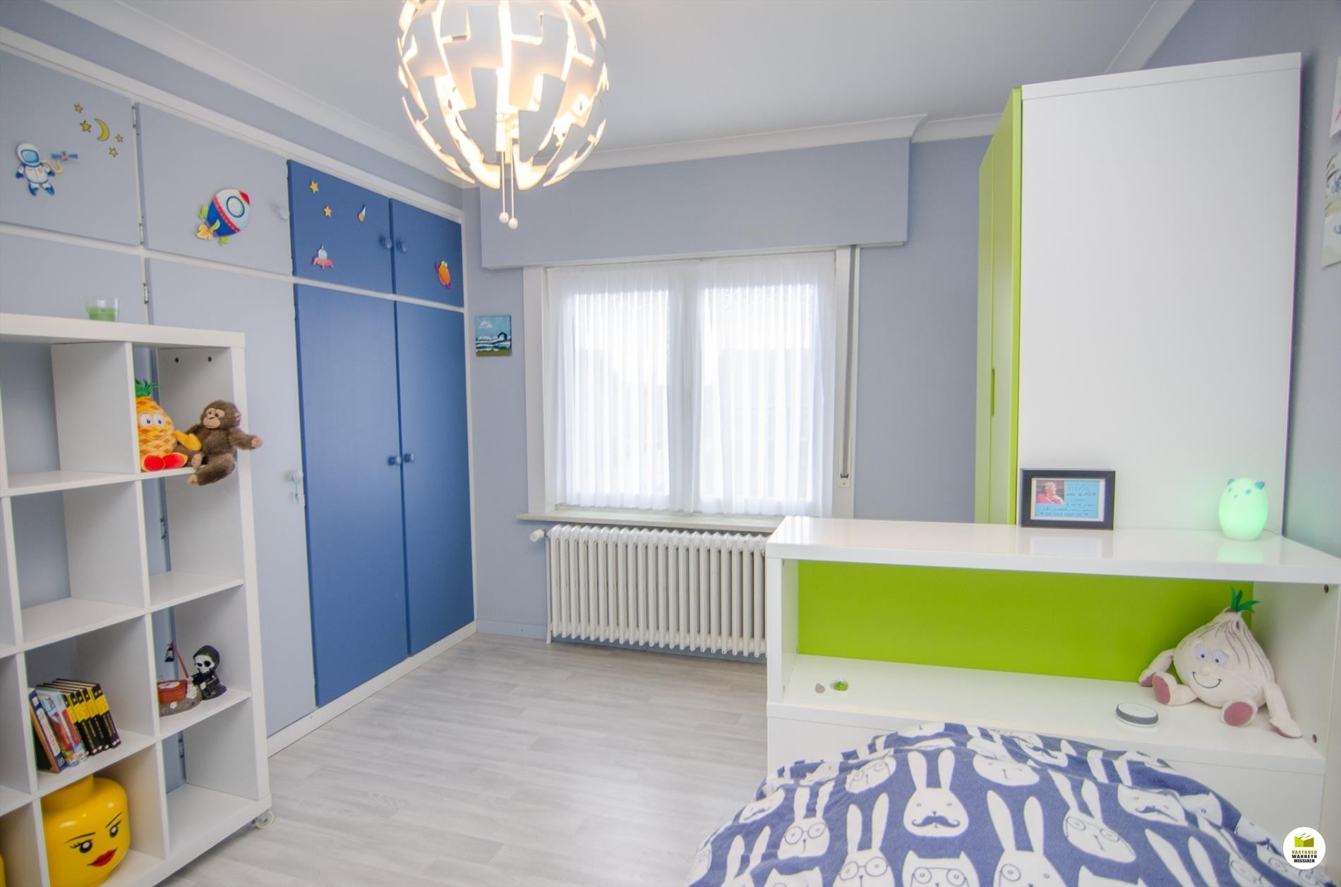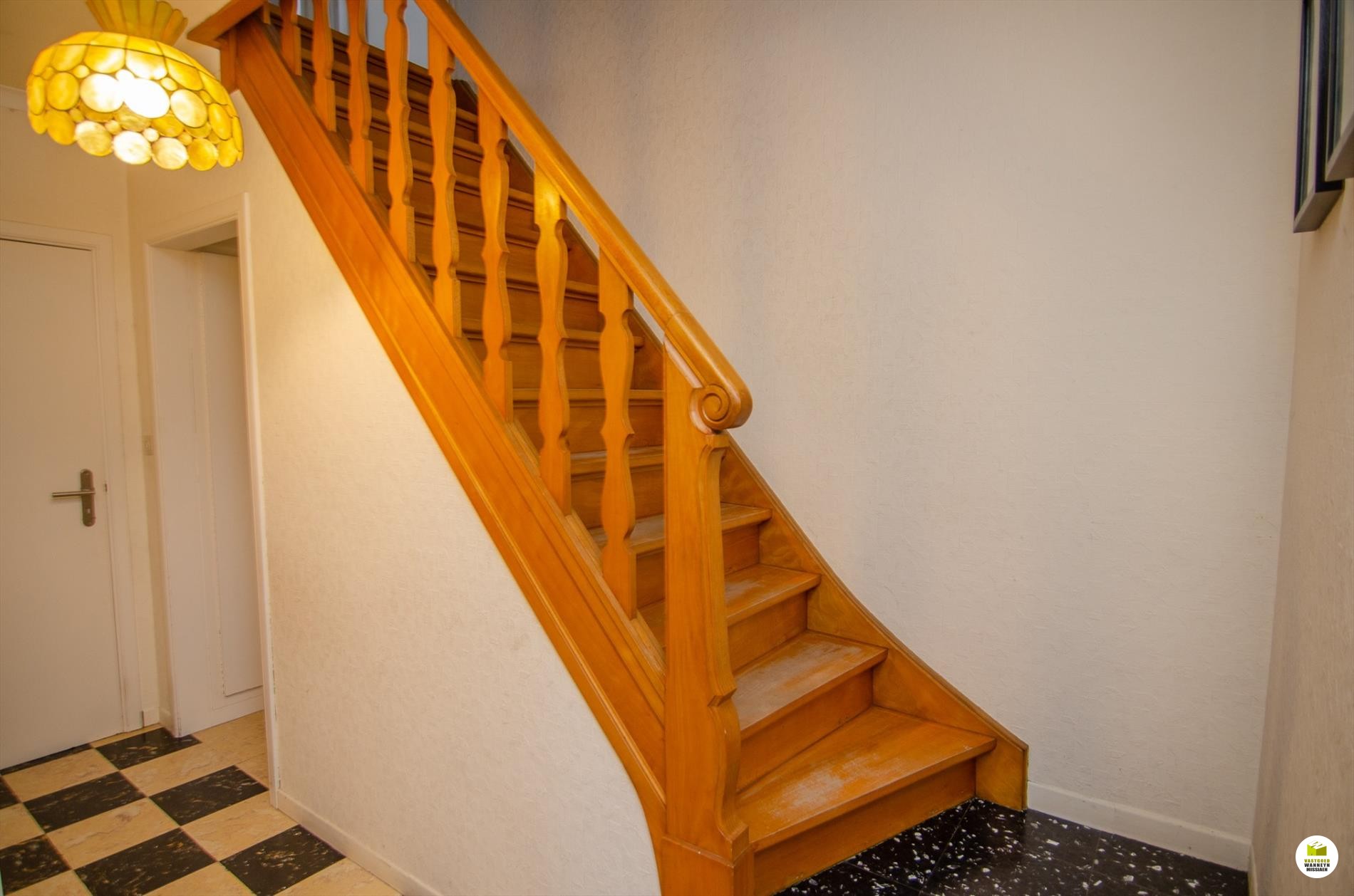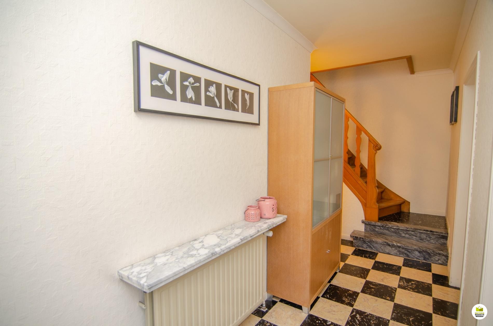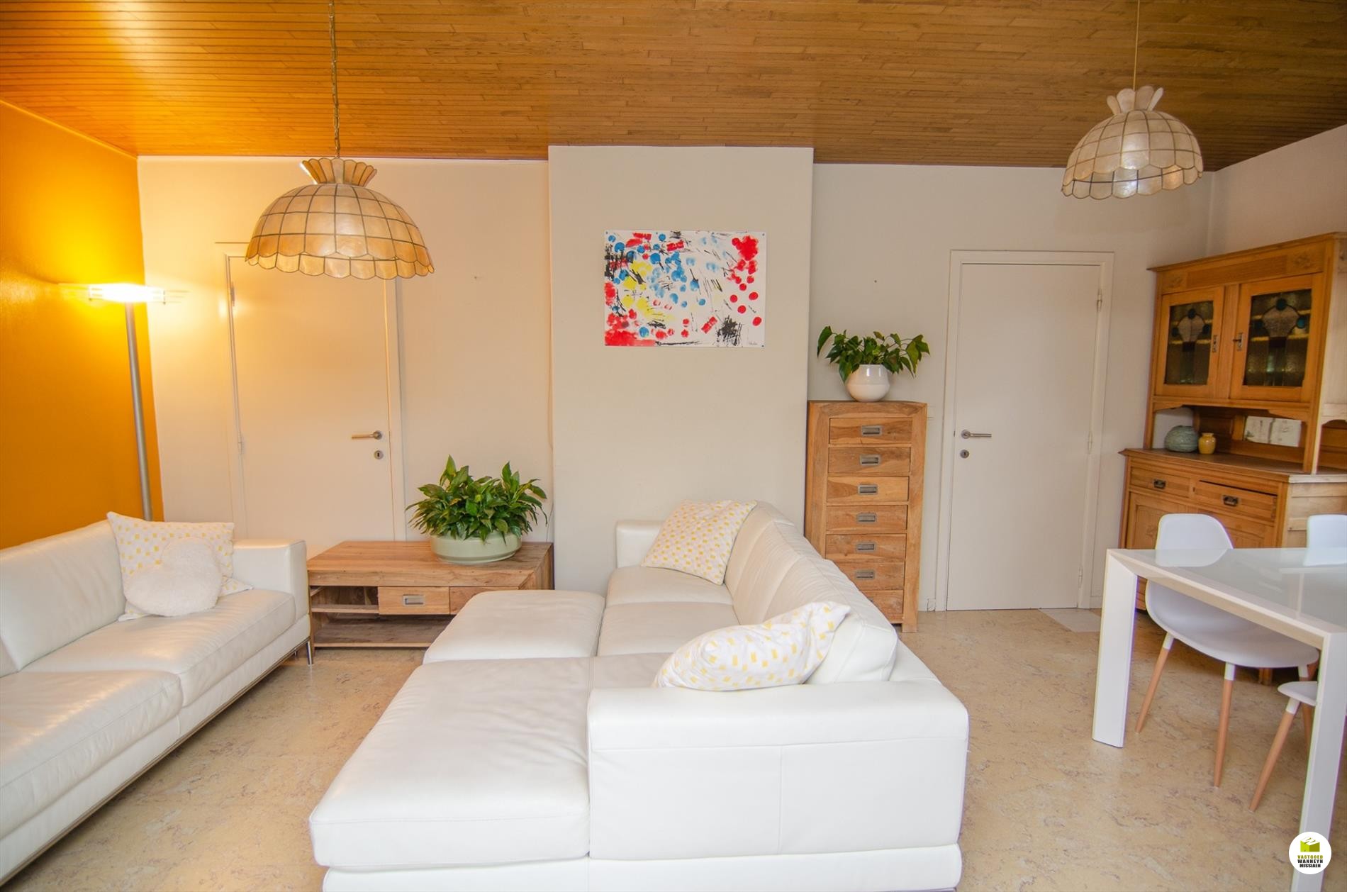 Inkomhal met toilet. Directe doorgang naar de garage van 60m2 via wasplaats. De woonkamer is sfeervol ingericht en voorzien van 2 schouwkanalen. Met een schuifraam is de tuin en het terras bereikbaar. Optimaal lichtinval door goede oriëntatie van het huis/tuin (zuidwest). De keuken met kookfornuis van Smeg bevindt zich tussen de woonkamer en het bureel/speelkamer. De kelder zit centraal en is een koele berging. Er is een 2de zithoek vooraan die kan dienen als praktijkruimte.