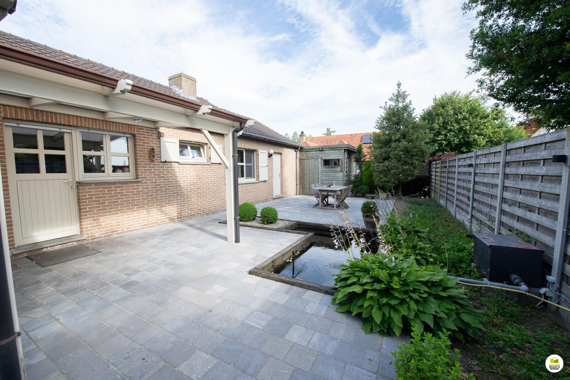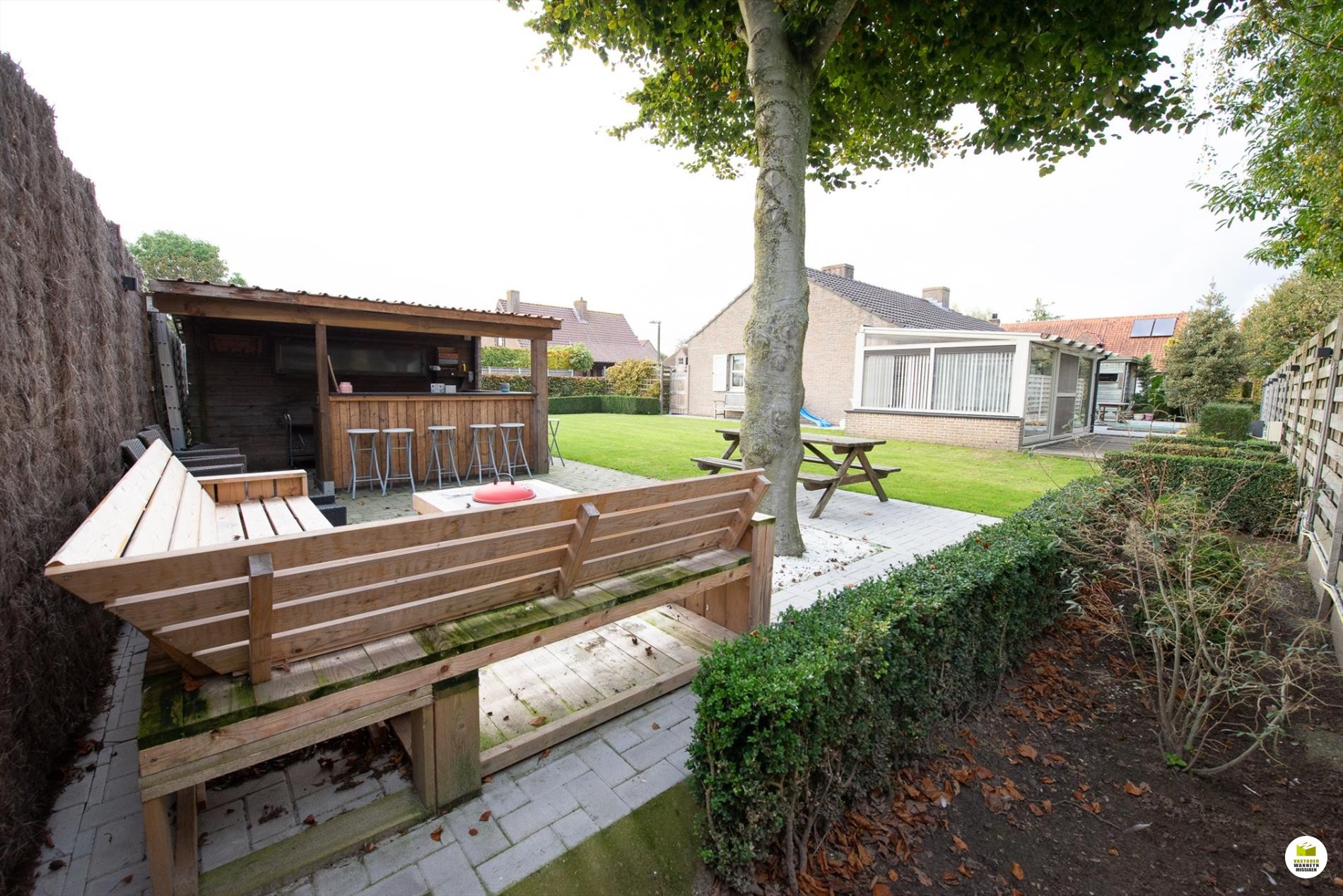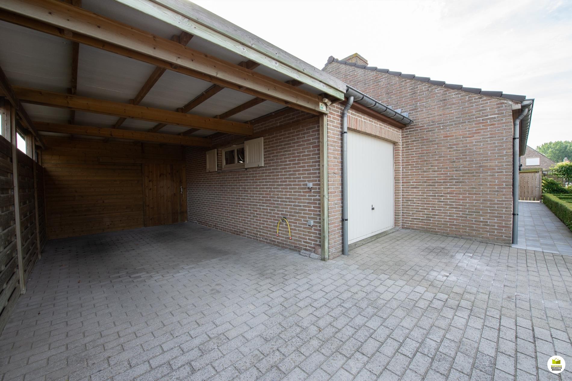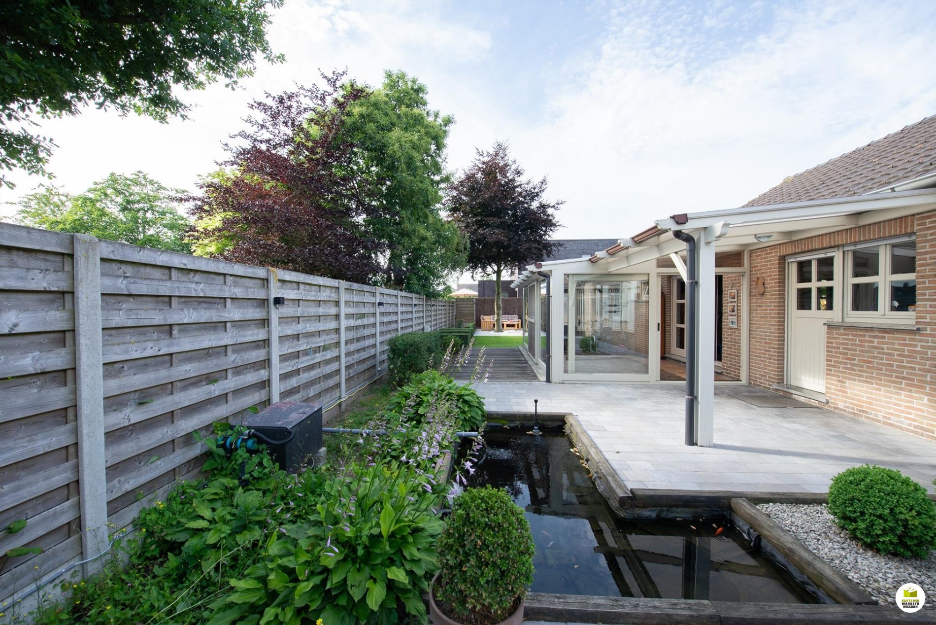 Inkomhal. De woonkamer (8mx 4m) is lichtrijk en voorzien van een houtkachel. Je kan de tuin zien vanuit je woonkamer. Aansluitend de veranda. De keuken is nieuw en is gericht naar het terras en de vijver. Er is ruimte om in de keuken te eten. De geïnstalleerde keuken is voorzien van een extra berging. De badkamer bevindt zich naast de 3 gelijkvloerse slaapkamers en is uitgerust met een ligbad, wc en lavabo. De slaapkamers meten elk 12m2, 9m2 en 9m2. De garage meet 5,5 x 3m en doet tevens dienst als wasplaats. Via de garage bereiken we de bergzolder. De zolder is ... geïsoleerd met 16cm rockwol en voorzien van een dampscherm. Er is een carport met aansluitend een fietsenberging. De tuin is sfeervol ingericht met een zomerbar en subtiele verlichting met een streepje muziek met verschillende boxen. Aansluitend is er een een extra tuinhuis met uitweg naar de straat. Gemakkelijk voor uw tuinafval, je kan bv. met een aanhangwagen op het terrein rijden. Het tuinhuis (12m2) is geïsoleerd en gevloerd. Grote parking voor 3 wagens, carport (met fietsenberging).