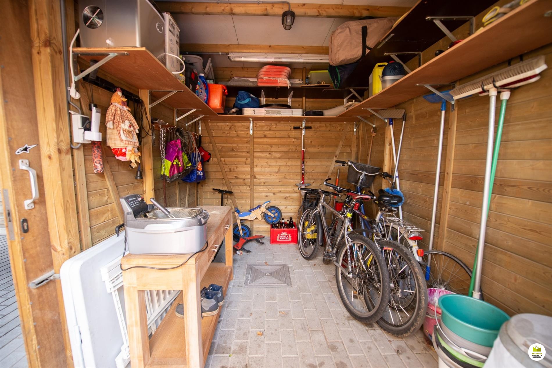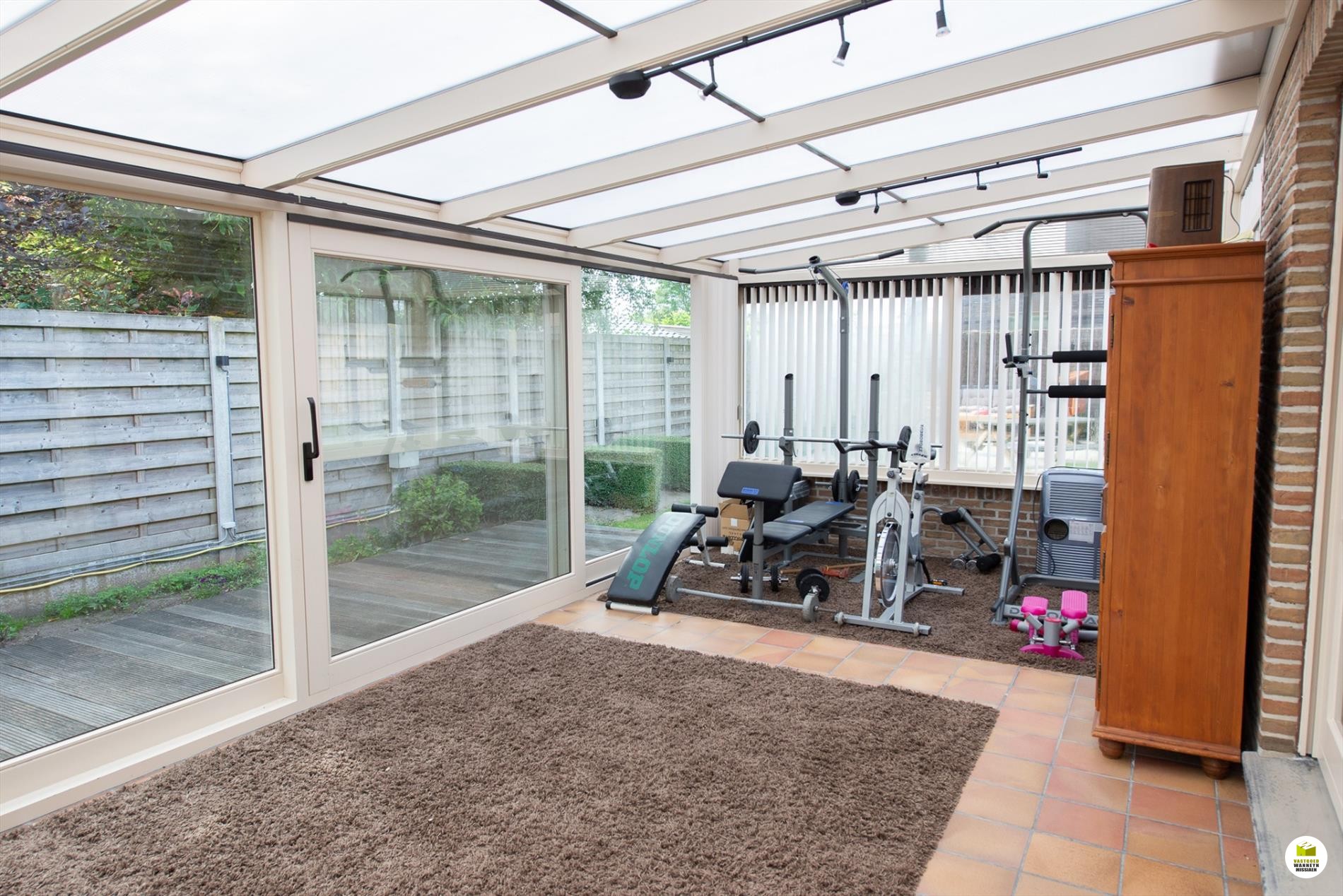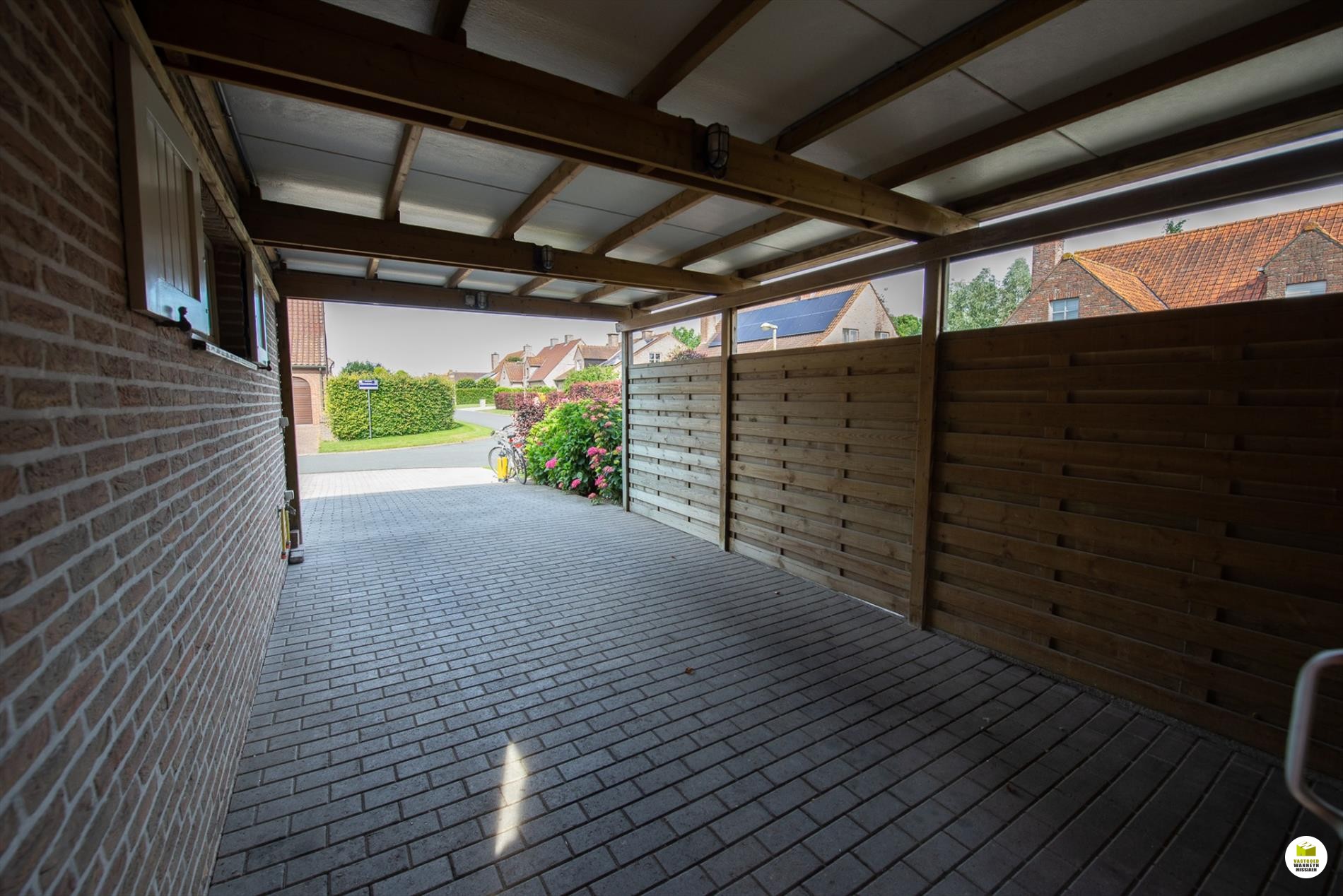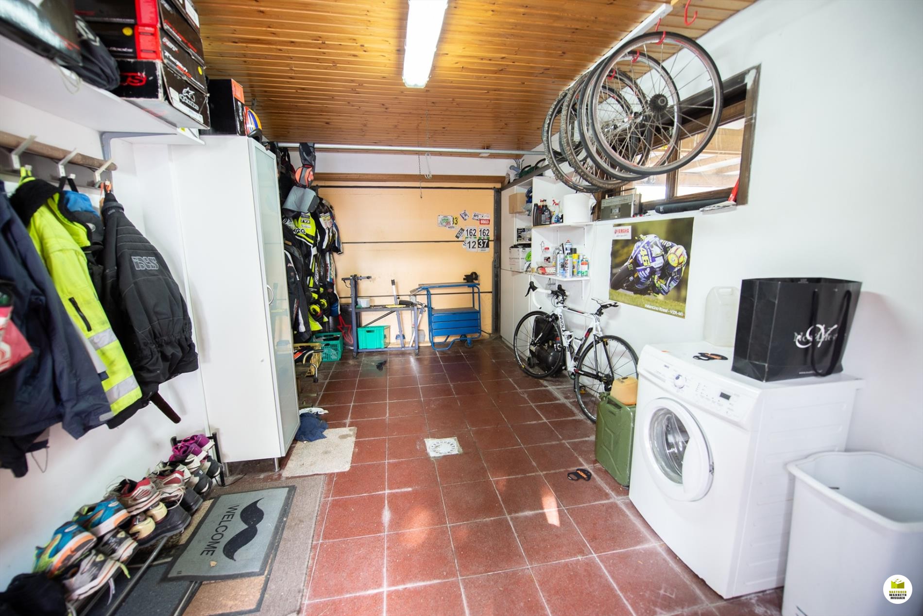 Inkomhal. De woonkamer (8mx 4m) is lichtrijk en voorzien van een houtkachel. Je kan de tuin zien vanuit je woonkamer. Aansluitend de veranda. De keuken is nieuw en is gericht naar het terras en de vijver. Er is ruimte om in de keuken te eten. De geïnstalleerde keuken is voorzien van een extra berging. De badkamer bevindt zich naast de 3 gelijkvloerse slaapkamers en is uitgerust met een ligbad, wc en lavabo. De slaapkamers meten elk 12m2, 9m2 en 9m2. De garage meet 5,5 x 3m en doet tevens dienst als wasplaats. Via de garage bereiken we de bergzolder. De zolder is ... geïsoleerd met 16cm rockwol en voorzien van een dampscherm. Er is een carport met aansluitend een fietsenberging. De tuin is sfeervol ingericht met een zomerbar en subtiele verlichting met een streepje muziek met verschillende boxen. Aansluitend is er een een extra tuinhuis met uitweg naar de straat. Gemakkelijk voor uw tuinafval, je kan bv. met een aanhangwagen op het terrein rijden. Het tuinhuis (12m2) is geïsoleerd en gevloerd. Grote parking voor 3 wagens, carport (met fietsenberging).