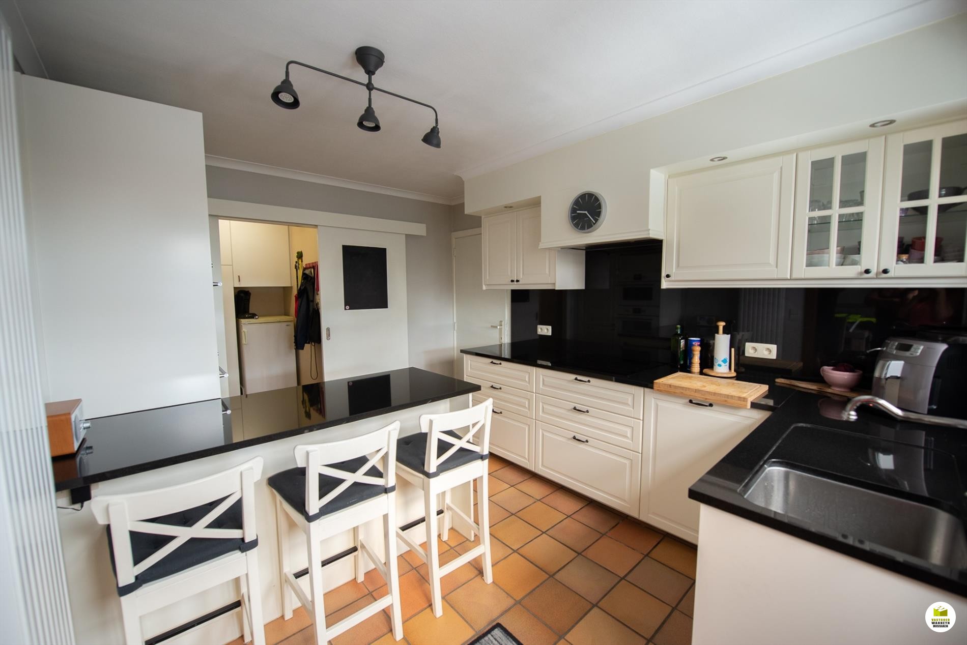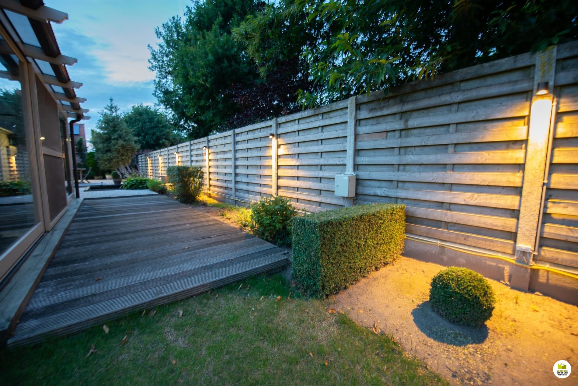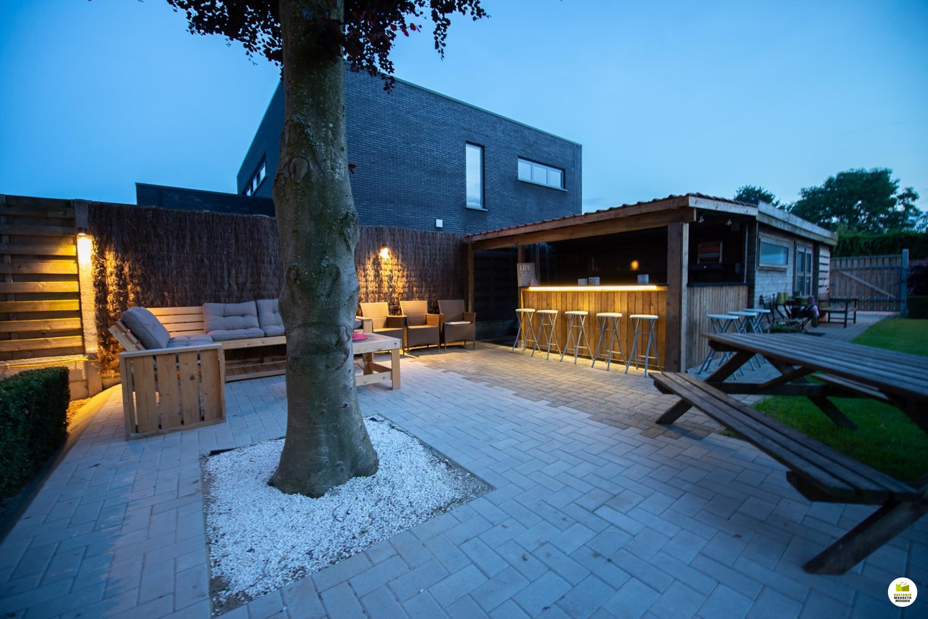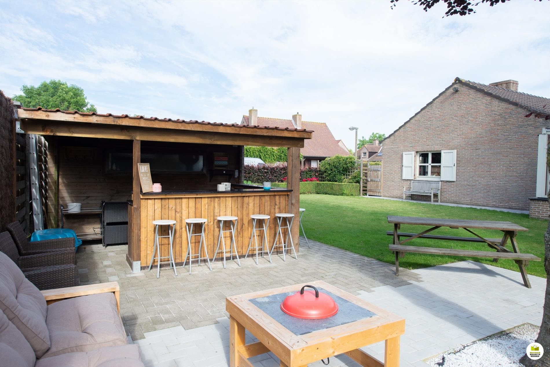 Inkomhal. De woonkamer (8mx 4m) is lichtrijk en voorzien van een houtkachel. Je kan de tuin zien vanuit je woonkamer. Aansluitend de veranda. De keuken is nieuw en is gericht naar het terras en de vijver. Er is ruimte om in de keuken te eten. De geïnstalleerde keuken is voorzien van een extra berging. De badkamer bevindt zich naast de 3 gelijkvloerse slaapkamers en is uitgerust met een ligbad, wc en lavabo. De slaapkamers meten elk 12m2, 9m2 en 9m2. De garage meet 5,5 x 3m en doet tevens dienst als wasplaats. Via de garage bereiken we de bergzolder. De zolder is ... geïsoleerd met 16cm rockwol en voorzien van een dampscherm. Er is een carport met aansluitend een fietsenberging. De tuin is sfeervol ingericht met een zomerbar en subtiele verlichting met een streepje muziek met verschillende boxen. Aansluitend is er een een extra tuinhuis met uitweg naar de straat. Gemakkelijk voor uw tuinafval, je kan bv. met een aanhangwagen op het terrein rijden. Het tuinhuis (12m2) is geïsoleerd en gevloerd. Grote parking voor 3 wagens, carport (met fietsenberging).