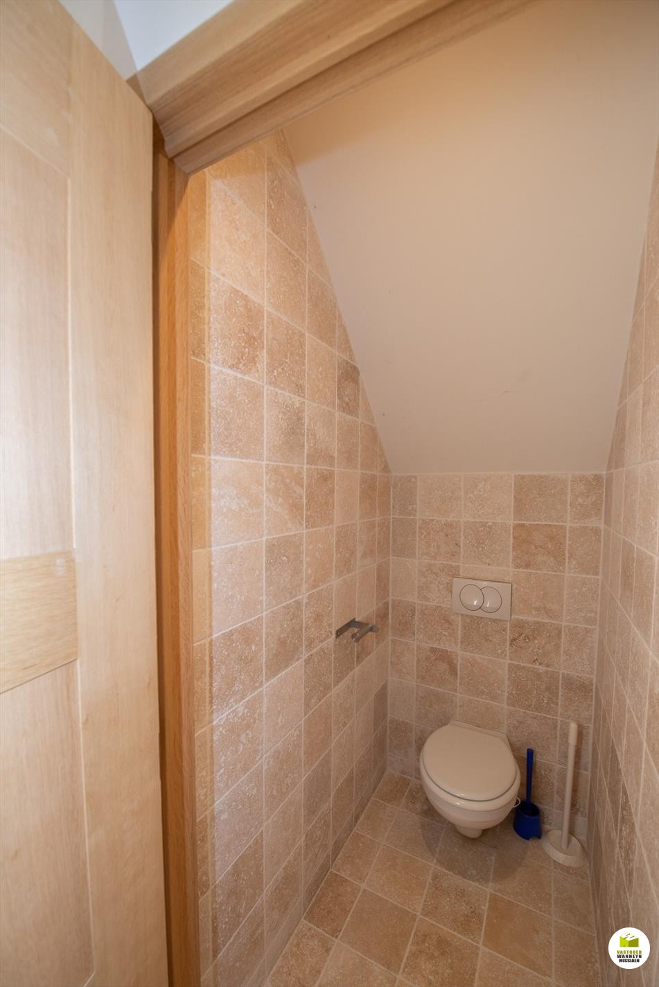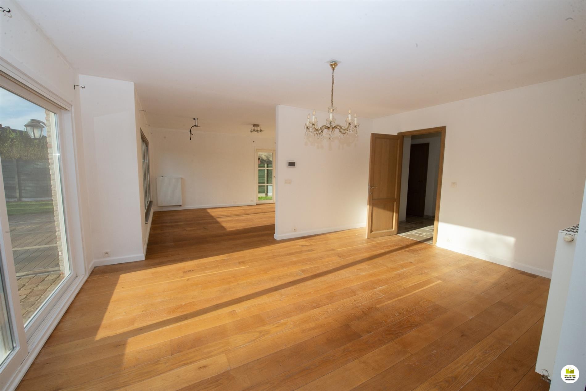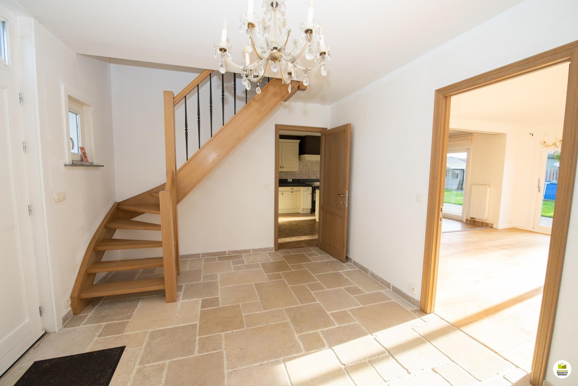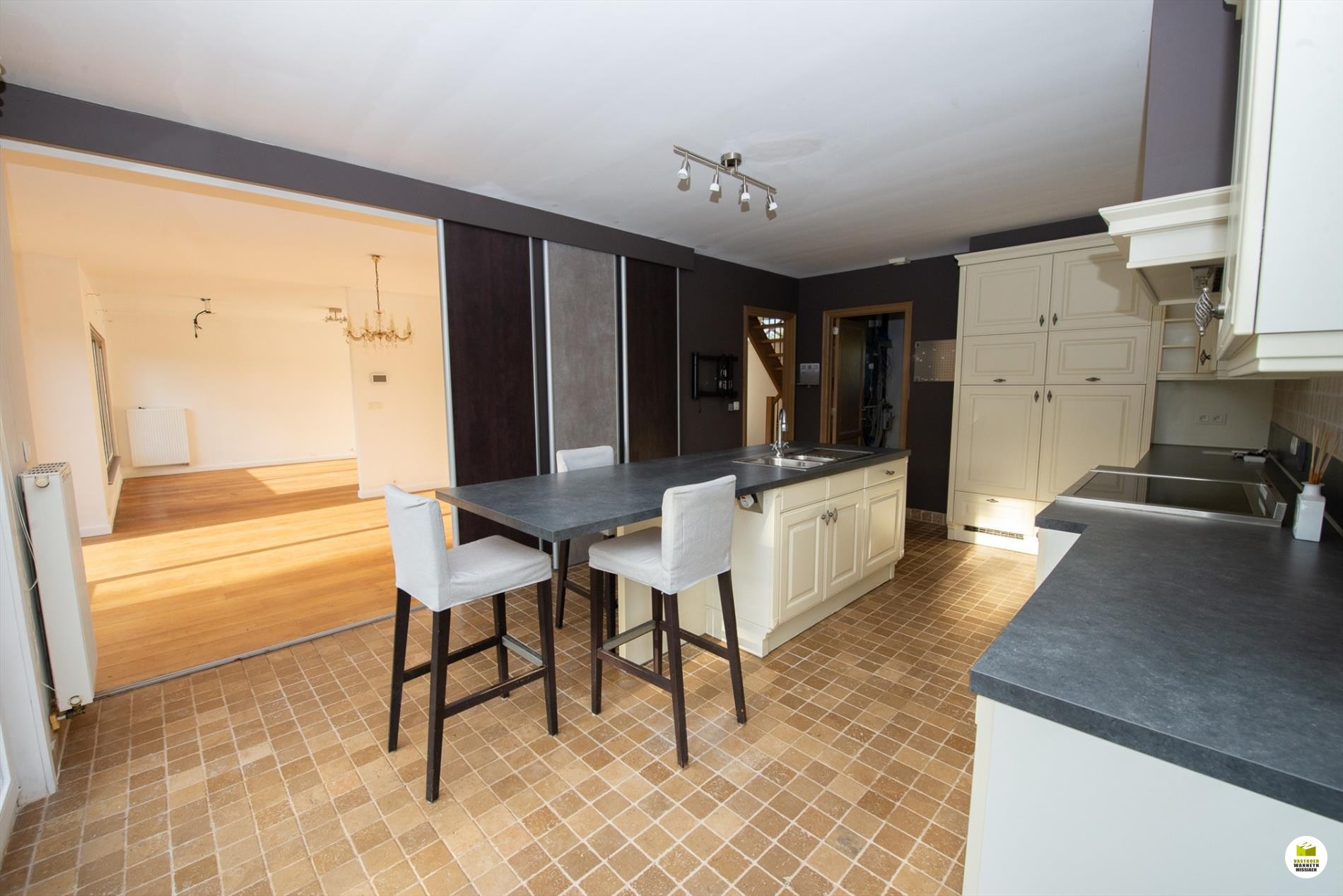 Royale inkomhal met stijlvolle trap met smeedijzeren trapspijlen, bourgondische tegelvloer, massieve eiken deuren, ingebouwde vestiairekast met schoenrek. De hal is heel ruim (mogelijks te benutten als wachtzaaltje) want door het gelijkvloers bureel (8,5m2) kan deze woning ideaal zijn voor iemand die een praktijk wilt vestigen. Praktisch gezien is dat mogelijk doordat er een apart gastentoilet is (hangtoilet Geberit). Het bureel is voorzien van massieve parket. Vanuit de hal is de woonkamer en de keuken bereikbaar. De keuken is voorzien met een eiland, heel ruim en luxueus ingericht met o.a een grote Smeg oven met inductiekookplaat, ingebouwde dampkamp en frigo, plaats voor ... mircogolfoven, de hoekkasten zijn voorzien van meedraaiende legplanken, bijzonder veel stopcontacten en een groot werkblad. Aansluitend is er een ruime berging die tevens dienstdoet als wasplaats en technische ruimte. De eetplaats en de TVhoek zijn ook voorzien van een massieve parketvloer, er is een aardgasaansluiting voor een aardgashaard. Er is opvallend veel licht door de grote raampartijen en de zuid-oriëntatie. Via een schuifraam kunnen we vanuit de woonkamer naar de tuin, ook vanuit de keuken kan je naar het terras gaan.