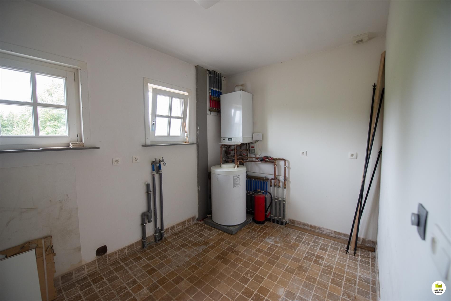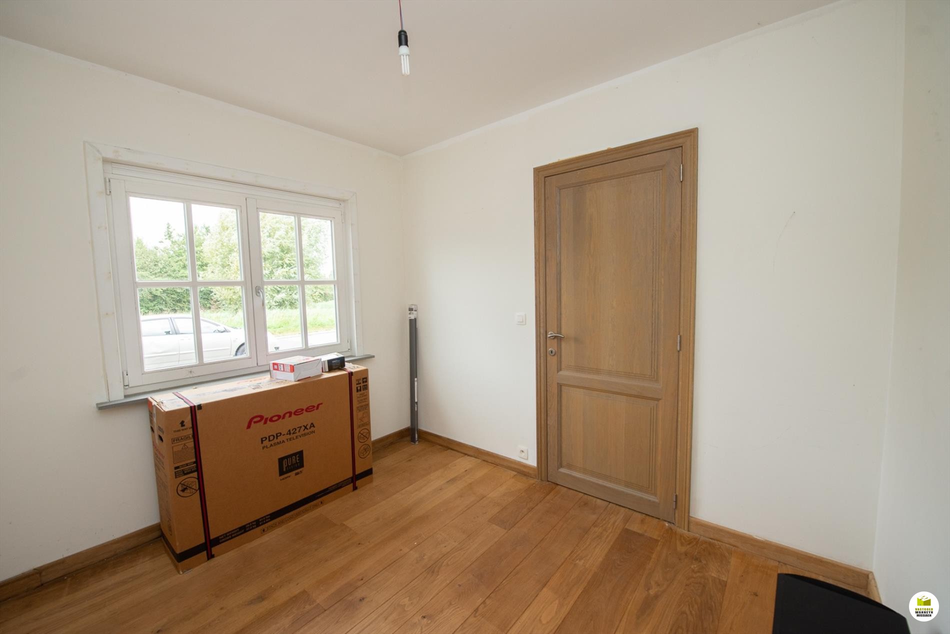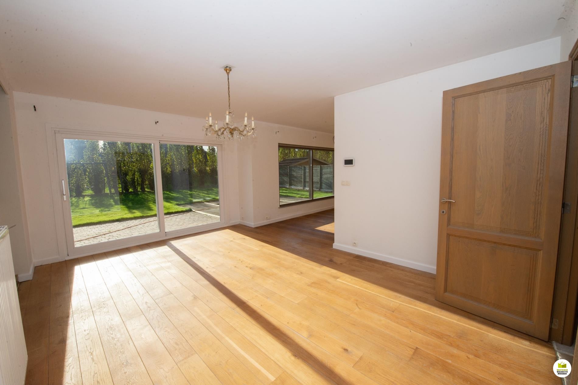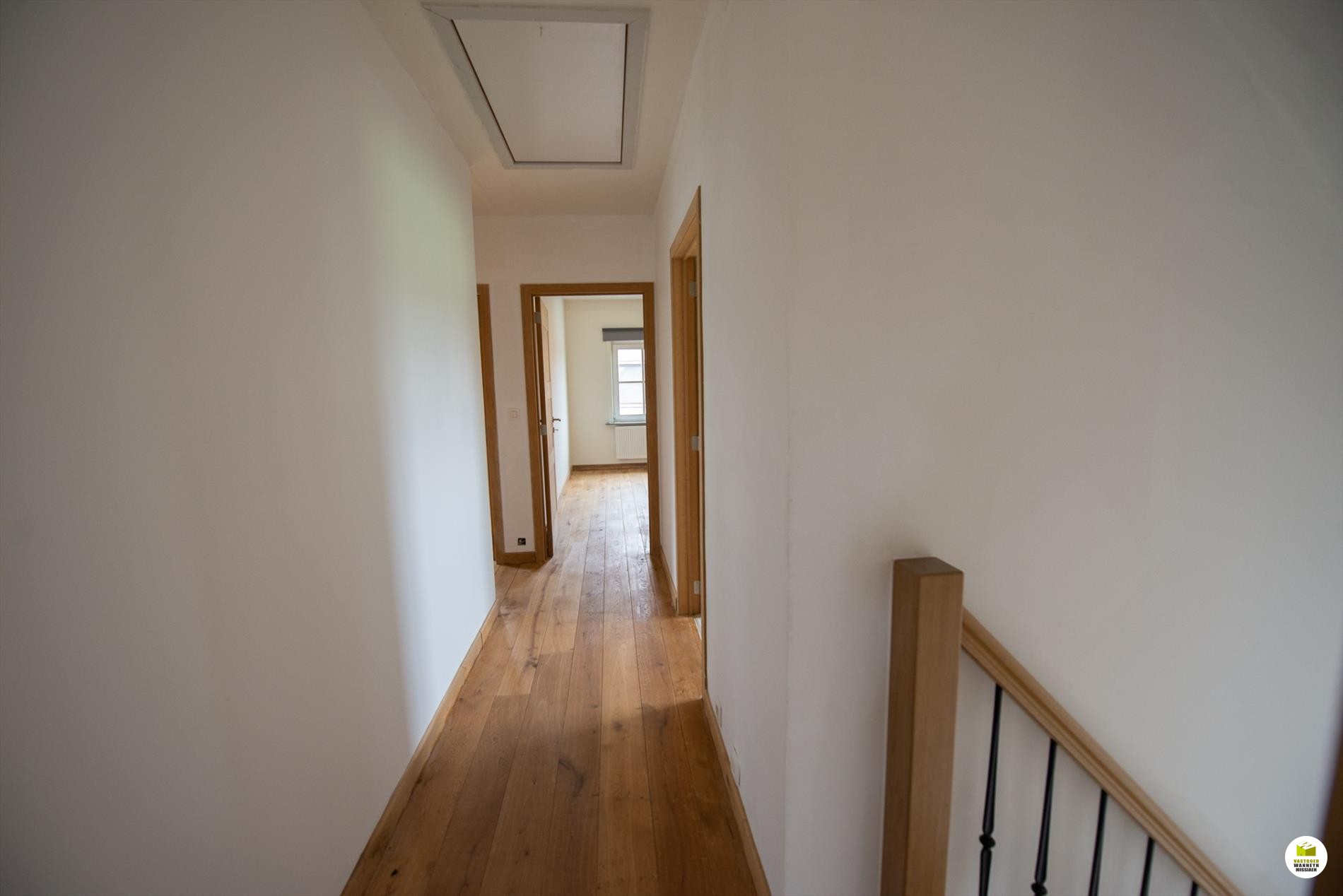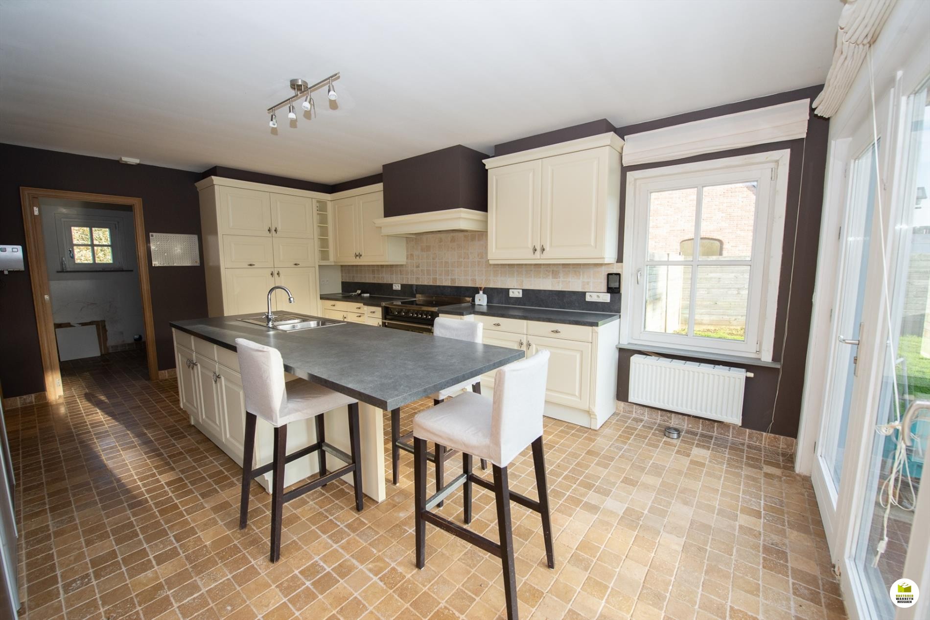 Royale inkomhal met stijlvolle trap met smeedijzeren trapspijlen, bourgondische tegelvloer, massieve eiken deuren, ingebouwde vestiairekast met schoenrek. De hal is heel ruim (mogelijks te benutten als wachtzaaltje) want door het gelijkvloers bureel (8,5m2) kan deze woning ideaal zijn voor iemand die een praktijk wilt vestigen. Praktisch gezien is dat mogelijk doordat er een apart gastentoilet is (hangtoilet Geberit). Het bureel is voorzien van massieve parket. Vanuit de hal is de woonkamer en de keuken bereikbaar. De keuken is voorzien met een eiland, heel ruim en luxueus ingericht met o.a een grote Smeg oven met inductiekookplaat, ingebouwde dampkamp en frigo, plaats voor ... mircogolfoven, de hoekkasten zijn voorzien van meedraaiende legplanken, bijzonder veel stopcontacten en een groot werkblad. Aansluitend is er een ruime berging die tevens dienstdoet als wasplaats en technische ruimte. De eetplaats en de TVhoek zijn ook voorzien van een massieve parketvloer, er is een aardgasaansluiting voor een aardgashaard. Er is opvallend veel licht door de grote raampartijen en de zuid-oriëntatie. Via een schuifraam kunnen we vanuit de woonkamer naar de tuin, ook vanuit de keuken kan je naar het terras gaan.