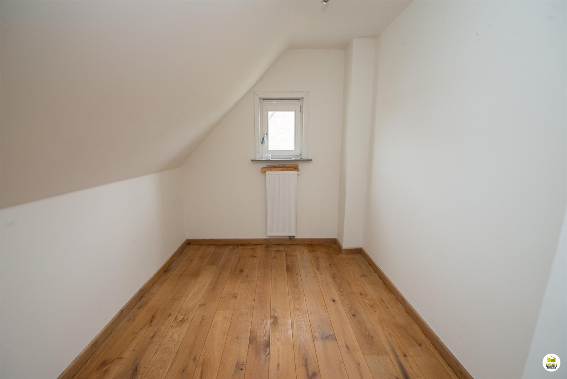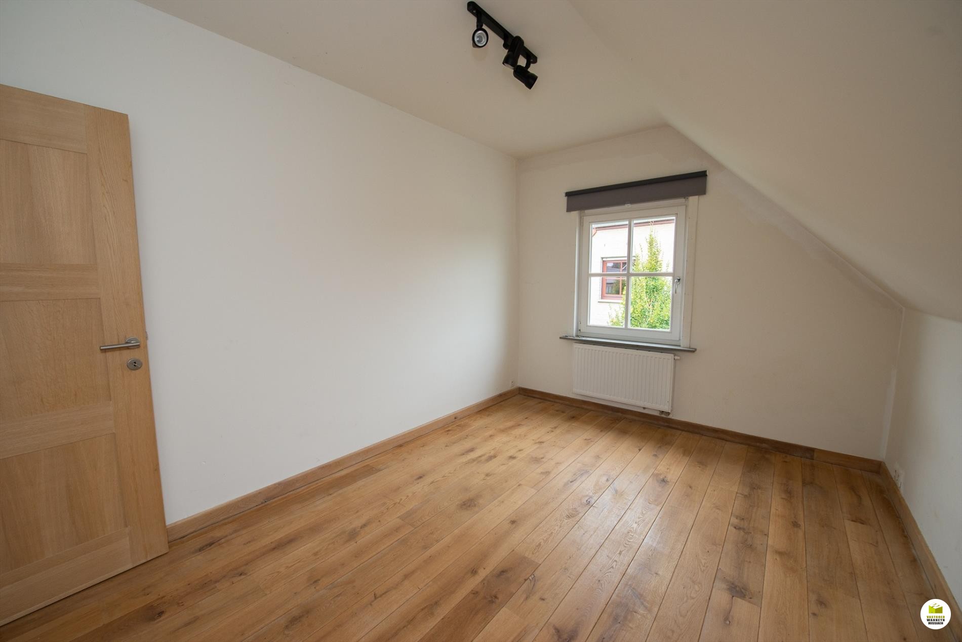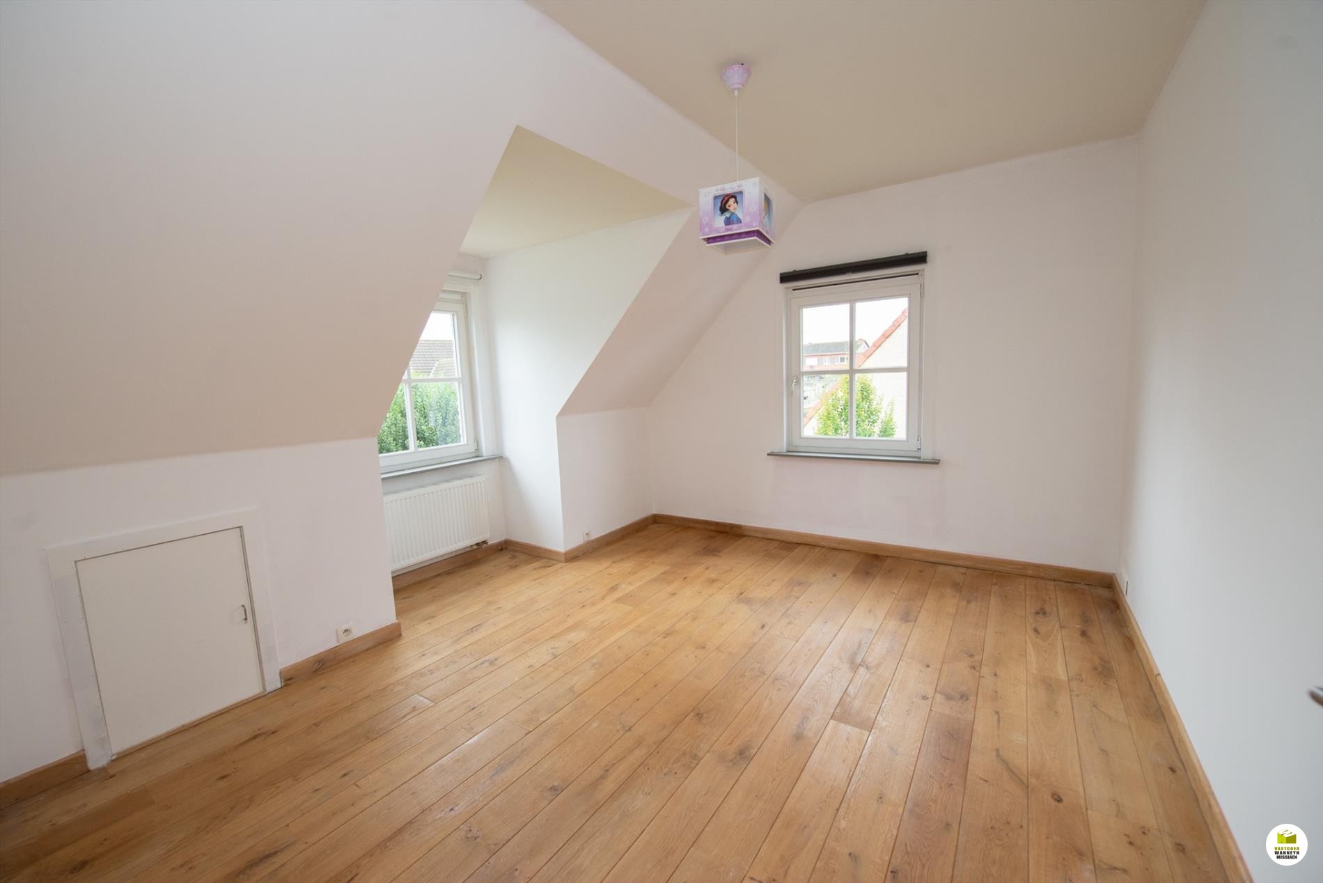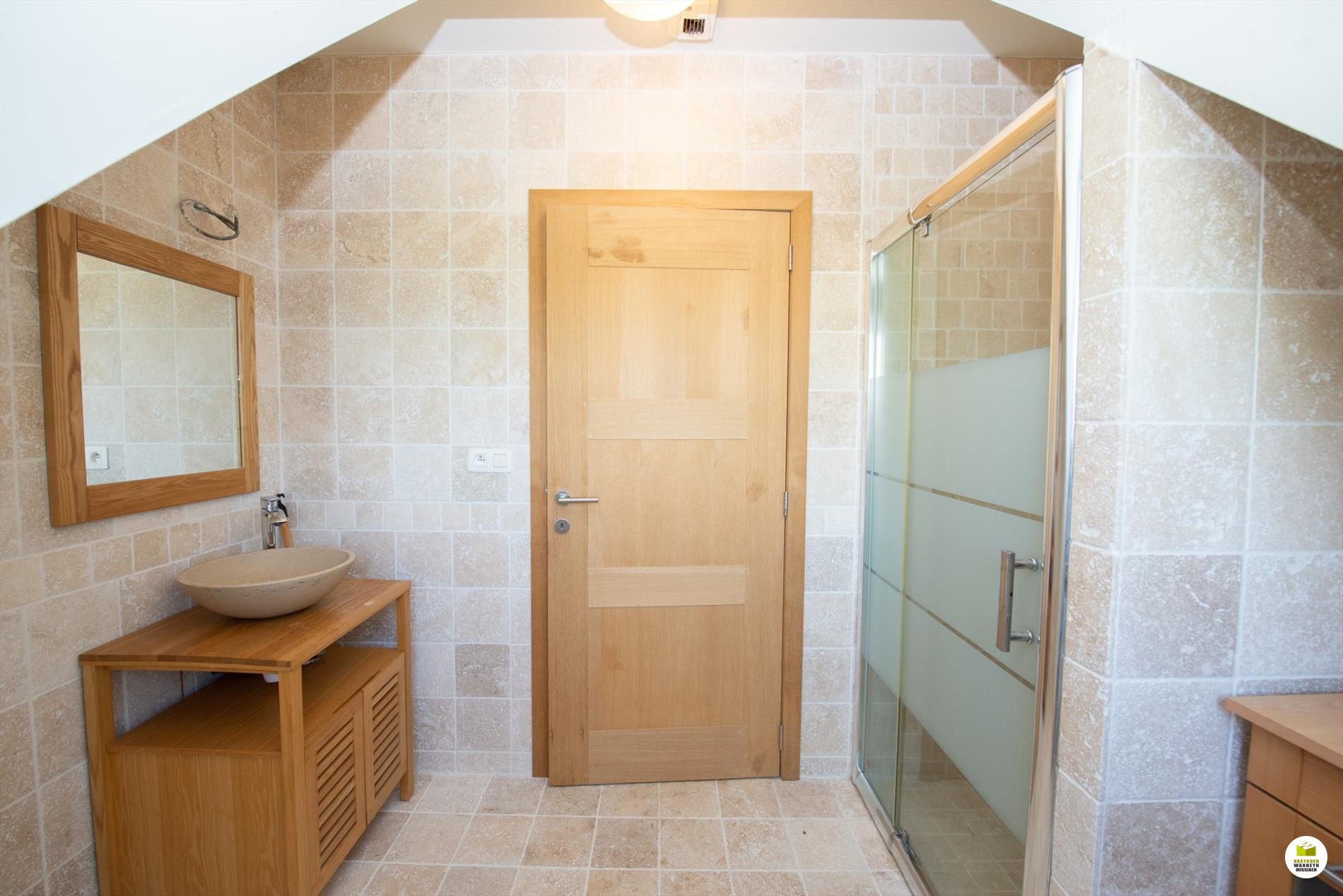 Royale inkomhal met stijlvolle trap met smeedijzeren trapspijlen, bourgondische tegelvloer, massieve eiken deuren, ingebouwde vestiairekast met schoenrek. De hal is heel ruim (mogelijks te benutten als wachtzaaltje) want door het gelijkvloers bureel (8,5m2) kan deze woning ideaal zijn voor iemand die een praktijk wilt vestigen. Praktisch gezien is dat mogelijk doordat er een apart gastentoilet is (hangtoilet Geberit). Het bureel is voorzien van massieve parket. Vanuit de hal is de woonkamer en de keuken bereikbaar. De keuken is voorzien met een eiland, heel ruim en luxueus ingericht met o.a een grote Smeg oven met inductiekookplaat, ingebouwde dampkamp en frigo, plaats voor ... mircogolfoven, de hoekkasten zijn voorzien van meedraaiende legplanken, bijzonder veel stopcontacten en een groot werkblad. Aansluitend is er een ruime berging die tevens dienstdoet als wasplaats en technische ruimte. De eetplaats en de TVhoek zijn ook voorzien van een massieve parketvloer, er is een aardgasaansluiting voor een aardgashaard. Er is opvallend veel licht door de grote raampartijen en de zuid-oriëntatie. Via een schuifraam kunnen we vanuit de woonkamer naar de tuin, ook vanuit de keuken kan je naar het terras gaan.